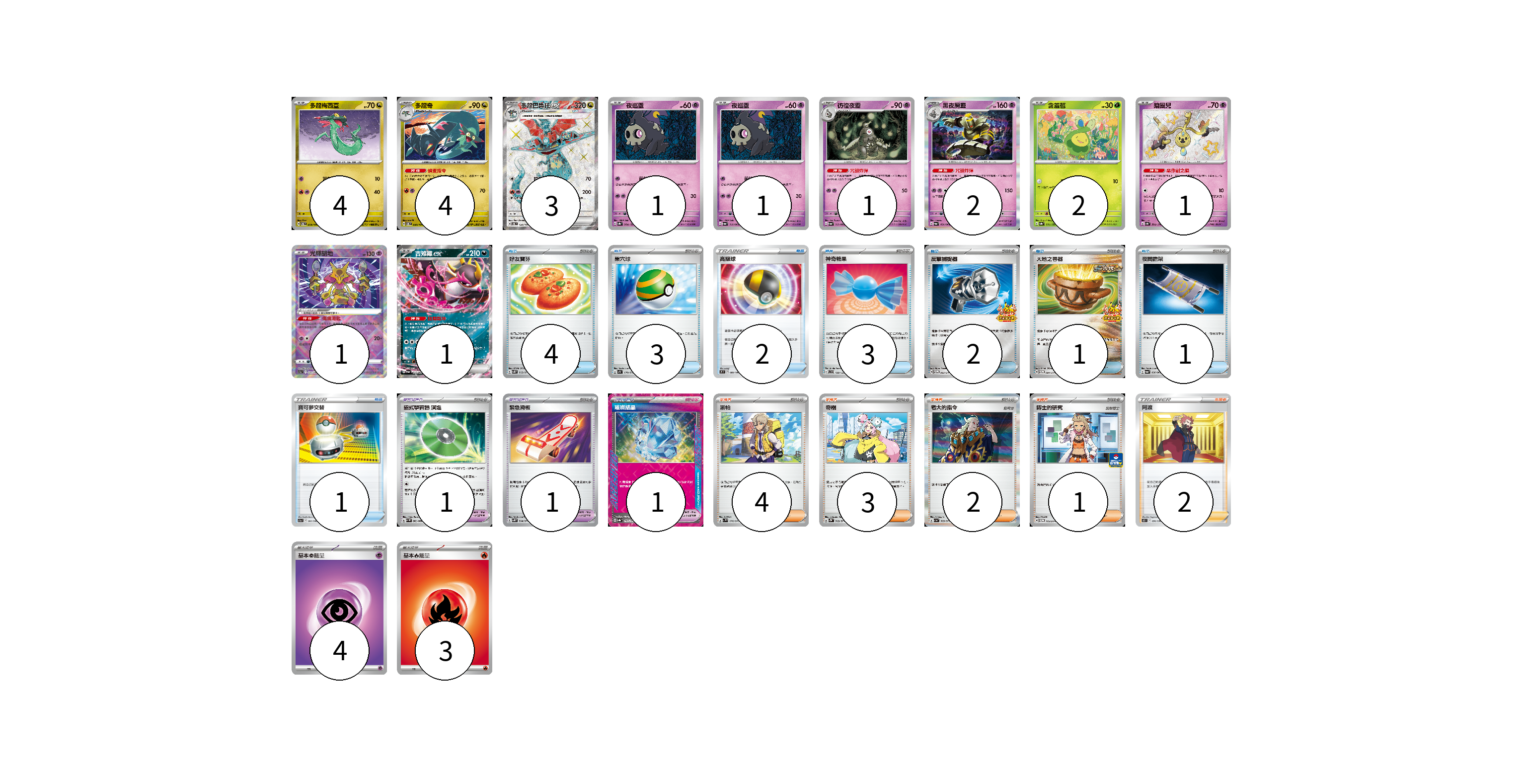 牌組構築方案 以此牌組為基礎新構築牌組 顯示卡面 顯示列表 寶可夢卡(21) 4 4 3 1 1 1 2 2 1 1 1 寶可夢道具(3) 1 1 1 物品卡(17) 4 3 2 3 2 1 1 1 支援者卡(12) 4 3 2 1 2 能量卡(7) 4 3 寶可夢卡(21) 卡牌名稱 張數 卡牌名稱 張數 多龍梅西亞 SV6 079/101 04 多龍奇 SV6 080/101 04 多龍巴魯托ex SV6 120/101 03 夜巡靈 SV8a 064/187 01 夜巡靈 SV6a 018/064 01 彷徨夜靈 SV6a 019/064 01 黑夜魔靈 SV6a 020/064 02 含羞苞 SV8a 001/187 02 鑰圈兒 SV4a 264/190 01 光輝胡地 S11a 031/068 01 吉雉雞ex SV6a 038/064 01 寶可夢道具(3) 卡牌名稱 張數 卡牌名稱 張數 招式學習器 演進 SV4M 063/066 01 緊急滑板 SV5K 064/071 01 璀璨結晶 SV8a 152/187 01 物品卡(17) 卡牌名稱 張數 卡牌名稱 張數 好友寶芬 SV5K 063/071 04 巢穴球 SV1S 070/078 03 高級球 S9 089/100 02 神奇糖果 SVD 120/139 03 反擊捕捉器 SV-P 083/SV-P 02 大地之容器 SV-P 084/SV-P 01 夜間擔架 SV6a 056/064 01 寶可夢交替 S11a 061/068 01 支援者卡(12) 卡牌名稱 張數 卡牌名稱 張數 派帕 SV1V 076/078 04 奇樹 SV2D 069/071 03 老大的指令 SV1a 069/073 02 博士的研究 SV-P 113/SV-P 01 阿渡 S12 096/098 02 能量卡(7) 卡牌名稱 張數 卡牌名稱 張數 基本超能量 sv-p PSY 04 基本火能量 sv-p FIR 03 以此牌組為基礎新構築牌組 牌組編碼 ZTBJfB-OkoXeX-ajvJNG copy 列印牌組單 牌組編碼已複製 分享至SNS
