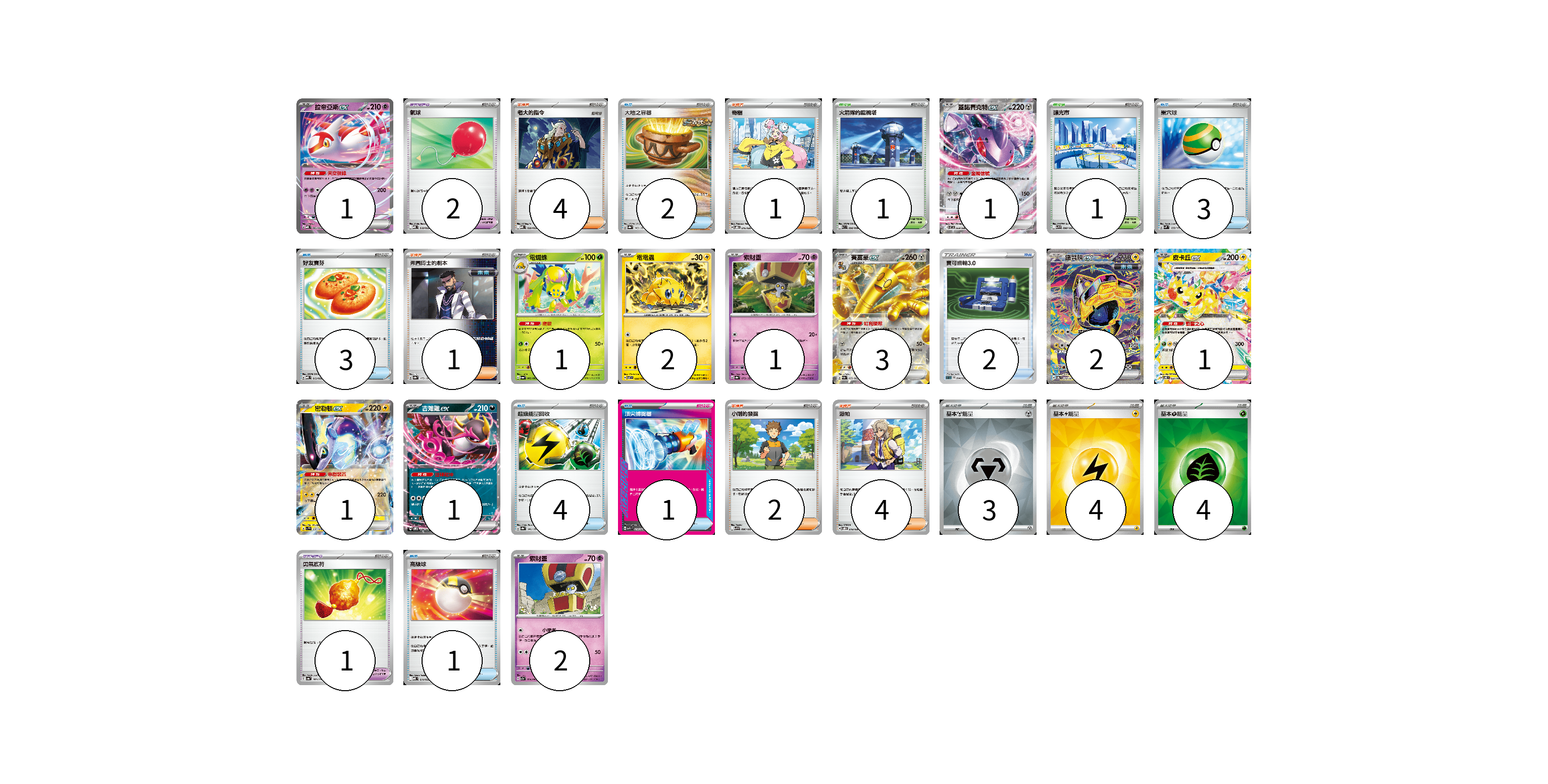 牌組構築方案 以此牌組為基礎新構築牌組 顯示卡面 顯示列表 寶可夢卡(16) 1 1 1 2 1 3 2 1 1 1 2 寶可夢道具(3) 2 1 物品卡(16) 2 3 3 2 4 1 1 支援者卡(12) 4 1 1 2 4 競技場卡(2) 1 1 能量卡(11) 3 4 4 寶可夢卡(16) 卡牌名稱 張數 卡牌名稱 張數 拉帝亞斯ex MBD 003/022 01 蓋諾賽克特ex SV11B 069/086 01 電蜘蛛 SV6a 002/064 01 電電蟲 SV7 032/102 02 索財靈 SV8a 073/187 01 賽富豪ex SV3a 050/062 03 鐵臂膀ex SV8a 210/187 02 皮卡丘ex SV8 033/106 01 密勒頓ex SV1V 037/078 01 吉雉雞ex SVOM 009/021 01 索財靈 SV7a 024/064 02 寶可夢道具(3) 卡牌名稱 張數 卡牌名稱 張數 氣球 MBD 018/022 02 勇氣護符 SV4a 169/190 01 物品卡(16) 卡牌名稱 張數 卡牌名稱 張數 大地之容器 SV8a 143/187 02 巢穴球 SVM 133/175 03 好友寶芬 MBD 013/022 03 寶可齒輪3.0 SLD 014/020 02 超級能量回收 SV8a 141/187 04 頂尖捕捉器 MBG 014/022 01 高級球 MBD 014/022 01 支援者卡(12) 卡牌名稱 張數 卡牌名稱 張數 老大的指令 MBD 020/022 04 奇樹 SVOD 016/020 01 弗圖博士的劇本 SV8a 175/187 01 小剛的發掘 SV9 096/100 02 派帕 SVOD 018/020 04 競技場卡(2) 卡牌名稱 張數 卡牌名稱 張數 火箭隊的監視塔 SV10 096/098 01 釀光市 SV9 098/100 01 能量卡(11) 卡牌名稱 張數 卡牌名稱 張數 基本【鋼】能量 SVOD MET 03 基本【雷】能量 SVM LIG 04 基本【草】能量 SVM GRA 04 以此牌組為基礎新構築牌組 牌組編碼 ZWyIuA-SPZGki-yJIGCF copy 列印牌組單 牌組編碼已複製 分享至SNS