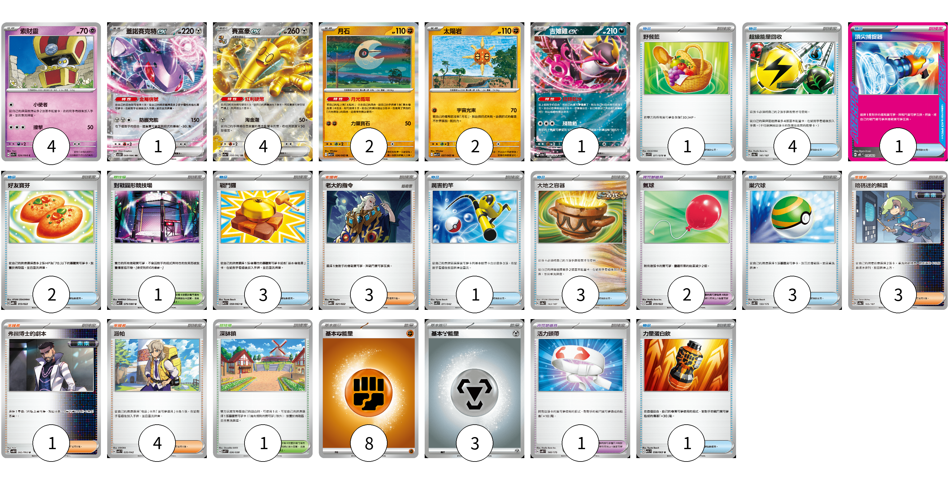 牌組構築方案 以此牌組為基礎新構築牌組 顯示卡面 顯示列表 寶可夢卡(14) 4 1 4 2 2 1 寶可夢道具(3) 2 1 物品卡(19) 1 4 1 2 3 1 3 3 1 支援者卡(11) 3 3 1 4 競技場卡(2) 1 1 能量卡(11) 8 3 寶可夢卡(14) 卡牌名稱 張數 卡牌名稱 張數 索財靈 SV7a 024/064 04 蓋諾賽克特ex SV11B 069/086 01 賽富豪ex SV3a 050/062 04 月石 M1L 026/063 02 太陽岩 M1L 027/063 02 吉雉雞ex SV6a 038/064 01 寶可夢道具(3) 卡牌名稱 張數 卡牌名稱 張數 氣球 MBG 019/022 02 活力頭帶 SVM 140/175 01 物品卡(19) 卡牌名稱 張數 卡牌名稱 張數 野餐籃 SV1V 071/078 01 超級能量回收 SV8a 141/187 04 頂尖捕捉器 MBG 014/022 01 好友寶芬 MBD 013/022 02 戰鬥鑼 M1L 059/063 03 厲害釣竿 SVK 011/042 01 大地之容器 SV8a 143/187 03 巢穴球 SVM 133/175 03 力量蛋白飲 M1L 058/063 01 支援者卡(11) 卡牌名稱 張數 卡牌名稱 張數 老大的指令 MBG 021/022 03 暗碼迷的解讀 SV8a 165/187 03 弗圖博士的劇本 SV4M 065/066 01 派帕 SVK 035/042 04 競技場卡(2) 卡牌名稱 張數 卡牌名稱 張數 對戰圓形競技場 M2 079/080 01 深缽鎮 SVF 036/038 01 能量卡(11) 卡牌名稱 張數 卡牌名稱 張數 基本【鬥】能量 M-P FIG 08 基本【鋼】能量 M-P MET 03 以此牌組為基礎新構築牌組 牌組編碼 ZZtOBv-gcKICP-QgbTkk copy 列印牌組單 牌組編碼已複製 分享至SNS