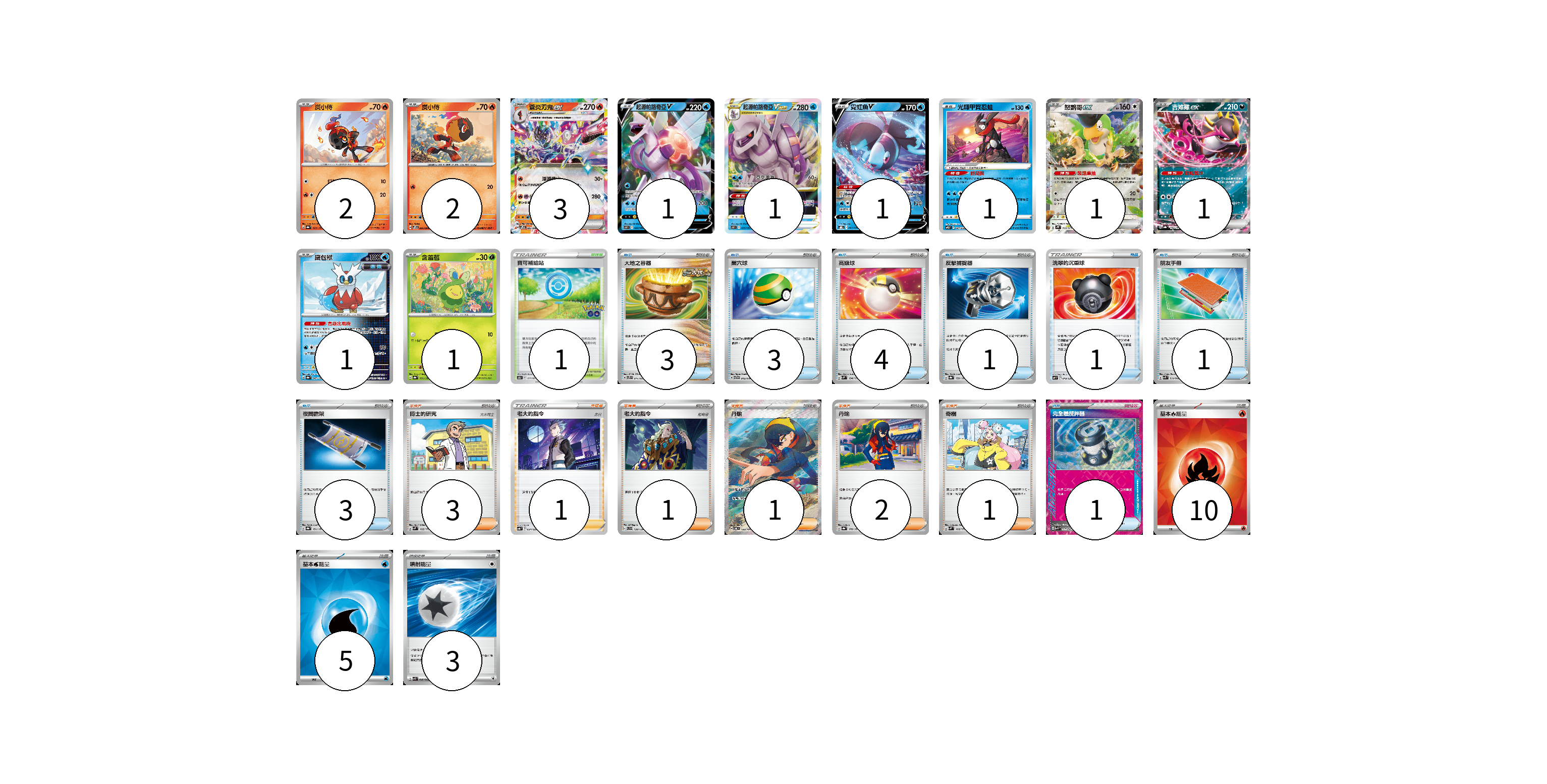 牌組構築方案 以此牌組為基礎新構築牌組 顯示卡面 顯示列表 寶可夢卡(15) 2 2 3 1 1 1 1 1 1 1 1 物品卡(17) 3 3 4 1 1 1 3 1 支援者卡(9) 3 1 1 1 2 1 競技場卡(1) 1 能量卡(18) 10 5 3 寶可夢卡(15) 卡牌名稱 張數 卡牌名稱 張數 炭小侍 SV8a 023/187 02 炭小侍 SVPS 005/008 02 蒼炎刃鬼ex SVPS 006/008 03 起源帕路奇亞V S10P 022/067 01 起源帕路奇亞VSTAR S10P 023/067 01 霓虹魚V SVHM 001/022 01 光輝甲賀忍蛙 SVTS 001/022 01 怒鸚哥ex SV2P 065/071 01 吉雉雞ex SV8a 104/187 01 鐵包袱 SV8a 047/187 01 含羞苞 SV8a 001/187 01 物品卡(17) 卡牌名稱 張數 卡牌名稱 張數 大地之容器 SVTS 011/022 03 巢穴球 SVTG 012/019 03 高級球 SVM 134/175 04 反擊捕捉器 SV8a 139/187 01 洗翠的沉重球 SVF 019/038 01 朋友手冊 SVK 014/042 01 夜間擔架 SV8a 151/187 03 完全體攪拌器 SVK 017/042 01 支援者卡(9) 卡牌名稱 張數 卡牌名稱 張數 博士的研究 SVM 162/175 03 老大的指令(赤日) SVB 024/028 01 老大的指令(魁奇思) SVD 138/139 01 丹瑜 SV6 123/101 01 丹瑜 SV8a 170/187 02 奇樹 SVM 160/175 01 競技場卡(1) 卡牌名稱 張數 卡牌名稱 張數 寶可補給站 S10b 071/071 01 能量卡(18) 卡牌名稱 張數 卡牌名稱 張數 基本【火】能量 SVK FIR 10 基本【水】能量 SVK WAT 05 噴射能量 SVK 040/042 03 以此牌組為基礎新構築牌組 牌組編碼 ZcgFby-MOUdTq-tvDisG copy 列印牌組單 牌組編碼已複製 分享至SNS
