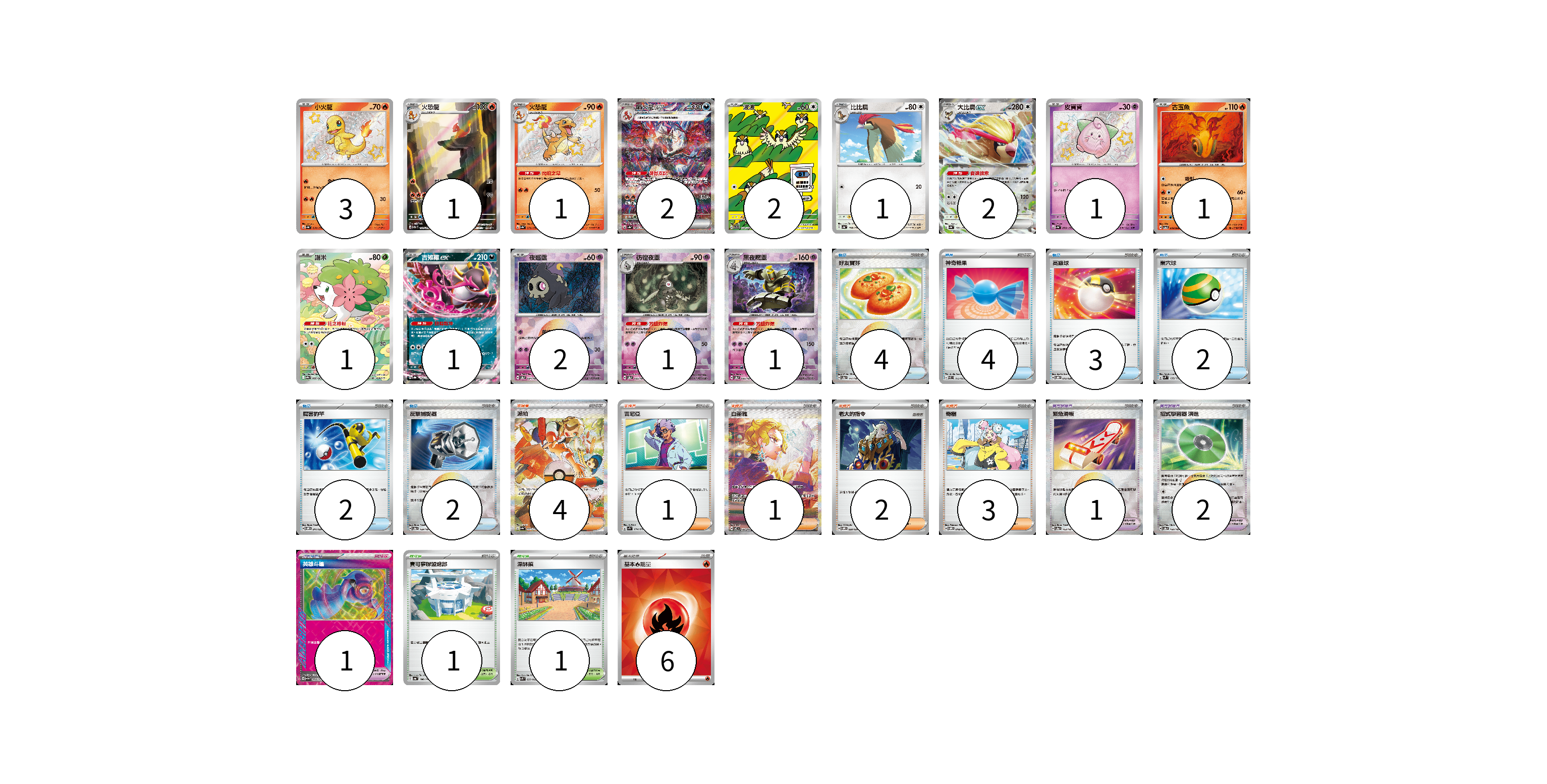 牌組構築方案 以此牌組為基礎新構築牌組 顯示卡面 顯示列表 寶可夢卡(20) 3 1 1 2 2 1 2 1 1 1 1 2 1 1 寶可夢道具(4) 1 2 1 物品卡(17) 4 4 3 2 2 2 支援者卡(11) 4 1 1 2 3 競技場卡(2) 1 1 能量卡(6) 6 寶可夢卡(20) 卡牌名稱 張數 卡牌名稱 張數 小火龍 SV4a 210/190 03 火恐龍 SV2a 169/165 01 火恐龍 SV4a 211/190 01 噴火龍ex SV4a 349/190 02 波波 SV3 118/108 02 比比鳥 SV4a 138/190 01 大比鳥ex SV4a 139/190 02 皮寶寶 SV4a 255/190 01 古玉魚 SV5a 018/066 01 謝米 SV9a 066/063 01 吉雉雞ex SV8a 104/187 01 夜巡靈 SV8a 064/187 02 彷徨夜靈 SV8a 065/187 01 黑夜魔靈 SV8a 066/187 01 寶可夢道具(4) 卡牌名稱 張數 卡牌名稱 張數 緊急滑板 SV8a 153/187 01 招式學習器 演進 SV8a 160/187 02 英雄斗篷 SV5M 064/071 01 物品卡(17) 卡牌名稱 張數 卡牌名稱 張數 好友寶芬 SV8a 147/187 04 神奇糖果 SVEL 013/020 04 高級球 SVOD 012/020 03 巢穴球 SVM 133/175 02 厲害釣竿 SVOM 011/021 02 反擊捕捉器 SV8a 139/187 02 支援者卡(11) 卡牌名稱 張數 卡牌名稱 張數 派帕 SV4a 353/190 04 吉尼亞 SV1S 074/078 01 白蕾雅 SV7 132/102 01 老大的指令 SVOM 020/021 02 奇樹 SVOM 018/021 03 競技場卡(2) 卡牌名稱 張數 卡牌名稱 張數 寶可夢聯盟總部 SV4a 186/190 01 深缽鎮 SVK 039/042 01 能量卡(6) 卡牌名稱 張數 卡牌名稱 張數 基本【火】能量 SVK FIR 06 以此牌組為基礎新構築牌組 牌組編碼 ZffVFj-WrWRJu-jtDqeT copy 列印牌組單 牌組編碼已複製 分享至SNS
