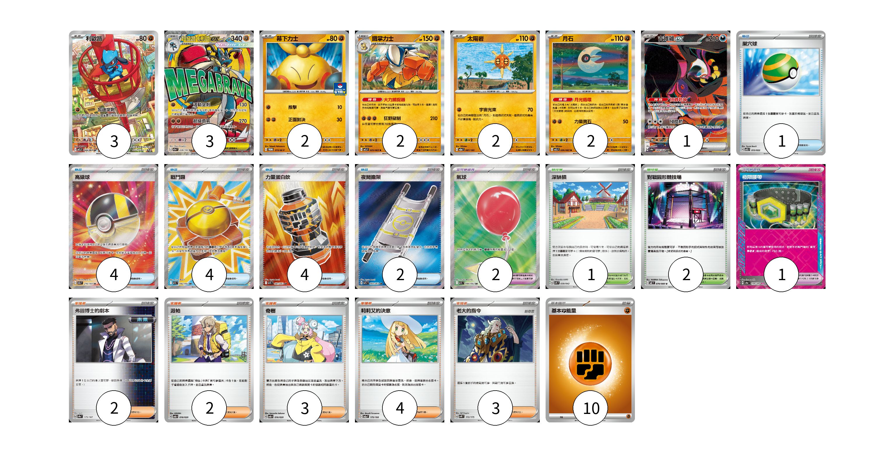 牌組構築方案 以此牌組為基礎新構築牌組 顯示卡面 顯示列表 寶可夢卡(15) 3 3 2 2 2 2 1 寶可夢道具(3) 2 1 物品卡(15) 1 4 4 4 2 支援者卡(14) 2 2 3 4 3 競技場卡(3) 1 2 能量卡(10) 10 寶可夢卡(15) 卡牌名稱 張數 卡牌名稱 張數 利歐路 M1L 068/063 03 超級路卡利歐ex M2a 228/193 03 幕下力士 M-P 015/M-P 02 鐵掌力士 M1L 025/063 02 太陽岩 M2a 087/193 02 月石 M1L 026/063 02 吉雉雞ex SV6a 089/064 01 寶可夢道具(3) 卡牌名稱 張數 卡牌名稱 張數 氣球 M1L 084/063 02 極限腰帶 SV8a 159/187 01 物品卡(15) 卡牌名稱 張數 卡牌名稱 張數 巢穴球 SVTS 013/022 01 高級球 M2a 216/193 04 戰鬥鑼 M1L 082/063 04 力量蛋白飲 M1L 081/063 04 夜間擔架 M1L 083/063 02 支援者卡(14) 卡牌名稱 張數 卡牌名稱 張數 弗圖博士的劇本 SV8a 175/187 02 派帕 SVOD 018/020 02 奇樹 SVOD 016/020 03 莉莉艾的決意 M2a 175/193 04 老大的指令 SVM 172/175 03 競技場卡(3) 卡牌名稱 張數 卡牌名稱 張數 深缽鎮 SVK 039/042 01 對戰圓形競技場 M2 079/080 02 能量卡(10) 卡牌名稱 張數 卡牌名稱 張數 基本【鬥】能量 M-P FIG 10 以此牌組為基礎新構築牌組 牌組編碼 ZjZsbW-MWBKYs-JtJcnm copy 列印牌組單 牌組編碼已複製 分享至SNS