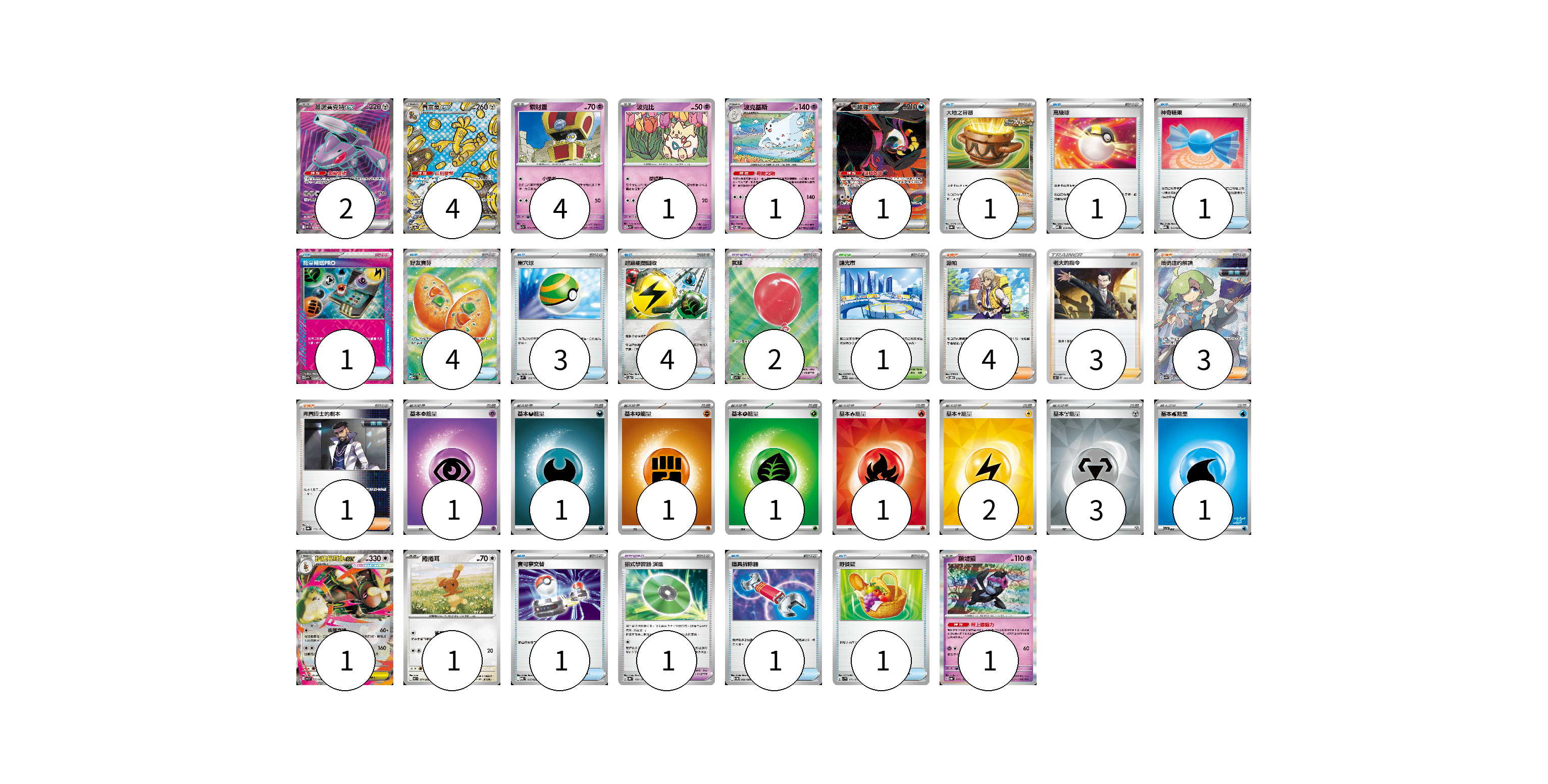 牌組構築方案 以此牌組為基礎新構築牌組 顯示卡面 顯示列表 寶可夢卡(16) 2 4 4 1 1 1 1 1 1 寶可夢道具(3) 2 1 物品卡(18) 1 1 1 1 4 3 4 1 1 1 支援者卡(11) 4 3 3 1 競技場卡(1) 1 能量卡(11) 1 1 1 1 1 2 3 1 寶可夢卡(16) 卡牌名稱 張數 卡牌名稱 張數 蓋諾賽克特ex SV11B 164/086 02 賽富豪ex SV8a 220/187 04 索財靈 SV7a 024/064 04 波克比 SV3 043/108 01 波克基斯 SV8 047/106 01 吉雉雞ex SV6a 089/064 01 超級長耳兔ex M2 072/080 01 捲捲耳 M2 071/080 01 願增猿 SV8a 075/187 01 寶可夢道具(3) 卡牌名稱 張數 卡牌名稱 張數 氣球 M1L 084/063 02 招式學習器 演進 SV8a 160/187 01 物品卡(18) 卡牌名稱 張數 卡牌名稱 張數 大地之容器 SV8a 143/187 01 高級球 MBD 014/022 01 神奇糖果 MBG 013/022 01 能量輸送PRO SV7a 052/064 01 好友寶芬 M1S 081/063 04 巢穴球 SVM 133/175 03 超級能量回收 SV8a 141/187 04 寶可夢交替 MBG 015/022 01 道具拆除器 SV11W 080/086 01 野餐籃 SV1V 071/078 01 支援者卡(11) 卡牌名稱 張數 卡牌名稱 張數 派帕 SVOD 018/020 04 老大的指令(坂木) SCB 140/156 03 暗碼迷的解讀 SV5M 090/071 03 弗圖博士的劇本 SV8a 175/187 01 競技場卡(1) 卡牌名稱 張數 卡牌名稱 張數 釀光市 SV9 098/100 01 能量卡(11) 卡牌名稱 張數 卡牌名稱 張數 基本【超】能量 MBD PSY 01 基本【惡】能量 MBG DAR 01 基本【鬥】能量 M-P FIG 01 基本【草】能量 M-P GRA 01 基本【火】能量 SVQL FIR 01 基本【雷】能量 SVQP LIG 02 基本【鋼】能量 SVOD MET 03 基本【水】能量 SVI WAT 01 以此牌組為基礎新構築牌組 牌組編碼 ZjhrwF-xulPuJ-oTyHtM copy 列印牌組單 牌組編碼已複製 分享至SNS