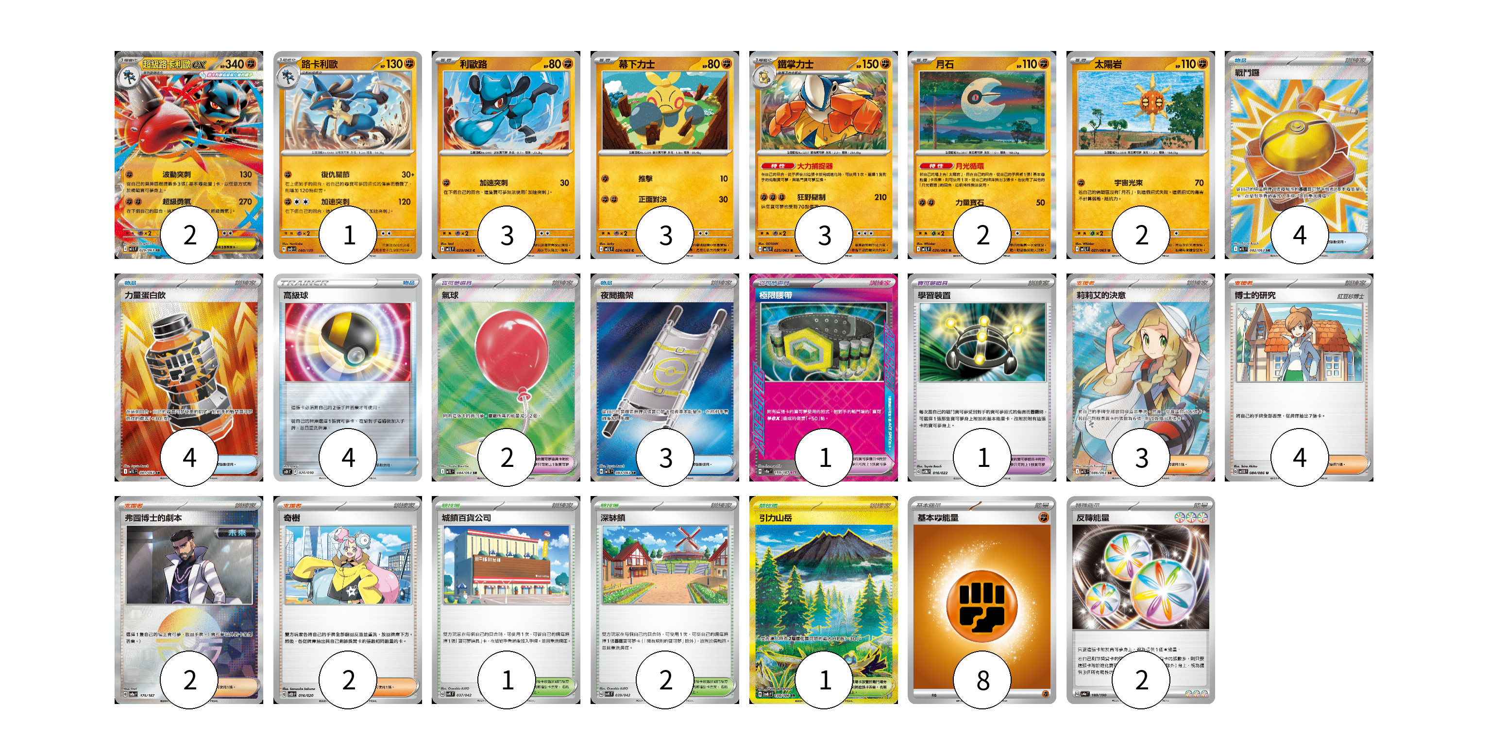 牌組構築方案 以此牌組為基礎新構築牌組 顯示卡面 顯示列表 寶可夢卡(16) 2 1 3 3 3 2 2 寶可夢道具(4) 2 1 1 物品卡(15) 4 4 4 3 支援者卡(11) 3 4 2 2 競技場卡(4) 1 2 1 能量卡(10) 8 2 寶可夢卡(16) 卡牌名稱 張數 卡牌名稱 張數 超級路卡利歐ex M1L 029/063 02 路卡利歐 SVD 060/139 01 利歐路 M1L 028/063 03 幕下力士 M1L 024/063 03 鐵掌力士 M1L 025/063 03 月石 M1L 026/063 02 太陽岩 M1L 027/063 02 寶可夢道具(4) 卡牌名稱 張數 卡牌名稱 張數 氣球 M1L 084/063 02 極限腰帶 SV8a 159/187 01 學習裝置 SVTM 016/022 01 物品卡(15) 卡牌名稱 張數 卡牌名稱 張數 戰鬥鑼 M1L 082/063 04 力量蛋白飲 M1L 081/063 04 高級球 SO 020/030 04 夜間擔架 M1L 083/063 03 支援者卡(11) 卡牌名稱 張數 卡牌名稱 張數 莉莉艾的決意 M1L 086/063 03 博士的研究 SV11B 084/086 04 弗圖博士的劇本 SV8a 175/187 02 奇樹 SVOD 016/020 02 競技場卡(4) 卡牌名稱 張數 卡牌名稱 張數 城鎮百貨公司 SVK 037/042 01 深缽鎮 SVK 039/042 02 引力山岳 SV8 138/106 01 能量卡(10) 卡牌名稱 張數 卡牌名稱 張數 基本【鬥】能量 M-P FIG 08 反轉能量 SV4a 189/190 02 以此牌組為基礎新構築牌組 牌組編碼 ZmtxiS-HMCQuS-wriMsA copy 列印牌組單 牌組編碼已複製 分享至SNS