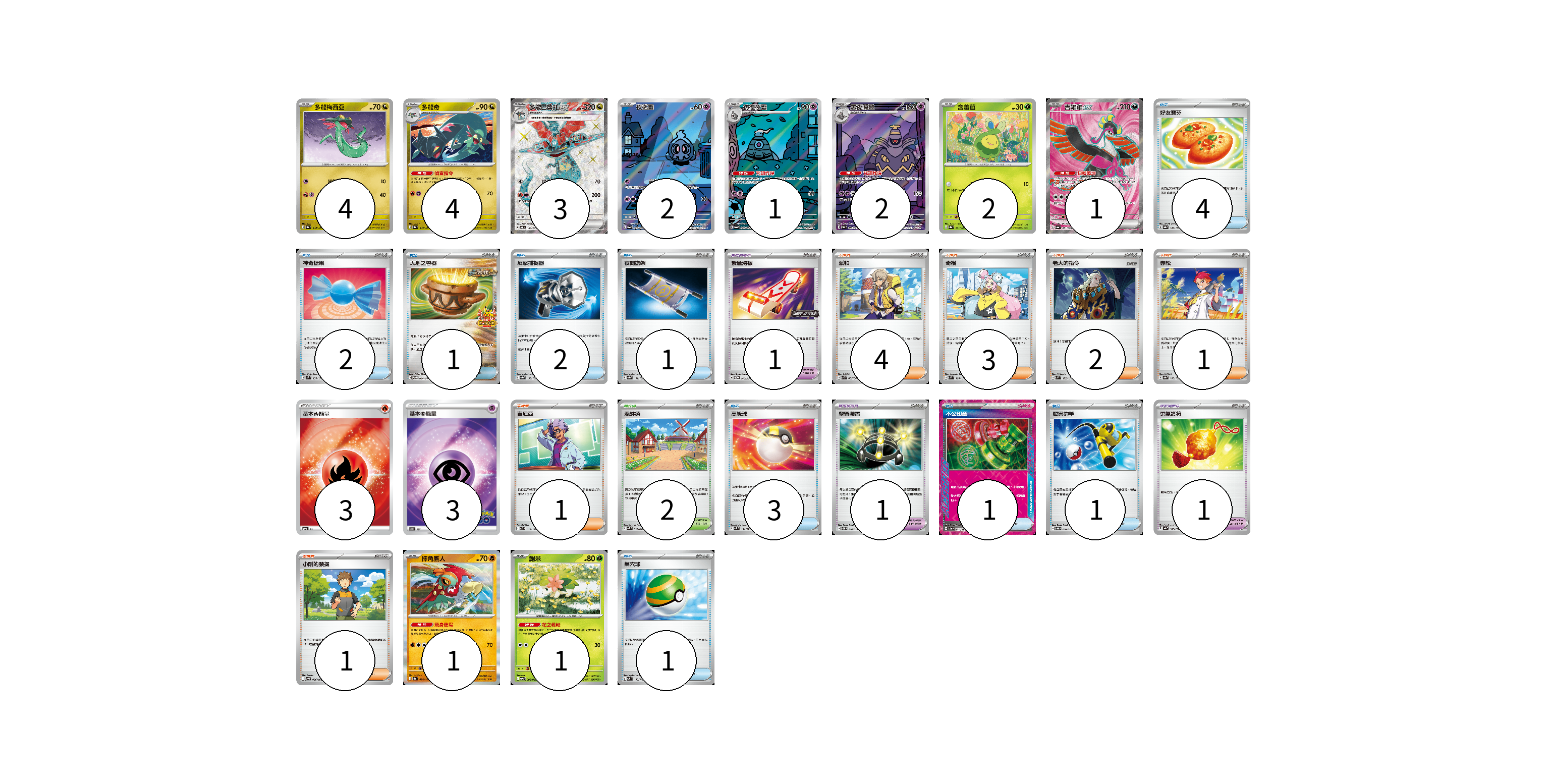 牌組構築方案 以此牌組為基礎新構築牌組 顯示卡面 顯示列表 寶可夢卡(21) 4 4 3 2 1 2 2 1 1 1 寶可夢道具(3) 1 1 1 物品卡(16) 4 2 1 2 1 3 1 1 1 支援者卡(12) 4 3 2 1 1 1 競技場卡(2) 2 能量卡(6) 3 3 寶可夢卡(21) 卡牌名稱 張數 卡牌名稱 張數 多龍梅西亞 SV8a 118/187 04 多龍奇 SV8a 119/187 04 多龍巴魯托ex SV6 120/101 03 夜巡靈 SV6a 068/064 02 彷徨夜靈 SV6a 069/064 01 黑夜魔靈 SV6a 070/064 02 含羞苞 SV8a 001/187 02 吉雉雞ex SV6a 081/064 01 摔角鷹人 SV8a 084/187 01 謝米 SV9a 006/063 01 寶可夢道具(3) 卡牌名稱 張數 卡牌名稱 張數 緊急滑板 SV-P 140/SV-P 01 學習裝置 SVTM 016/022 01 勇氣護符 SV4a 169/190 01 物品卡(16) 卡牌名稱 張數 卡牌名稱 張數 好友寶芬 SV8a 147/187 04 神奇糖果 SVM 135/175 02 大地之容器 SV-P 084/SV-P 01 反擊捕捉器 SV8a 139/187 02 夜間擔架 SV8a 151/187 01 高級球 SVM 134/175 03 不公印章 SV5a 053/066 01 厲害釣竿 SVOD 010/020 01 巢穴球 SVM 133/175 01 支援者卡(12) 卡牌名稱 張數 卡牌名稱 張數 派帕 SVK 035/042 04 奇樹 SVM 160/175 03 老大的指令 SVM 172/175 02 赤松 SV8a 163/187 01 吉尼亞 SVD 129/139 01 小剛的發掘 SV9 096/100 01 競技場卡(2) 卡牌名稱 張數 卡牌名稱 張數 深缽鎮 SVK 039/042 02 能量卡(6) 卡牌名稱 張數 卡牌名稱 張數 基本【火】能量 SO FIR 03 基本超能量 S10b PSY 03 以此牌組為基礎新構築牌組 牌組編碼 Zpijbx-XYAtLs-KUAdeW copy 列印牌組單 牌組編碼已複製 分享至SNS