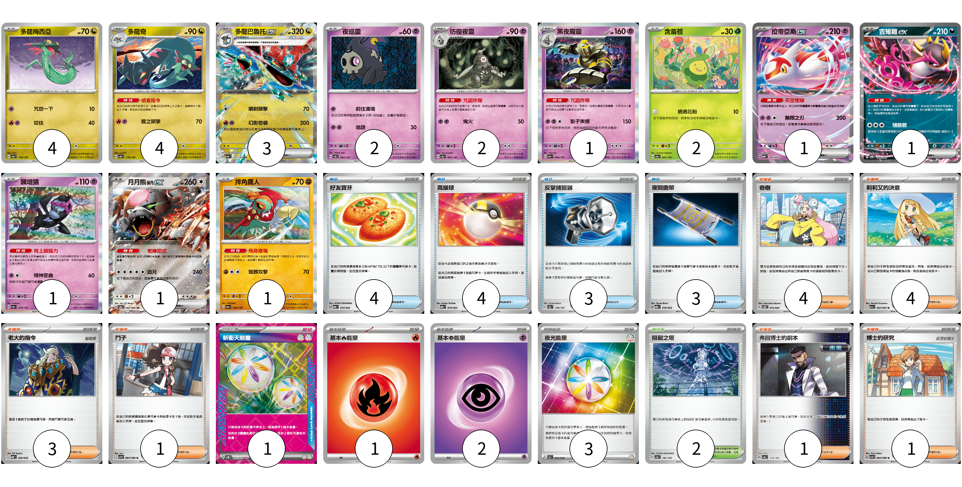 牌組構築方案 以此牌組為基礎新構築牌組 顯示卡面 顯示列表 寶可夢卡(23) 4 4 3 2 2 1 2 1 1 1 1 1 物品卡(14) 4 4 3 3 支援者卡(14) 4 4 3 1 1 1 競技場卡(2) 2 能量卡(7) 1 1 2 3 寶可夢卡(23) 卡牌名稱 張數 卡牌名稱 張數 多龍梅西亞 SV8a 118/187 04 多龍奇 SV8a 119/187 04 多龍巴魯托ex SV8a 120/187 03 夜巡靈 SV8a 064/187 02 彷徨夜靈 SV8a 065/187 02 黑夜魔靈 SV8a 066/187 01 含羞苞 SV8a 001/187 02 拉帝亞斯ex MBD 003/022 01 吉雉雞ex SVOD 004/020 01 願增猿 SV8a 075/187 01 月月熊 赫月 ex SV5a 052/066 01 摔角鷹人 SV8a 084/187 01 物品卡(14) 卡牌名稱 張數 卡牌名稱 張數 好友寶芬 MBD 013/022 04 高級球 MBD 014/022 04 反擊捕捉器 SV8a 139/187 03 夜間擔架 MBD 016/022 03 支援者卡(14) 卡牌名稱 張數 卡牌名稱 張數 奇樹 SVOD 016/020 04 莉莉艾的決意 M1L 062/063 04 老大的指令 MBD 020/022 03 鬥子 SV11W 085/086 01 弗圖博士的劇本 SV8a 175/187 01 博士的研究 SV11B 084/086 01 競技場卡(2) 卡牌名稱 張數 卡牌名稱 張數 阻礙之塔 SV8a 181/187 02 能量卡(7) 卡牌名稱 張數 卡牌名稱 張數 新衝天能量 SV5K 071/071 01 基本火能量 sv-p FIR 01 基本超能量 sv-p PSY 02 夜光能量 SVK 042/042 03 以此牌組為基礎新構築牌組 牌組編碼 ZqTLPp-vHqoRl-GoVNmY copy 列印牌組單 牌組編碼已複製 分享至SNS