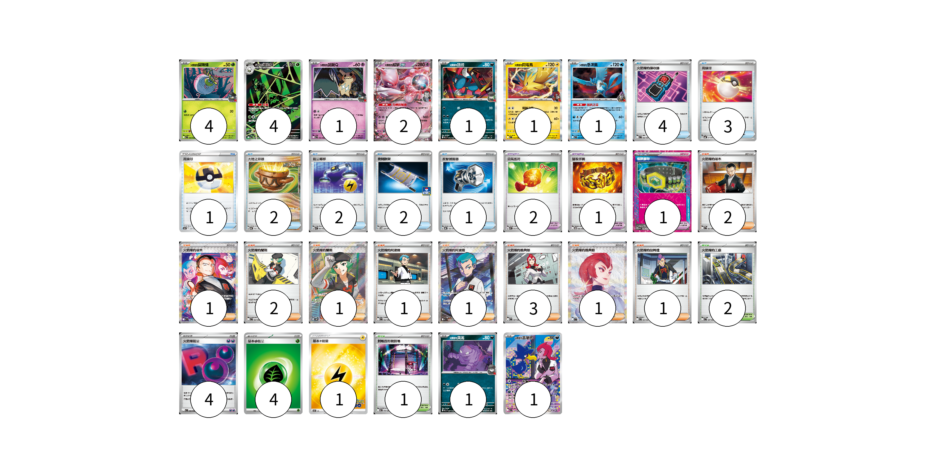 牌組構築方案 以此牌組為基礎新構築牌組 顯示卡面 顯示列表 寶可夢卡(16) 4 4 1 2 1 1 1 1 1 寶可夢道具(4) 2 1 1 物品卡(15) 4 3 1 2 2 2 1 支援者卡(13) 2 1 2 1 1 1 3 1 1 競技場卡(3) 2 1 能量卡(9) 4 4 1 寶可夢卡(16) 卡牌名稱 張數 卡牌名稱 張數 <火箭隊的>團珠蛛 SV10 008/098 04 <火箭隊的>操陷蛛 SV10 099/098 04 <火箭隊的>謎擬Q SV10 042/098 01 <火箭隊的>超夢ex SV10 039/098 02 <火箭隊的>狃拉 SV10 072/098 01 <火箭隊的>閃電鳥 SV10 033/098 01 <火箭隊的>急凍鳥 SV10 022/098 01 <火箭隊的>臭泥 SV10 067/098 01 <火箭隊的>黑暗鴉 SV10 106/098 01 寶可夢道具(4) 卡牌名稱 張數 卡牌名稱 張數 勇氣護符 SVK 024/042 02 猛攻手鐲 SV11W 082/086 01 極限腰帶 SV5K 066/071 01 物品卡(15) 卡牌名稱 張數 卡牌名稱 張數 火箭隊的接收器 SV10 090/098 04 高級球 SVHK 013/022 03 高級球 S12a 138/172 01 大地之容器 SV8a 143/187 02 能量轉移 SVK 008/042 02 夜間擔架 SV-P 227/SV-P 02 反擊捕捉器 SV8a 139/187 01 支援者卡(13) 卡牌名稱 張數 卡牌名稱 張數 火箭隊的坂木 SV10 093/098 02 火箭隊的坂木 SV10 129/098 01 火箭隊的蘭斯 SV10 095/098 02 火箭隊的蘭斯 SV10 123/098 01 火箭隊的阿波羅 SV10 092/098 01 火箭隊的阿波羅 SV10 120/098 01 火箭隊的雅典娜 SV10 091/098 03 火箭隊的雅典娜 SV10 128/098 01 火箭隊的拉姆達 SV10 094/098 01 競技場卡(3) 卡牌名稱 張數 卡牌名稱 張數 火箭隊的工廠 SV10 097/098 02 對戰圓形競技場 M2 079/080 01 能量卡(9) 卡牌名稱 張數 卡牌名稱 張數 火箭隊能量 SV10 098/098 04 基本草能量 sv-p GRA 04 基本雷能量 S10b LIG 01 以此牌組為基礎新構築牌組 牌組編碼 ZshysK-YZvPop-HIFBts copy 列印牌組單 牌組編碼已複製 分享至SNS