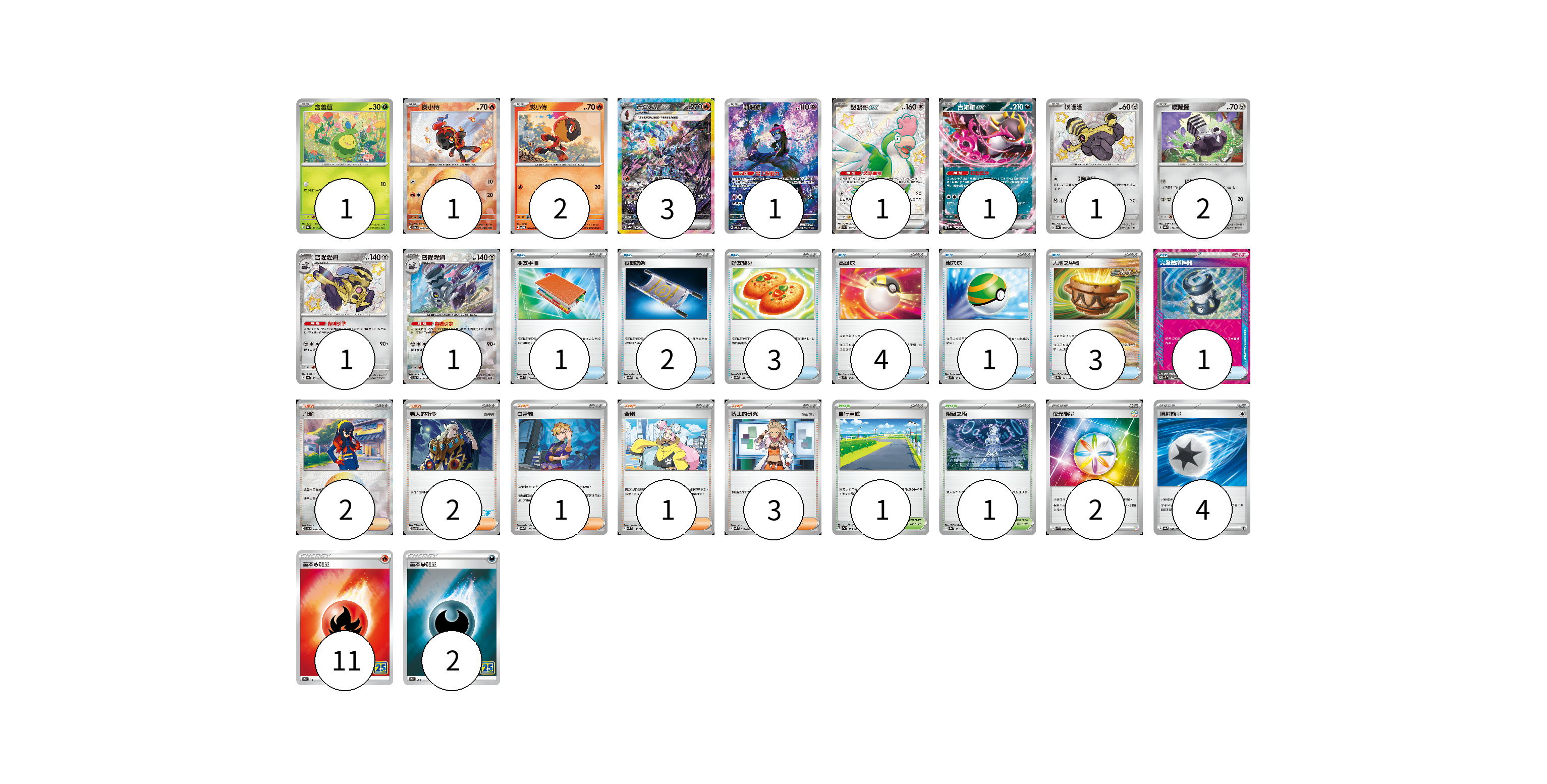 牌組構築方案 以此牌組為基礎新構築牌組 顯示卡面 顯示列表 寶可夢卡(15) 1 1 2 3 1 1 1 1 2 1 1 物品卡(15) 1 2 3 4 1 3 1 支援者卡(9) 2 2 1 1 3 競技場卡(2) 1 1 能量卡(19) 2 4 11 2 寶可夢卡(15) 卡牌名稱 張數 卡牌名稱 張數 含羞苞 SV8a 001/187 01 炭小侍 SV8a 023/187 01 炭小侍 SVPS 005/008 02 蒼炎刃鬼ex SV8a 203/187 03 願增猿 SV6 107/101 01 怒鸚哥ex SV4a 337/190 01 吉雉雞ex SV8a 104/187 01 噗隆隆 SV4a 300/190 01 噗隆隆 SV8a 114/187 02 普隆隆姆 SV4a 301/190 01 普隆隆姆 SV8a 115/187 01 物品卡(15) 卡牌名稱 張數 卡牌名稱 張數 朋友手冊 SVK 014/042 01 夜間擔架 SV8a 151/187 02 好友寶芬 SV8a 147/187 03 高級球 SVM 134/175 04 巢穴球 SVM 133/175 01 大地之容器 SV8a 143/187 03 完全體攪拌器 SVK 017/042 01 支援者卡(9) 卡牌名稱 張數 卡牌名稱 張數 丹瑜 SV8a 170/187 02 老大的指令 SVI 066/066 02 白蕾雅 SV8a 176/187 01 奇樹 SVM 160/175 01 博士的研究 SVK 032/042 03 競技場卡(2) 卡牌名稱 張數 卡牌名稱 張數 自行車道 SV2a 165/165 01 阻礙之塔 SV8a 181/187 01 能量卡(19) 卡牌名稱 張數 卡牌名稱 張數 夜光能量 SVK 042/042 02 噴射能量 SV8a 185/187 04 基本火能量 S8a FIR 11 基本惡能量 S8a DAR 02 以此牌組為基礎新構築牌組 牌組編碼 Zsidel-ybTQlN-Obxfxn copy 列印牌組單 牌組編碼已複製 分享至SNS