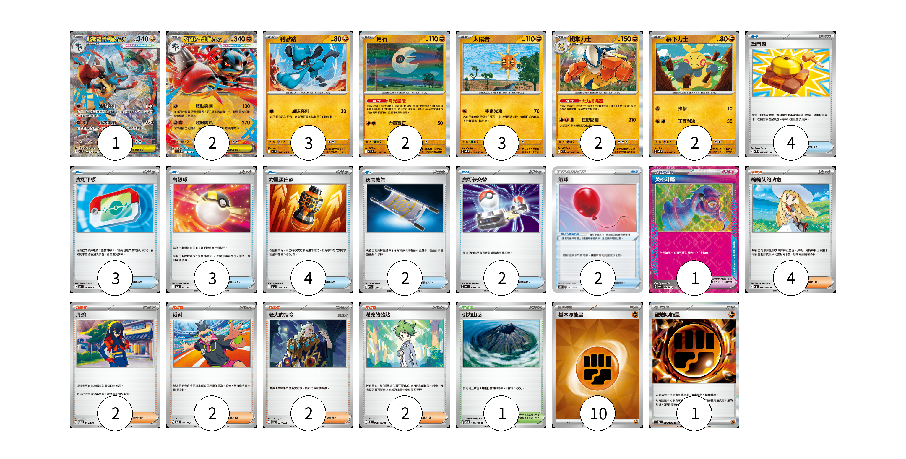 牌組構築方案 以此牌組為基礎新構築牌組 顯示卡面 顯示列表 寶可夢卡(15) 1 2 3 2 3 2 2 寶可夢道具(3) 2 1 物品卡(18) 4 3 3 4 2 2 支援者卡(12) 4 2 2 2 2 競技場卡(1) 1 能量卡(11) 10 1 寶可夢卡(15) 卡牌名稱 張數 卡牌名稱 張數 超級路卡利歐ex M1L 088/063 01 超級路卡利歐ex M1L 029/063 02 利歐路 M1L 028/063 03 月石 M1L 026/063 02 太陽岩 M1L 027/063 03 鐵掌力士 M1L 025/063 02 幕下力士 M1L 024/063 02 寶可夢道具(3) 卡牌名稱 張數 卡牌名稱 張數 氣球 SK 021/030 02 英雄斗篷 SV5M 064/071 01 物品卡(18) 卡牌名稱 張數 卡牌名稱 張數 戰鬥鑼 M1L 059/063 04 寶可平板 MC 662/742 03 高級球 MC 651/742 03 力量蛋白飲 M1L 058/063 04 夜間擔架 SVOM 016/021 02 寶可夢交替 MC 663/742 02 支援者卡(12) 卡牌名稱 張數 卡牌名稱 張數 莉莉艾的決意 M1L 062/063 04 丹瑜 SVTR 016/021 02 裁判 MC 711/742 02 老大的指令 MBG 021/022 02 滿充的體貼 M1S 060/063 02 競技場卡(1) 卡牌名稱 張數 卡牌名稱 張數 引力山岳 SV8 106/106 01 能量卡(11) 卡牌名稱 張數 卡牌名稱 張數 基本【鬥】能量 SVM FIG 10 硬岩【鬥】能量 M3 080/080 01 以此牌組為基礎新構築牌組 牌組編碼 ZuXnTx-kkYzGT-WHINqO copy 列印牌組單 牌組編碼已複製 分享至SNS