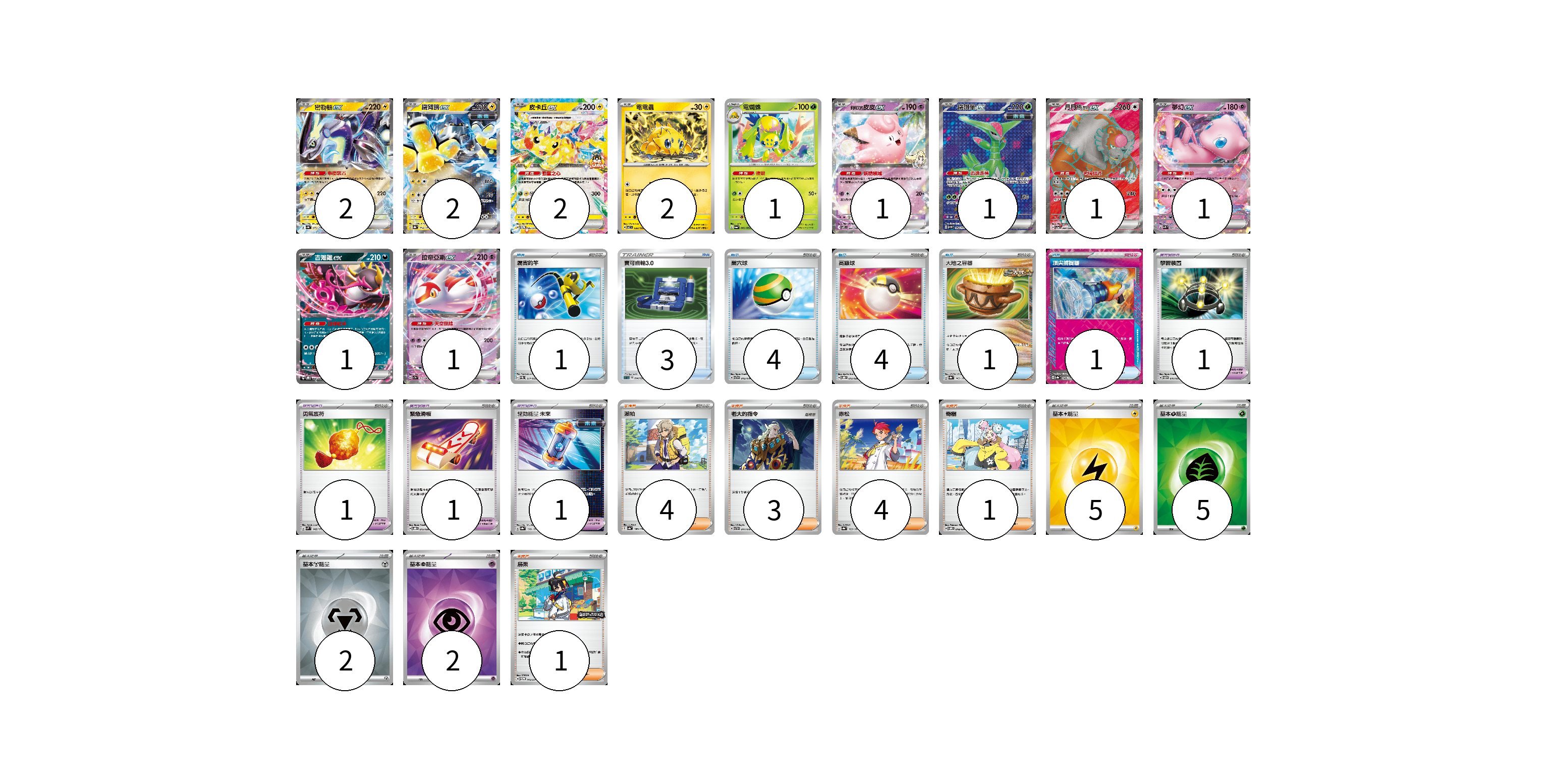 牌組構築方案 以此牌組為基礎新構築牌組 顯示卡面 顯示列表 寶可夢卡(15) 2 2 2 2 1 1 1 1 1 1 1 寶可夢道具(4) 1 1 1 1 物品卡(14) 1 3 4 4 1 1 支援者卡(13) 4 3 4 1 1 能量卡(14) 5 5 2 2 寶可夢卡(15) 卡牌名稱 張數 卡牌名稱 張數 密勒頓ex SV4a 071/190 02 鐵臂膀ex SV8a 054/187 02 皮卡丘ex SV-P 185/SV-P 02 電電蟲 SV7 032/102 02 電蜘蛛 SV6a 002/064 01 莉莉艾的皮皮ex SV9 033/100 01 鐵斑葉ex SV5M 084/071 01 月月熊 赫月 ex SV5a 084/066 01 夢幻ex SVK 001/042 01 吉雉雞ex SVOD 004/020 01 拉帝亞斯ex SV7a 019/064 01 寶可夢道具(4) 卡牌名稱 張數 卡牌名稱 張數 學習裝置 SVTM 016/022 01 勇氣護符 SVM 142/175 01 緊急滑板 SVOD 015/020 01 驅勁能量 未來 SV8a 158/187 01 物品卡(14) 卡牌名稱 張數 卡牌名稱 張數 厲害釣竿 SVEM 011/020 01 寶可齒輪3.0 SLD 014/020 03 巢穴球 SVTG 012/019 04 高級球 SVOD 012/020 04 大地之容器 SV8a 143/187 01 頂尖捕捉器 SV8a 148/187 01 支援者卡(13) 卡牌名稱 張數 卡牌名稱 張數 派帕 SV4a 180/190 04 老大的指令 SVTH 017/018 03 赤松 SV8a 163/187 04 奇樹 SVOM 018/021 01 烏栗 SV-P 142/SV-P 01 能量卡(14) 卡牌名稱 張數 卡牌名稱 張數 基本【雷】能量 SVK LIG 05 基本【草】能量 SVK GRA 05 基本【鋼】能量 SVOD MET 02 基本【超】能量 SVOD PSY 02 以此牌組為基礎新構築牌組 牌組編碼 ZuiFRP-FbYVvf-dAJoAS copy 列印牌組單 牌組編碼已複製 分享至SNS