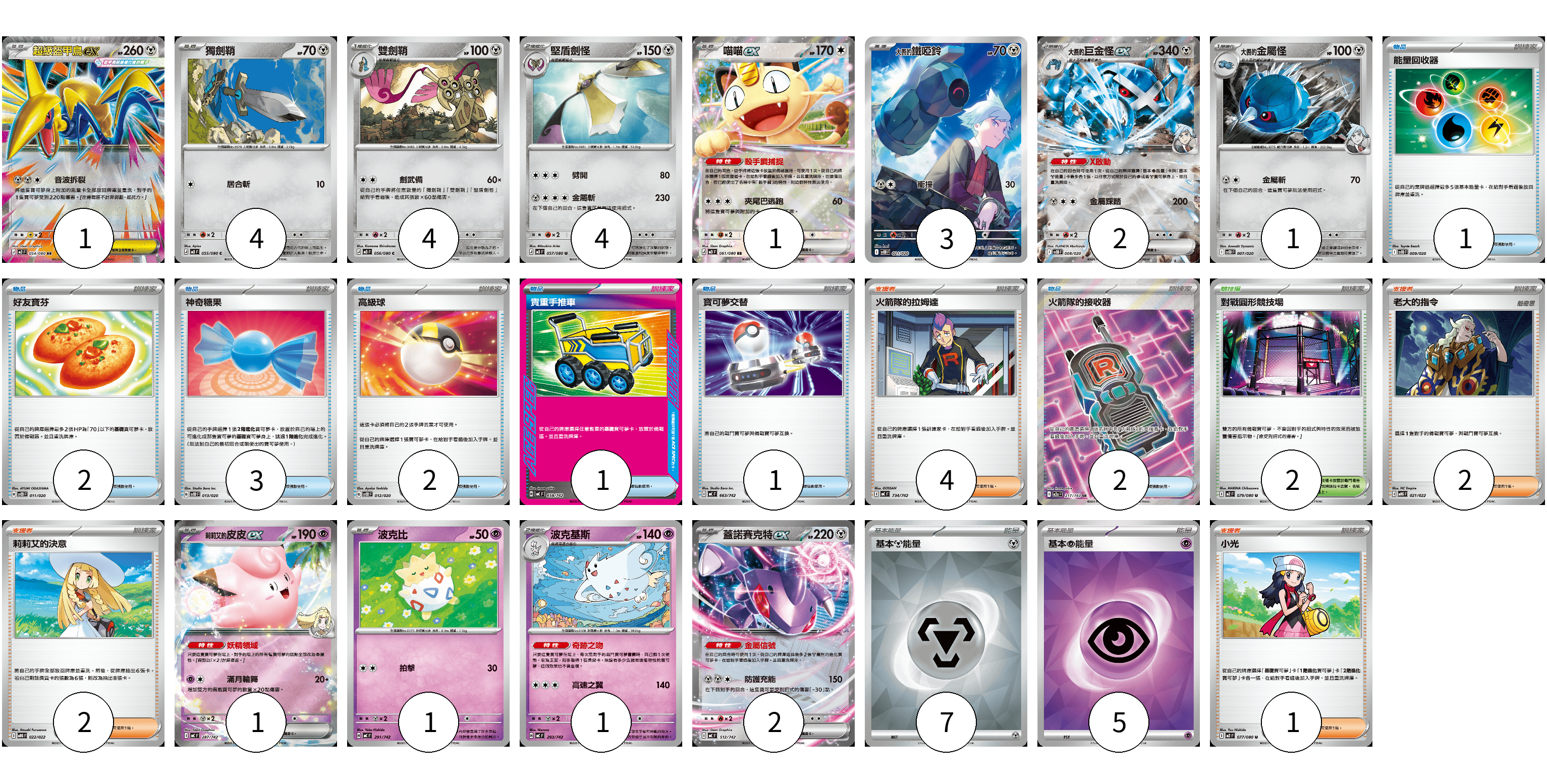 牌組構築方案 以此牌組為基礎新構築牌組 顯示卡面 顯示列表 寶可夢卡(25) 1 4 4 4 1 3 2 1 1 1 1 2 物品卡(12) 1 2 3 2 1 1 2 支援者卡(9) 4 2 2 1 競技場卡(2) 2 能量卡(12) 7 5 寶可夢卡(25) 卡牌名稱 張數 卡牌名稱 張數 超級盔甲鳥ex M3 054/080 01 獨劍鞘 M3 055/080 04 雙劍鞘 M3 056/080 04 堅盾劍怪 M3 057/080 04 喵喵ex M3 061/080 01 <大吾的>鐵啞鈴 SVOD 021/020 03 <大吾的>巨金怪ex SVOD 008/020 02 <大吾的>金屬怪 SVOD 007/020 01 莉莉艾的皮皮ex MC 287/742 01 波克比 MC 291/742 01 波克基斯 MC 293/742 01 蓋諾賽克特ex MC 512/742 02 物品卡(12) 卡牌名稱 張數 卡牌名稱 張數 能量回收器 SVOD 009/020 01 好友寶芬 SVOD 011/020 02 神奇糖果 SVOD 013/020 03 高級球 SVOD 012/020 02 貴重手推車 MC 658/742 01 寶可夢交替 MC 663/742 01 火箭隊的接收器 M2a 217/193 02 支援者卡(9) 卡牌名稱 張數 卡牌名稱 張數 火箭隊的拉姆達 MC 734/742 04 老大的指令 MBG 021/022 02 莉莉艾的決意 MBG 022/022 02 小光 M2 077/080 01 競技場卡(2) 卡牌名稱 張數 卡牌名稱 張數 對戰圓形競技場 M2 079/080 02 能量卡(12) 卡牌名稱 張數 卡牌名稱 張數 基本【鋼】能量 SVOD MET 07 基本【超】能量 SVOD PSY 05 以此牌組為基礎新構築牌組 牌組編碼 ZwahXI-WOBxSM-BKvEmr copy 列印牌組單 牌組編碼已複製 分享至SNS