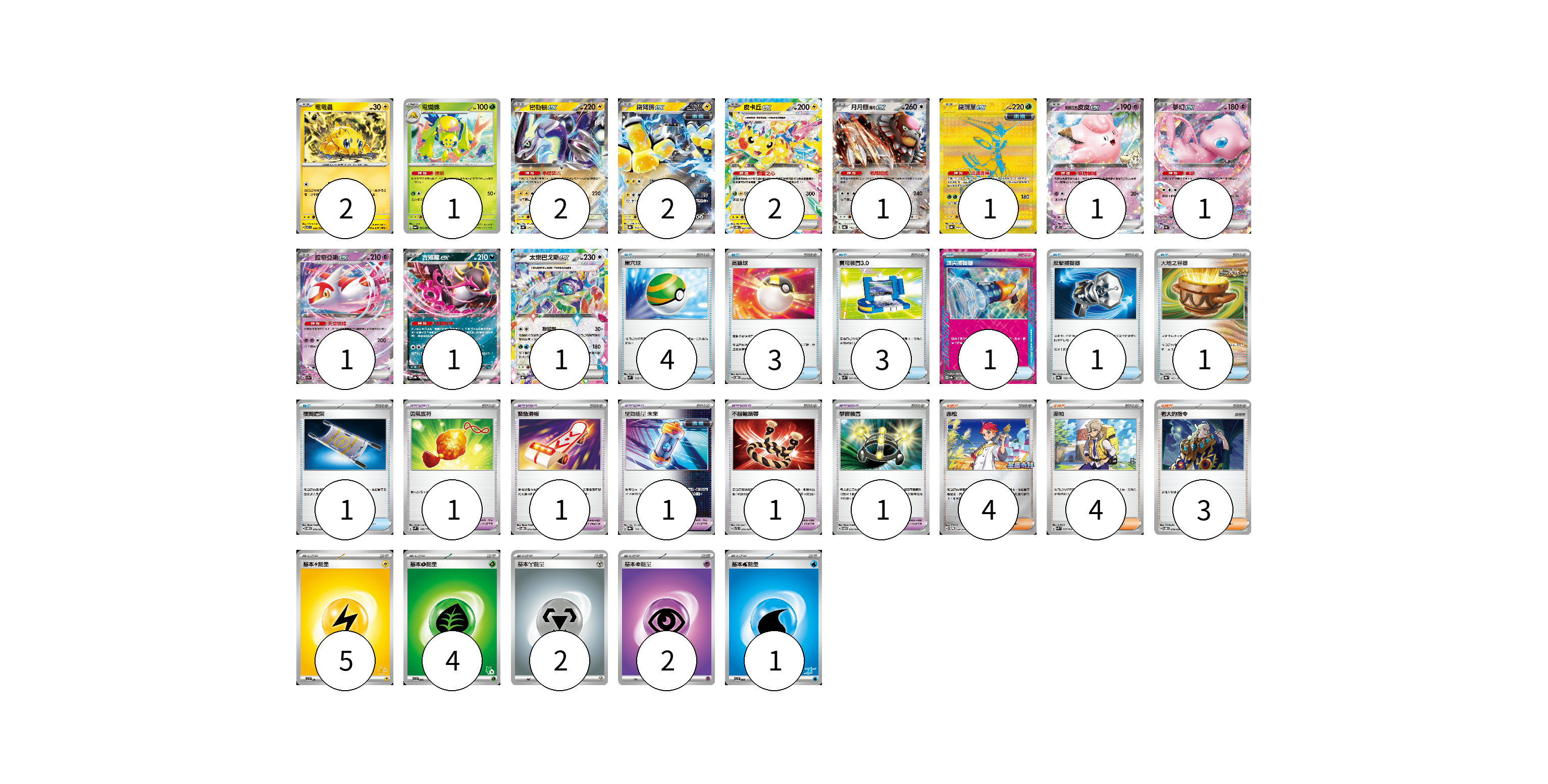 牌組構築方案 以此牌組為基礎新構築牌組 顯示卡面 顯示列表 寶可夢卡(16) 2 1 2 2 2 1 1 1 1 1 1 1 寶可夢道具(5) 1 1 1 1 1 物品卡(14) 4 3 3 1 1 1 1 支援者卡(11) 4 4 3 能量卡(14) 5 4 2 2 1 寶可夢卡(16) 卡牌名稱 張數 卡牌名稱 張數 電電蟲 SV7 032/102 02 電蜘蛛 SV6a 002/064 01 密勒頓ex SV4a 071/190 02 鐵臂膀ex SV8a 054/187 02 皮卡丘ex SV8 033/106 02 月月熊 赫月ex SV8a 134/187 01 鐵斑葉ex SV8a 233/187 01 莉莉艾的皮皮ex SV9 033/100 01 夢幻ex SV4a 076/190 01 拉帝亞斯ex SV7a 019/064 01 吉雉雞ex SV8a 104/187 01 太樂巴戈斯ex SV8a 136/187 01 寶可夢道具(5) 卡牌名稱 張數 卡牌名稱 張數 勇氣護符 SVM 142/175 01 緊急滑板 SVOD 015/020 01 驅勁能量 未來 SV8a 158/187 01 不服輸頭帶 SVTL 016/021 01 學習裝置 SVTM 016/022 01 物品卡(14) 卡牌名稱 張數 卡牌名稱 張數 巢穴球 SVM 133/175 04 高級球 SVOD 012/020 03 寶可裝置3.0 SVK 021/042 03 頂尖捕捉器 SV8a 148/187 01 反擊捕捉器 SV8a 139/187 01 大地之容器 SV8a 143/187 01 夜間擔架 SVOM 016/021 01 支援者卡(11) 卡牌名稱 張數 卡牌名稱 張數 赤松 SV-P 150/SV-P 04 派帕 SVK 035/042 04 老大的指令 SVOD 019/020 03 能量卡(14) 卡牌名稱 張數 卡牌名稱 張數 基本【雷】能量 SVI LIG 05 基本【草】能量 SVI GRA 04 基本【鋼】能量 SVTH MET 02 基本【超】能量 SVTS PSY 02 基本【水】能量 SVI WAT 01 以此牌組為基礎新構築牌組 牌組編碼 ZwceIy-EorWKi-ZpwCgN copy 列印牌組單 牌組編碼已複製 分享至SNS