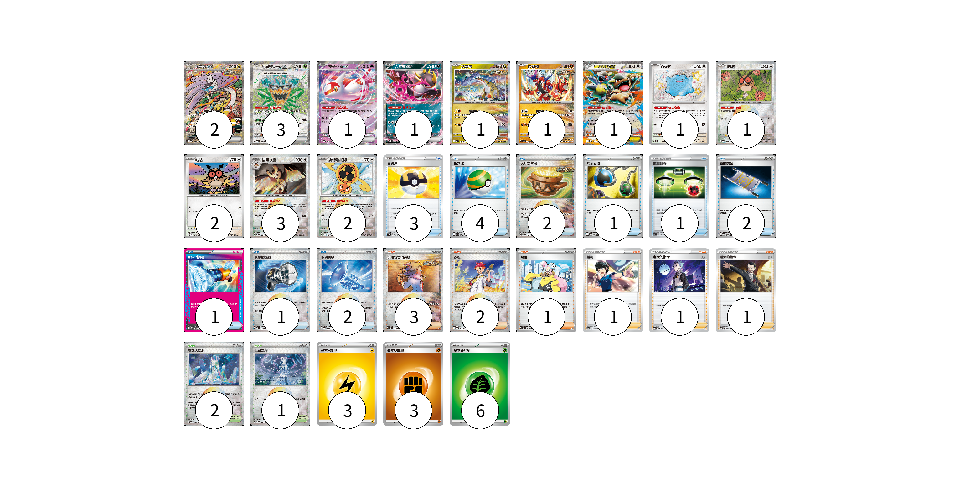 牌組構築方案 以此牌組為基礎新構築牌組 顯示卡面 顯示列表 寶可夢卡(19) 2 3 1 1 1 1 1 1 1 2 3 2 物品卡(17) 3 4 2 1 1 2 1 1 2 支援者卡(9) 3 2 1 1 1 1 競技場卡(3) 2 1 能量卡(12) 3 3 6 寶可夢卡(19) 卡牌名稱 張數 卡牌名稱 張數 猛雷鼓ex SV8a 222/187 02 厄鬼椪 碧草面具ex SV6 114/101 03 拉帝亞斯ex SV7a 019/064 01 吉雉雞ex SV8a 104/187 01 猛雷鼓 SV7 075/102 01 故勒頓 SV8 069/106 01 超級袋獸ex M1S 051/063 01 百變怪 SV4a 309/190 01 咕咕 SV8a 127/187 01 咕咕 SV7 076/102 02 貓頭夜鷹 SV8a 128/187 03 旋轉洛托姆 SV8a 131/187 02 物品卡(17) 卡牌名稱 張數 卡牌名稱 張數 高級球 S12a 138/172 03 巢穴球 SVM 133/175 04 大地之容器 SV8a 143/187 02 能量回收 SV11W 079/086 01 能量轉移 SC1D 146/164 01 夜間擔架 MBG 017/022 02 頂尖捕捉器 MBG 014/022 01 反擊捕捉器 SV8a 139/187 01 玻璃喇叭 SV8a 140/187 02 支援者卡(9) 卡牌名稱 張數 卡牌名稱 張數 奧琳博士的氣魄 SV8a 167/187 03 赤松 SV8a 163/187 02 奇樹 SVOM 018/021 01 裁判 S11a 063/068 01 老大的指令(赤日) SVB 024/028 01 老大的指令(坂木) SCB 140/156 01 競技場卡(3) 卡牌名稱 張數 卡牌名稱 張數 零之大空洞 SV8a 182/187 02 阻礙之塔 SV8a 181/187 01 能量卡(12) 卡牌名稱 張數 卡牌名稱 張數 基本雷能量 sv-p LIG 03 基本【鬥】能量 SVAM FIG 03 基本草能量 sv-p GRA 06 以此牌組為基礎新構築牌組 牌組編碼 ZwrCJx-CSdUgp-opwYxq copy 列印牌組單 牌組編碼已複製 分享至SNS