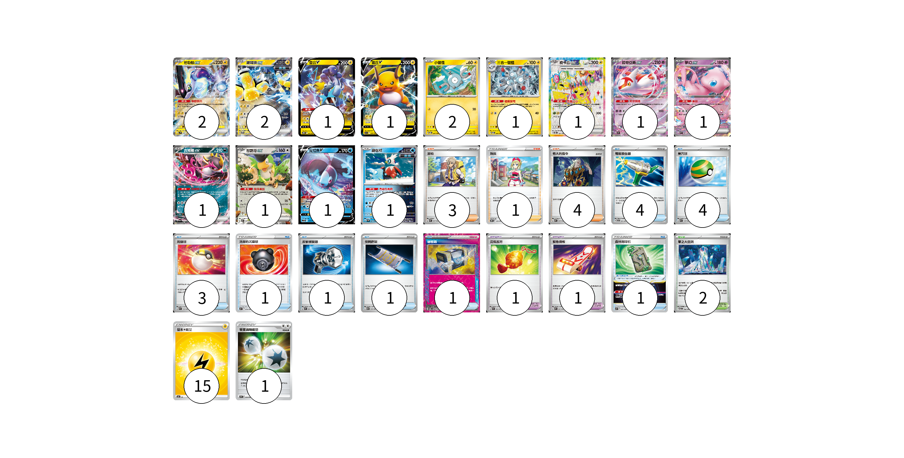牌組構築方案 以此牌組為基礎新構築牌組 顯示卡面 顯示列表 寶可夢卡(16) 2 2 1 1 2 1 1 1 1 1 1 1 1 寶可夢道具(2) 1 1 物品卡(16) 4 4 3 1 1 1 1 1 支援者卡(8) 3 1 4 競技場卡(2) 2 能量卡(16) 15 1 寶可夢卡(16) 卡牌名稱 張數 卡牌名稱 張數 密勒頓ex SV1V 037/078 02 鐵臂膀ex SVTR 007/021 02 雷公V SVTR 005/021 01 雷丘V S9 034/100 01 小磁怪 SV8 034/106 02 三合一磁怪 SV8 035/106 01 皮卡丘ex SV8 122/106 01 拉帝亞斯ex SV7a 019/064 01 夢幻ex SVK 001/042 01 吉雉雞ex SV6a 038/064 01 怒鸚哥ex SVK 006/042 01 霓虹魚V SVHK 004/022 01 鐵包袱 SV4M 020/066 01 寶可夢道具(2) 卡牌名稱 張數 卡牌名稱 張數 勇氣護符 SVK 024/042 01 緊急滑板 SVK 023/042 01 物品卡(16) 卡牌名稱 張數 卡牌名稱 張數 電氣發生器 SVTR 011/021 04 巢穴球 SVK 016/042 04 高級球 SVK 018/042 03 洗翠的沉重球 SVF 019/038 01 反擊捕捉器 SVK 009/042 01 夜間擔架 SV6a 056/064 01 秘密箱 SV6 092/101 01 森林封印石 SVF 024/038 01 支援者卡(8) 卡牌名稱 張數 卡牌名稱 張數 派帕 SVK 035/042 03 珠貝 SVTG 016/019 01 老大的指令 SVK 036/042 04 競技場卡(2) 卡牌名稱 張數 卡牌名稱 張數 零之大空洞 SV7 102/102 02 能量卡(16) 卡牌名稱 張數 卡牌名稱 張數 基本雷能量 SN LIG 15 雙重渦輪能量 SVTM 022/022 01 以此牌組為基礎新構築牌組 牌組編碼 ZxDaXH-ZSXBEc-CfwEgw copy 列印牌組單 牌組編碼已複製 分享至SNS