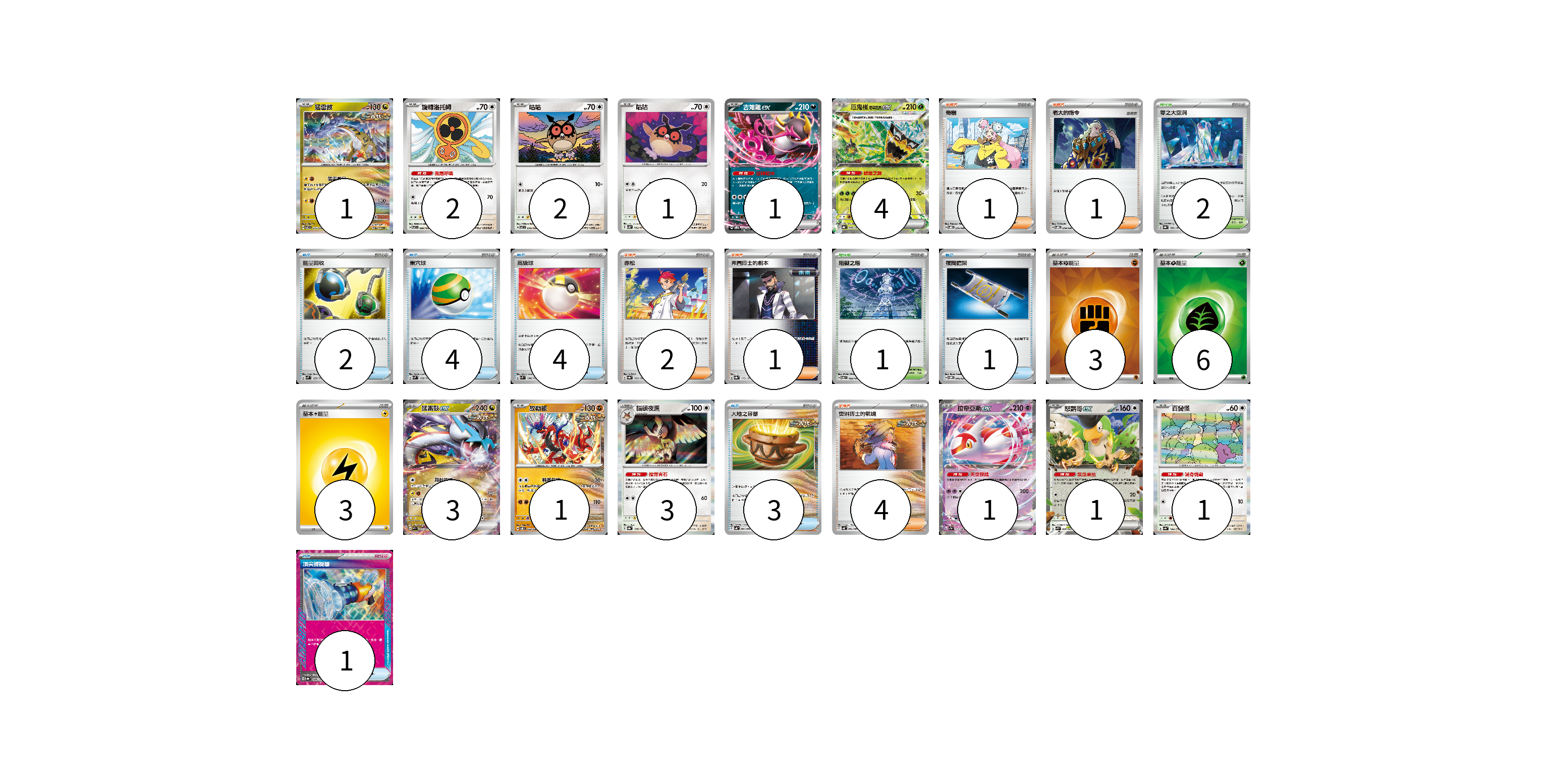 牌組構築方案 以此牌組為基礎新構築牌組 顯示卡面 顯示列表 寶可夢卡(21) 1 2 2 1 1 4 3 1 3 1 1 1 物品卡(15) 2 4 4 1 3 1 支援者卡(9) 1 1 2 1 4 競技場卡(3) 2 1 能量卡(12) 3 6 3 寶可夢卡(21) 卡牌名稱 張數 卡牌名稱 張數 猛雷鼓 SV7 075/102 01 旋轉洛托姆 SV7 080/102 02 咕咕 SV7 076/102 02 咕咕 SV5K 054/071 01 吉雉雞ex SVOM 009/021 01 厄鬼椪 碧草面具ex SV8a 020/187 04 猛雷鼓ex SV5K 053/071 03 故勒頓 SV8 069/106 01 貓頭夜鷹 SV8a 128/187 03 拉帝亞斯ex SV7a 019/064 01 怒鸚哥ex SVK 006/042 01 百變怪 SV4a 144/190 01 物品卡(15) 卡牌名稱 張數 卡牌名稱 張數 能量回收 SVM 125/175 02 巢穴球 SVM 133/175 04 高級球 SVM 134/175 04 夜間擔架 SVOM 016/021 01 大地之容器 SV4K 060/066 03 頂尖捕捉器 SV8a 148/187 01 支援者卡(9) 卡牌名稱 張數 卡牌名稱 張數 奇樹 SVOD 016/020 01 老大的指令 SVOD 019/020 01 赤松 SV8a 163/187 02 弗圖博士的劇本 SV8a 175/187 01 奧琳博士的氣魄 SV4K 064/066 04 競技場卡(3) 卡牌名稱 張數 卡牌名稱 張數 零之大空洞 SV8a 182/187 02 阻礙之塔 SV6 100/101 01 能量卡(12) 卡牌名稱 張數 卡牌名稱 張數 基本【鬥】能量 SVK FIG 03 基本【草】能量 SVK GRA 06 基本【雷】能量 SVHM LIG 03 以此牌組為基礎新構築牌組 牌組編碼 ZyILWN-loYFgN-CIGelE copy 列印牌組單 牌組編碼已複製 分享至SNS