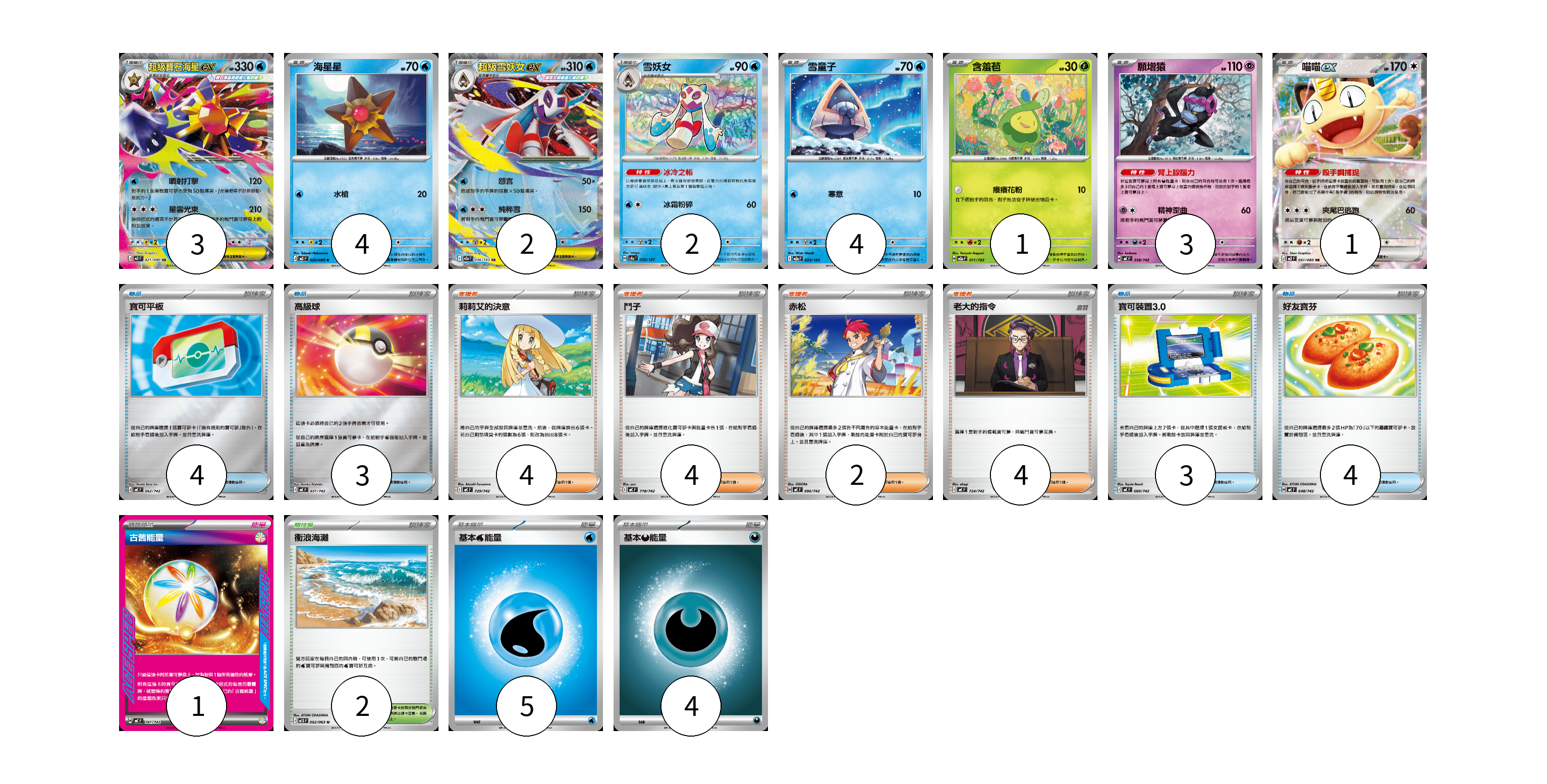 牌組構築方案 以此牌組為基礎新構築牌組 顯示卡面 顯示列表 寶可夢卡(20) 3 4 2 2 4 1 3 1 物品卡(14) 4 3 3 4 支援者卡(14) 4 4 2 4 競技場卡(2) 2 能量卡(10) 1 5 4 寶可夢卡(20) 卡牌名稱 張數 卡牌名稱 張數 超級寶石海星ex M3 021/080 03 海星星 M3 020/080 04 超級雪妖女ex M2a 036/193 02 雪妖女 SV8a 038/187 02 雪童子 M2a 035/193 04 含羞苞 M2a 011/193 01 願增猿 MC 358/742 03 喵喵ex M3 061/080 01 物品卡(14) 卡牌名稱 張數 卡牌名稱 張數 寶可平板 MC 662/742 04 高級球 MC 651/742 03 寶可裝置3.0 MC 660/742 03 好友寶芬 MC 648/742 04 支援者卡(14) 卡牌名稱 張數 卡牌名稱 張數 莉莉艾的決意 MC 729/742 04 鬥子 MC 718/742 04 赤松 MC 696/742 02 老大的指令 MC 724/742 04 競技場卡(2) 卡牌名稱 張數 卡牌名稱 張數 衝浪海灘 M1S 062/063 02 能量卡(10) 卡牌名稱 張數 卡牌名稱 張數 古舊能量 MC 741/742 01 基本【水】能量 MC WAT 05 基本【惡】能量 MC DAR 04 以此牌組為基礎新構築牌組 牌組編碼 ZyYSKH-TTpsJd-DoMaJn copy 列印牌組單 牌組編碼已複製 分享至SNS