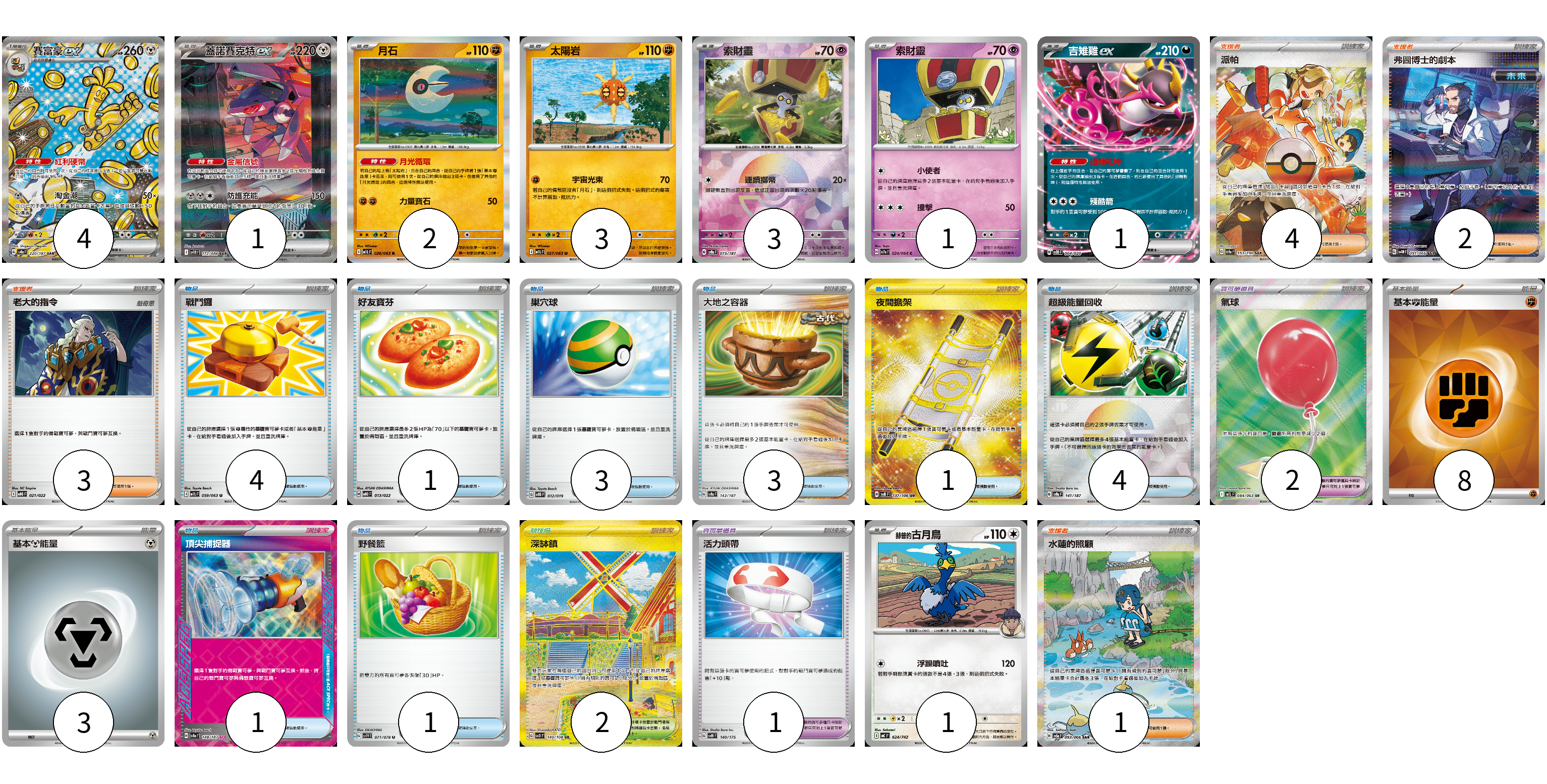 牌組構築方案 以此牌組為基礎新構築牌組 顯示卡面 顯示列表 寶可夢卡(16) 4 1 2 3 3 1 1 1 寶可夢道具(3) 2 1 物品卡(18) 4 1 3 3 1 4 1 1 支援者卡(10) 4 2 3 1 競技場卡(2) 2 能量卡(11) 8 3 寶可夢卡(16) 卡牌名稱 張數 卡牌名稱 張數 賽富豪ex SV8a 220/187 04 蓋諾賽克特ex SV11B 172/086 01 月石 M1L 026/063 02 太陽岩 M1L 027/063 03 索財靈 SV8a 073/187 03 索財靈 SV7a 024/064 01 吉雉雞ex SVOD 004/020 01 <赫普的>古月鳥 MC 624/742 01 寶可夢道具(3) 卡牌名稱 張數 卡牌名稱 張數 氣球 M1L 084/063 02 活力頭帶 SVM 140/175 01 物品卡(18) 卡牌名稱 張數 卡牌名稱 張數 戰鬥鑼 M1L 059/063 04 好友寶芬 MBD 013/022 01 巢穴球 SVTG 012/019 03 大地之容器 SV8a 143/187 03 夜間擔架 SV8 137/106 01 超級能量回收 SV8a 141/187 04 頂尖捕捉器 SV8a 148/187 01 野餐籃 SV1V 071/078 01 支援者卡(10) 卡牌名稱 張數 卡牌名稱 張數 派帕 SV4a 353/190 04 弗圖博士的劇本 SV4M 091/066 02 老大的指令 MBG 021/022 03 水蓮的照顧 SV5a 093/066 01 競技場卡(2) 卡牌名稱 張數 卡牌名稱 張數 深缽鎮 SV3 140/108 02 能量卡(11) 卡牌名稱 張數 卡牌名稱 張數 基本【鬥】能量 SVK FIG 08 基本【鋼】能量 SVB MET 03 以此牌組為基礎新構築牌組 牌組編碼 ZzpVnb-zaznit-EBJLYD copy 列印牌組單 牌組編碼已複製 分享至SNS