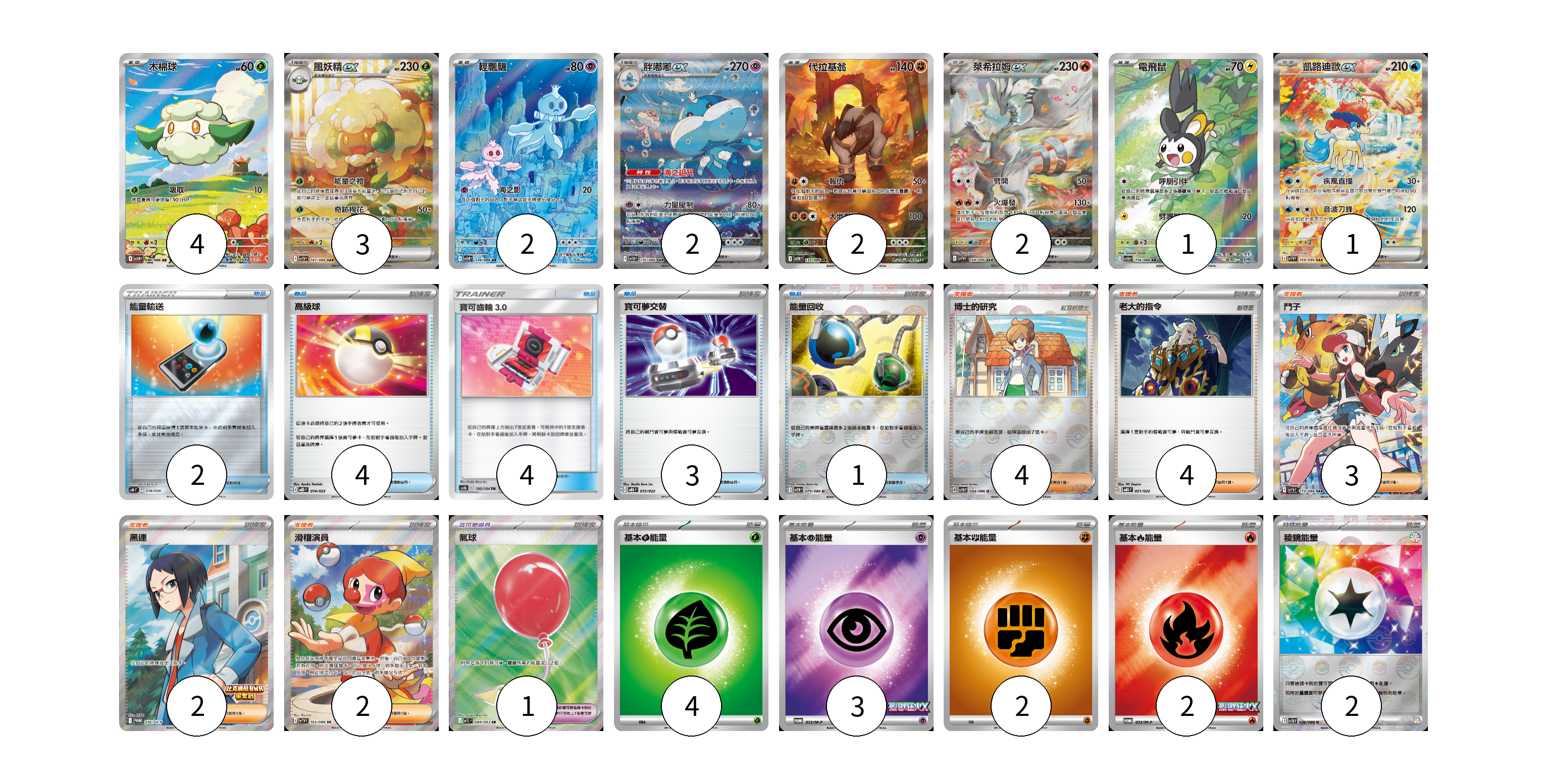 牌組構築方案 以此牌組為基礎新構築牌組 顯示卡面 顯示列表 寶可夢卡(17) 4 3 2 2 2 2 1 1 寶可夢道具(1) 1 物品卡(14) 2 4 4 3 1 支援者卡(15) 4 4 3 2 2 能量卡(13) 4 3 2 2 2 寶可夢卡(17) 卡牌名稱 張數 卡牌名稱 張數 木棉球 SV11W 090/086 04 風妖精ex SV11W 167/086 03 輕飄飄 SV11W 124/086 02 胖嘟嘟ex SV11W 170/086 02 代拉基翁 SV11W 133/086 02 萊希拉姆ex SV11W 168/086 02 電飛鼠 SV11B 116/086 01 凱路迪歐ex SV11W 169/086 01 寶可夢道具(1) 卡牌名稱 張數 卡牌名稱 張數 氣球 M1L 084/063 01 物品卡(14) 卡牌名稱 張數 卡牌名稱 張數 能量輸送 SO 018/030 02 高級球 MBD 014/022 04 寶可齒輪3.0 AS6b 190/194 04 寶可夢交替 MBG 015/022 03 能量回收 SV11W 079/086 01 支援者卡(15) 卡牌名稱 張數 卡牌名稱 張數 博士的研究 SV11B 084/086 04 老大的指令 MBG 021/022 04 鬥子 SV11W 173/086 03 黑連 SV-P 256/SV-P 02 滑稽演員 SV11W 165/086 02 能量卡(13) 卡牌名稱 張數 卡牌名稱 張數 基本【草】能量 M-P GRA 04 基本【超】能量 M-P 033/M-P 03 基本【鬥】能量 M-P FIG 02 基本【火】能量 M-P 032/M-P 02 稜鏡能量 SV11B 086/086 02 以此牌組為基礎新構築牌組 牌組編碼 aCVNgh-WDLHiU-eBINVt copy 列印牌組單 牌組編碼已複製 分享至SNS
