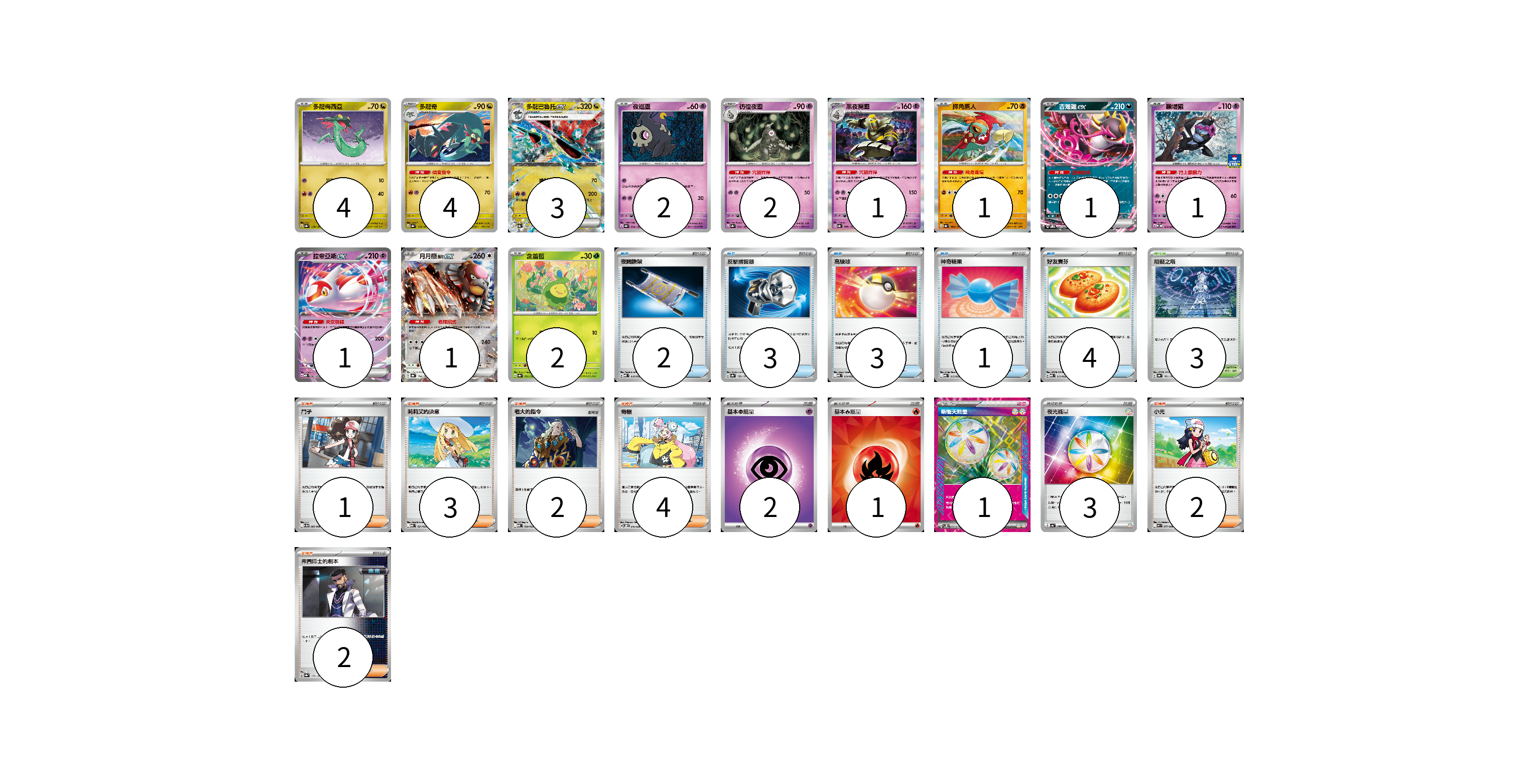 牌組構築方案 以此牌組為基礎新構築牌組 顯示卡面 顯示列表 寶可夢卡(23) 4 4 3 2 2 1 1 1 1 1 1 2 物品卡(13) 2 3 3 1 4 支援者卡(14) 1 3 2 4 2 2 競技場卡(3) 3 能量卡(7) 2 1 1 3 寶可夢卡(23) 卡牌名稱 張數 卡牌名稱 張數 多龍梅西亞 SV8a 118/187 04 多龍奇 SV8a 119/187 04 多龍巴魯托ex SV8a 120/187 03 夜巡靈 SV8a 064/187 02 彷徨夜靈 SV8a 065/187 02 黑夜魔靈 SV8a 066/187 01 摔角鷹人 SV8a 084/187 01 吉雉雞ex SVOD 004/020 01 願增猿 M-P 014/M-P 01 拉帝亞斯ex MBD 003/022 01 月月熊 赫月ex SV8a 134/187 01 含羞苞 SV8a 001/187 02 物品卡(13) 卡牌名稱 張數 卡牌名稱 張數 夜間擔架 MBD 016/022 02 反擊捕捉器 SV8a 139/187 03 高級球 MBD 014/022 03 神奇糖果 MBG 013/022 01 好友寶芬 MBD 013/022 04 支援者卡(14) 卡牌名稱 張數 卡牌名稱 張數 鬥子 SV11W 085/086 01 莉莉艾的決意 MBD 021/022 03 老大的指令 MBD 020/022 02 奇樹 SVOD 016/020 04 小光 M2 077/080 02 弗圖博士的劇本 SV8a 175/187 02 競技場卡(3) 卡牌名稱 張數 卡牌名稱 張數 阻礙之塔 SV8a 181/187 03 能量卡(7) 卡牌名稱 張數 卡牌名稱 張數 基本【超】能量 MBD PSY 02 基本【火】能量 SVQL FIR 01 新衝天能量 SV5K 071/071 01 夜光能量 SV4a 190/190 03 以此牌組為基礎新構築牌組 牌組編碼 aCbhrp-Ulkiel-laSxty copy 列印牌組單 牌組編碼已複製 分享至SNS
