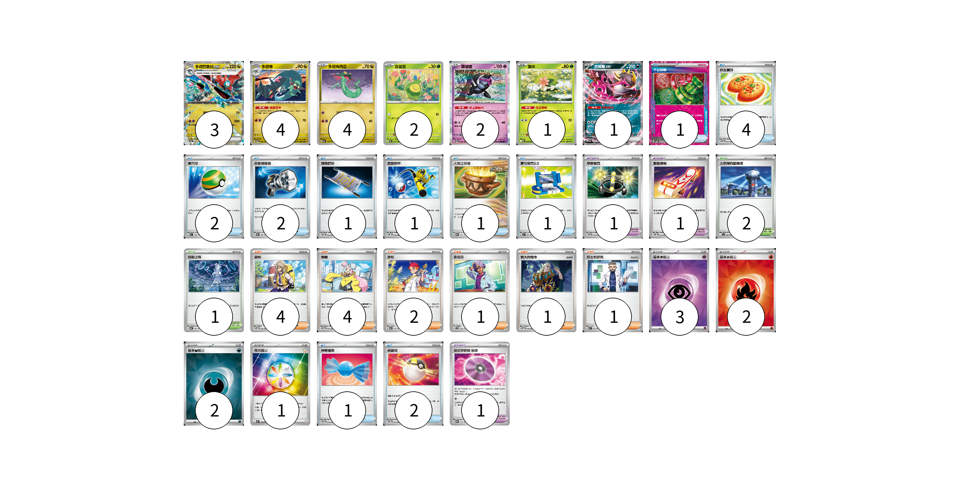 牌組構築方案 以此牌組為基礎新構築牌組 顯示卡面 顯示列表 寶可夢卡(17) 3 4 4 2 2 1 1 寶可夢道具(3) 1 1 1 物品卡(16) 1 4 2 2 1 1 1 1 1 2 支援者卡(13) 4 4 2 1 1 1 競技場卡(3) 2 1 能量卡(8) 3 2 2 1 寶可夢卡(17) 卡牌名稱 張數 卡牌名稱 張數 多龍巴魯托ex SV6 081/101 03 多龍奇 SV6 080/101 04 多龍梅西亞 SV8a 118/187 04 含羞苞 SV8a 001/187 02 願增猿 SV6 055/101 02 謝米 SV9a 006/063 01 吉雉雞ex SV8a 104/187 01 寶可夢道具(3) 卡牌名稱 張數 卡牌名稱 張數 學習裝置 SVTM 016/022 01 緊急滑板 SVOD 015/020 01 招式學習器 衰退 SV8a 161/187 01 物品卡(16) 卡牌名稱 張數 卡牌名稱 張數 不公印章 SV5a 053/066 01 好友寶芬 SVOD 011/020 04 巢穴球 SVM 133/175 02 反擊捕捉器 SV8a 139/187 02 夜間擔架 SVOM 016/021 01 厲害釣竿 SVOD 010/020 01 大地之容器 SV8a 143/187 01 寶可裝置3.0 SVK 021/042 01 神奇糖果 SVOD 013/020 01 高級球 SVOD 012/020 02 支援者卡(13) 卡牌名稱 張數 卡牌名稱 張數 派帕 SVOD 018/020 04 奇樹 SVOD 016/020 04 赤松 SV8a 163/187 02 吉尼亞 SVD 129/139 01 老大的指令 SVOD 019/020 01 博士的研究 SVK 033/042 01 競技場卡(3) 卡牌名稱 張數 卡牌名稱 張數 火箭隊的監視塔 SV10 096/098 02 阻礙之塔 SV8a 181/187 01 能量卡(8) 卡牌名稱 張數 卡牌名稱 張數 基本【超】能量 SVOD PSY 03 基本【火】能量 SVM FIR 02 基本【惡】能量 SVM DAR 02 夜光能量 SV4a 190/190 01 以此牌組為基礎新構築牌組 牌組編碼 aDgoUk-ikLFaQ-wqkTnv copy 列印牌組單 牌組編碼已複製 分享至SNS