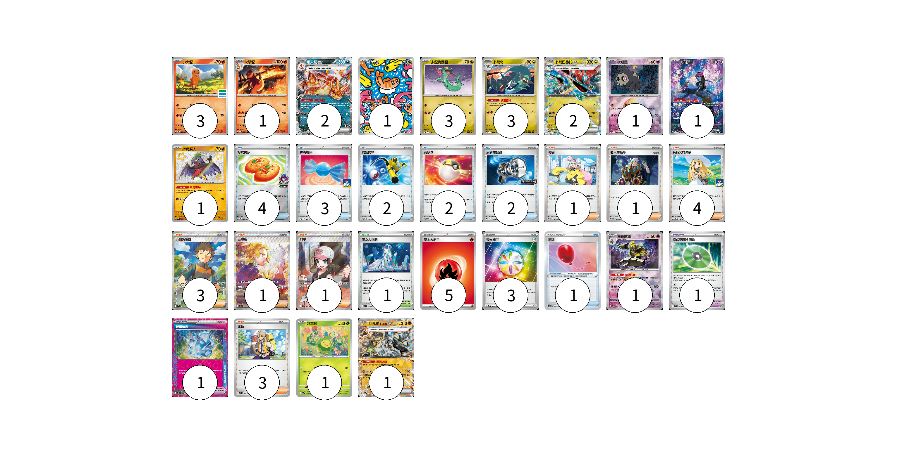 牌組構築方案 以此牌組為基礎新構築牌組 顯示卡面 顯示列表 寶可夢卡(21) 3 1 2 1 3 3 2 1 1 1 1 1 1 寶可夢道具(3) 1 1 1 物品卡(13) 4 3 2 2 2 支援者卡(14) 1 1 4 3 1 1 3 競技場卡(1) 1 能量卡(8) 5 3 寶可夢卡(21) 卡牌名稱 張數 卡牌名稱 張數 小火龍 SV-P 232/SV-P 03 火恐龍 SVQL 002/022 01 噴火龍ex SVTL 006/021 02 米立龍 SV6 112/101 01 多龍梅西亞 SV6 079/101 03 多龍奇 SV6 080/101 03 多龍巴魯托ex SV6 081/101 02 夜巡靈 SV8a 064/187 01 願增猿 SV6 107/101 01 摔角鷹人 SV4a 282/190 01 黑夜魔靈 SV8a 066/187 01 含羞苞 SV8a 001/187 01 厄鬼椪 礎石面具ex SV8a 091/187 01 寶可夢道具(3) 卡牌名稱 張數 卡牌名稱 張數 氣球 S8b 145/184 01 招式學習器 演進 SVK 025/042 01 璀璨結晶 SV7 094/102 01 物品卡(13) 卡牌名稱 張數 卡牌名稱 張數 好友寶芬 SV-P 230/SV-P 04 神奇糖果 SV-P 104/SV-P 03 厲害釣竿 SVTH 008/018 02 高級球 SVTL 012/021 02 反擊捕捉器 SV-P 136/SV-P 02 支援者卡(14) 卡牌名稱 張數 卡牌名稱 張數 奇樹 SVTM 017/022 01 老大的指令 SVTG 019/019 01 莉莉艾的決意 M-P 018/M-P 04 小剛的發掘 SV9 123/100 03 白蕾雅 SV7 132/102 01 鬥子 SV11W 166/086 01 派帕 SV4a 180/190 03 競技場卡(1) 卡牌名稱 張數 卡牌名稱 張數 零之大空洞 SV7 102/102 01 能量卡(8) 卡牌名稱 張數 卡牌名稱 張數 基本火能量 sv-p FIR 05 夜光能量 SVK 042/042 03 以此牌組為基礎新構築牌組 牌組編碼 aDxhBf-FZkBRo-fGBLme copy 列印牌組單 牌組編碼已複製 分享至SNS
