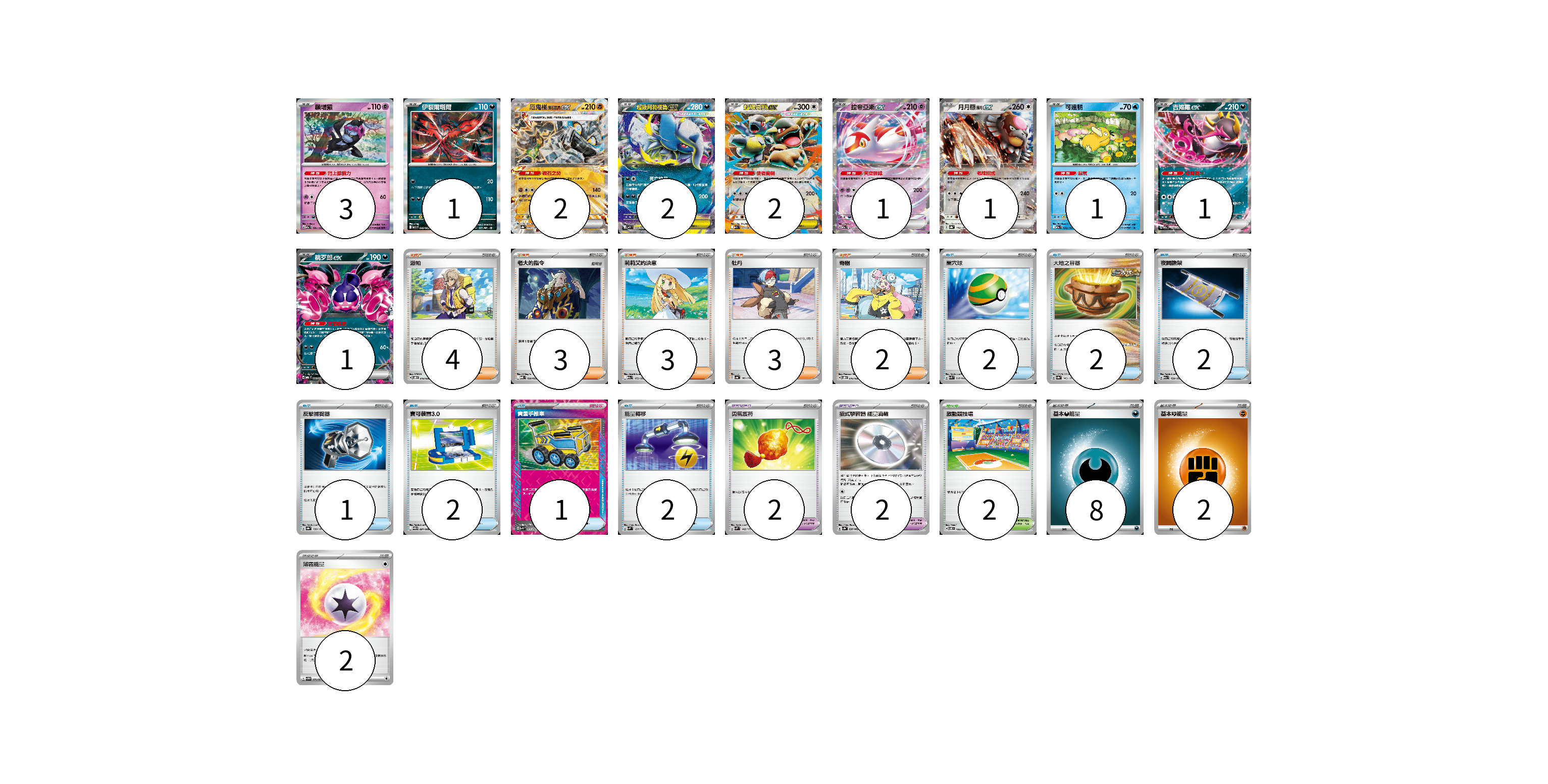 牌組構築方案 以此牌組為基礎新構築牌組 顯示卡面 顯示列表 寶可夢卡(15) 3 1 2 2 2 1 1 1 1 1 寶可夢道具(4) 2 2 物品卡(12) 2 2 2 1 2 1 2 支援者卡(15) 4 3 3 3 2 競技場卡(2) 2 能量卡(12) 8 2 2 寶可夢卡(15) 卡牌名稱 張數 卡牌名稱 張數 願增猿 M2a 081/193 03 伊裴爾塔爾 M1L 040/063 01 厄鬼椪 礎石面具ex SV8a 091/187 02 超級阿勃梭魯ex M1L 038/063 02 超級袋獸ex M1S 051/063 02 拉帝亞斯ex M2a 075/193 01 月月熊 赫月ex SV8a 134/187 01 可達鴨 M2a 032/193 01 吉雉雞ex M2a 114/193 01 桃歹郎ex MBG 009/022 01 寶可夢道具(4) 卡牌名稱 張數 卡牌名稱 張數 勇氣護符 SVM 142/175 02 招式學習器 能量渦輪 SV3a 056/062 02 物品卡(12) 卡牌名稱 張數 卡牌名稱 張數 巢穴球 SVK 016/042 02 大地之容器 SV8a 143/187 02 夜間擔架 M2a 159/193 02 反擊捕捉器 SV8a 139/187 01 寶可裝置3.0 SV11B 081/086 02 貴重手推車 SVK 020/042 01 能量轉移 SVM 127/175 02 支援者卡(15) 卡牌名稱 張數 卡牌名稱 張數 派帕 SVOD 018/020 04 老大的指令 MBD 020/022 03 莉莉艾的決意 M2a 175/193 03 牡丹 SV4a 182/190 03 奇樹 SVOD 016/020 02 競技場卡(2) 卡牌名稱 張數 卡牌名稱 張數 激動競技場 SV8 105/106 02 能量卡(12) 卡牌名稱 張數 卡牌名稱 張數 基本【惡】能量 MBG DAR 08 基本【鬥】能量 M-P FIG 02 薄霧能量 SV5M 071/071 02 以此牌組為基礎新構築牌組 牌組編碼 aFhxqK-kpXuda-bGOAyX copy 列印牌組單 牌組編碼已複製 分享至SNS