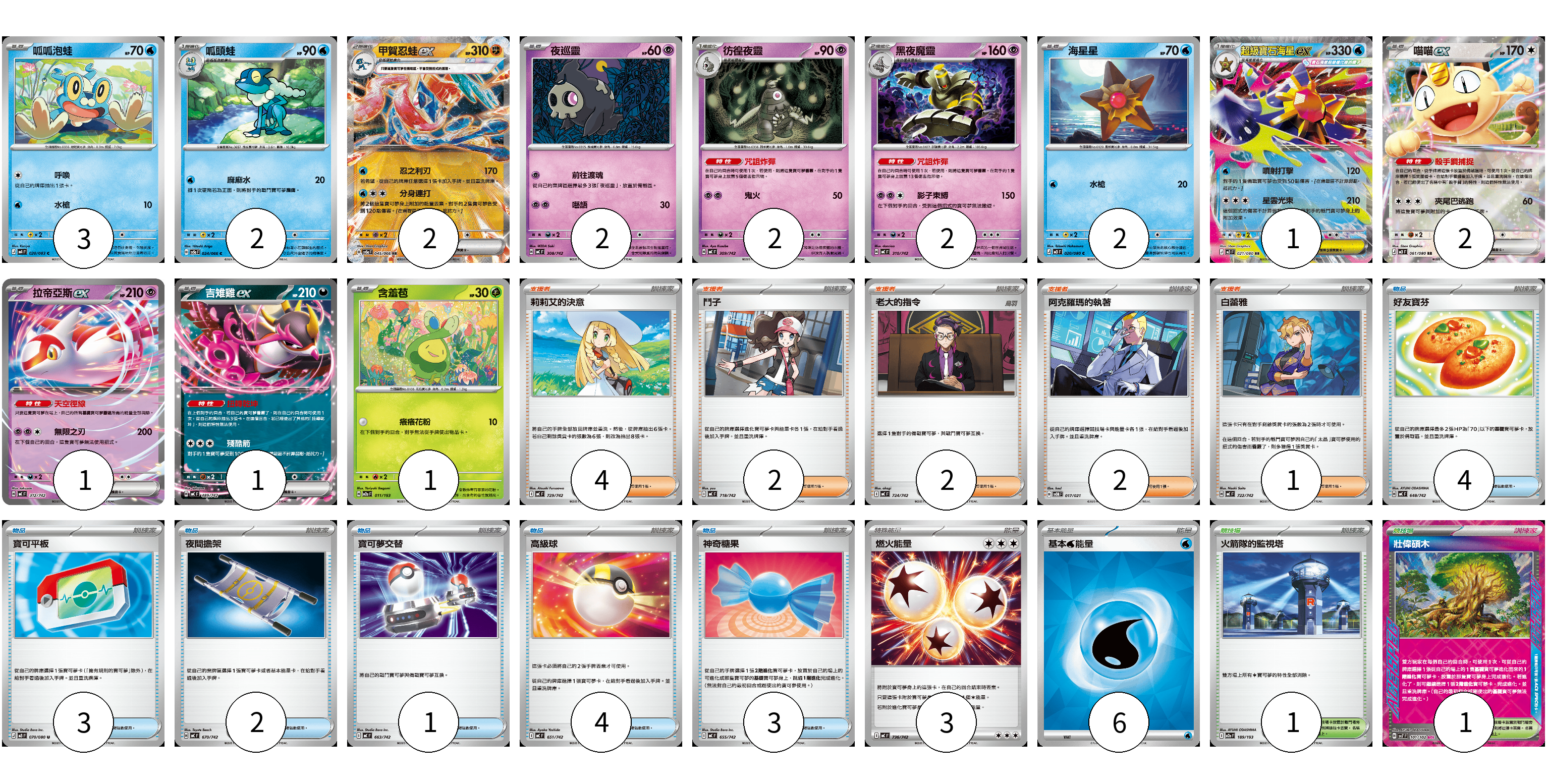 牌組構築方案 以此牌組為基礎新構築牌組 顯示卡面 顯示列表 寶可夢卡(21) 3 2 2 2 2 2 2 1 2 1 1 1 物品卡(17) 4 3 2 1 4 3 支援者卡(11) 4 2 2 2 1 競技場卡(2) 1 1 能量卡(9) 3 6 寶可夢卡(21) 卡牌名稱 張數 卡牌名稱 張數 呱呱泡蛙 M4 020/083 03 呱頭蛙 SV5a 024/066 02 甲賀忍蛙ex SV5a 045/066 02 夜巡靈 MC 308/742 02 彷徨夜靈 MC 309/742 02 黑夜魔靈 MC 310/742 02 海星星 M3 020/080 02 超級寶石海星ex M3 021/080 01 喵喵ex M3 061/080 02 拉帝亞斯ex MC 312/742 01 吉雉雞ex MC 489/742 01 含羞苞 M2a 011/193 01 物品卡(17) 卡牌名稱 張數 卡牌名稱 張數 好友寶芬 MC 648/742 04 寶可平板 M3 070/080 03 夜間擔架 MC 670/742 02 寶可夢交替 MC 663/742 01 高級球 MC 651/742 04 神奇糖果 MC 655/742 03 支援者卡(11) 卡牌名稱 張數 卡牌名稱 張數 莉莉艾的決意 MC 729/742 04 鬥子 MC 718/742 02 老大的指令 MC 724/742 02 阿克羅瑪的執著 SVOM 017/021 02 白蕾雅 MC 722/742 01 競技場卡(2) 卡牌名稱 張數 卡牌名稱 張數 火箭隊的監視塔 M2a 189/193 01 壯偉碩木 SV7 101/102 01 能量卡(9) 卡牌名稱 張數 卡牌名稱 張數 燃火能量 MC 736/742 03 基本【水】能量 SVM WAT 06 以此牌組為基礎新構築牌組 牌組編碼 aGogur-yyCpXk-aPfowd copy 列印牌組單 牌組編碼已複製 分享至SNS