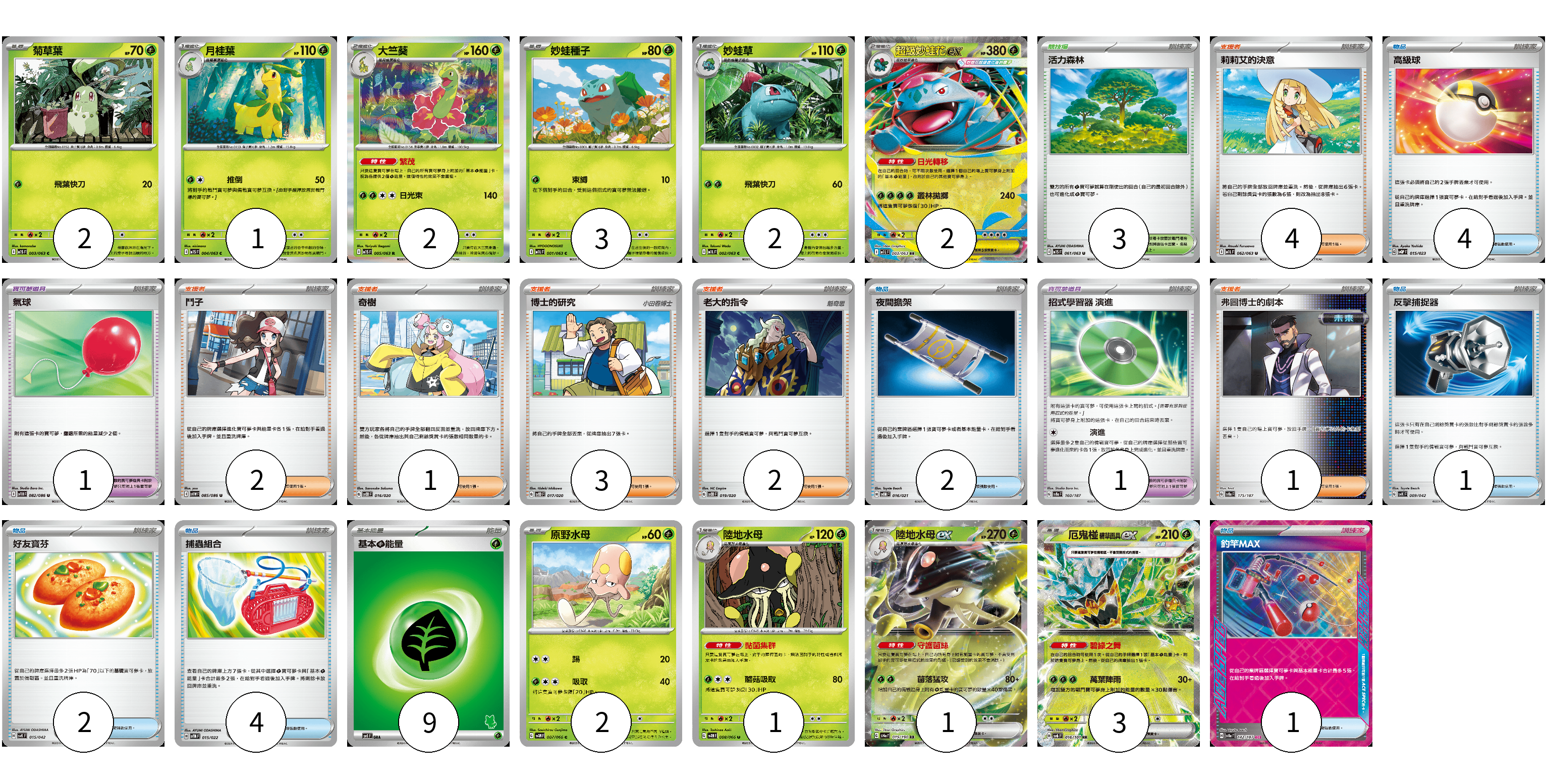 牌組構築方案 以此牌組為基礎新構築牌組 顯示卡面 顯示列表 寶可夢卡(19) 2 1 2 3 2 2 2 1 1 3 寶可夢道具(2) 1 1 物品卡(14) 4 2 1 2 4 1 支援者卡(13) 4 2 1 3 2 1 競技場卡(3) 3 能量卡(9) 9 寶可夢卡(19) 卡牌名稱 張數 卡牌名稱 張數 菊草葉 M1S 003/063 02 月桂葉 M1S 004/063 01 大竺葵 M1S 005/063 02 妙蛙種子 M1L 001/063 03 妙蛙草 M1L 002/063 02 超級妙蛙花ex M1L 003/063 02 原野水母 SV4M 007/066 02 陸地水母 SV4M 008/066 01 陸地水母ex SV4a 019/190 01 厄鬼椪 碧草面具ex SV6 016/101 03 寶可夢道具(2) 卡牌名稱 張數 卡牌名稱 張數 氣球 SV11B 082/086 01 招式學習器 演進 SV8a 160/187 01 物品卡(14) 卡牌名稱 張數 卡牌名稱 張數 高級球 SVQP 015/023 04 夜間擔架 SVOM 016/021 02 反擊捕捉器 SVK 009/042 01 好友寶芬 SVK 015/042 02 捕蟲組合 SVTM 015/022 04 釣竿MAX SV8a 142/187 01 支援者卡(13) 卡牌名稱 張數 卡牌名稱 張數 莉莉艾的決意 M1L 062/063 04 鬥子 SV11W 085/086 02 奇樹 SVOD 016/020 01 博士的研究 SVOD 017/020 03 老大的指令 SVOD 019/020 02 弗圖博士的劇本 SV8a 175/187 01 競技場卡(3) 卡牌名稱 張數 卡牌名稱 張數 活力森林 M1S 061/063 03 能量卡(9) 卡牌名稱 張數 卡牌名稱 張數 基本【草】能量 SVI GRA 09 以此牌組為基礎新構築牌組 牌組編碼 aHAInM-RyuKXZ-AtYNYK copy 列印牌組單 牌組編碼已複製 分享至SNS
