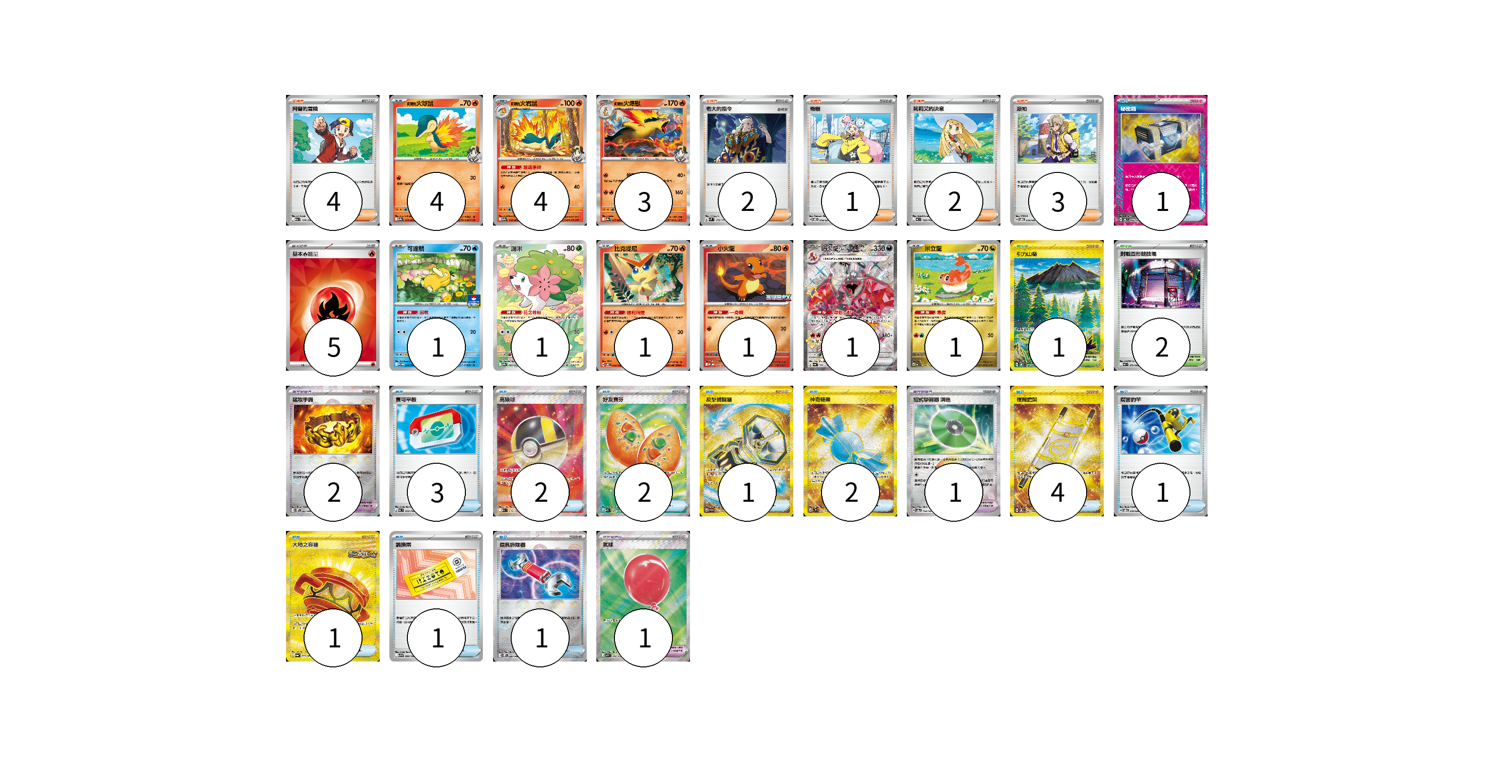 牌組構築方案 以此牌組為基礎新構築牌組 顯示卡面 顯示列表 寶可夢卡(17) 4 4 3 1 1 1 1 1 1 寶可夢道具(4) 2 1 1 物品卡(19) 1 3 2 2 1 2 4 1 1 1 1 支援者卡(12) 4 2 1 2 3 競技場卡(3) 1 2 能量卡(5) 5 寶可夢卡(17) 卡牌名稱 張數 卡牌名稱 張數 <阿響的>火球鼠 SV9a 015/063 04 <阿響的>火岩鼠 SV9a 016/063 04 <阿響的>火爆獸 SV9a 017/063 03 可達鴨 SV-P 220/SV-P 01 謝米 SV9a 066/063 01 比克提尼 SV8 012/106 01 小火龍 M-P 020/M-P 01 噴火龍ex SV4a 331/190 01 米立龍 MC 549/742 01 寶可夢道具(4) 卡牌名稱 張數 卡牌名稱 張數 猛攻手鐲 SV11W 082/086 02 招式學習器 演進 SV8a 160/187 01 氣球 M1L 084/063 01 物品卡(19) 卡牌名稱 張數 卡牌名稱 張數 秘密箱 SV6 092/101 01 寶可平板 MC 662/742 03 高級球 M2a 216/193 02 好友寶芬 M1S 081/063 02 反擊捕捉器 SV4M 094/066 01 神奇糖果 SV1V 107/078 02 夜間擔架 SV8 137/106 04 厲害釣竿 SVOD 010/020 01 大地之容器 SV6a 093/064 01 調換票 SV9 090/100 01 道具拆除器 SV11W 080/086 01 支援者卡(12) 卡牌名稱 張數 卡牌名稱 張數 阿響的冒險 M2a 174/193 04 老大的指令 SVM 172/175 02 奇樹 SVOM 018/021 01 莉莉艾的決意 MC 729/742 02 派帕 SVOD 018/020 03 競技場卡(3) 卡牌名稱 張數 卡牌名稱 張數 引力山岳 SV8 138/106 01 對戰圓形競技場 M2 079/080 02 能量卡(5) 卡牌名稱 張數 卡牌名稱 張數 基本【火】能量 SVQL FIR 05 以此牌組為基礎新構築牌組 牌組編碼 aHFClJ-yfQpKB-yhokyv copy 列印牌組單 牌組編碼已複製 分享至SNS