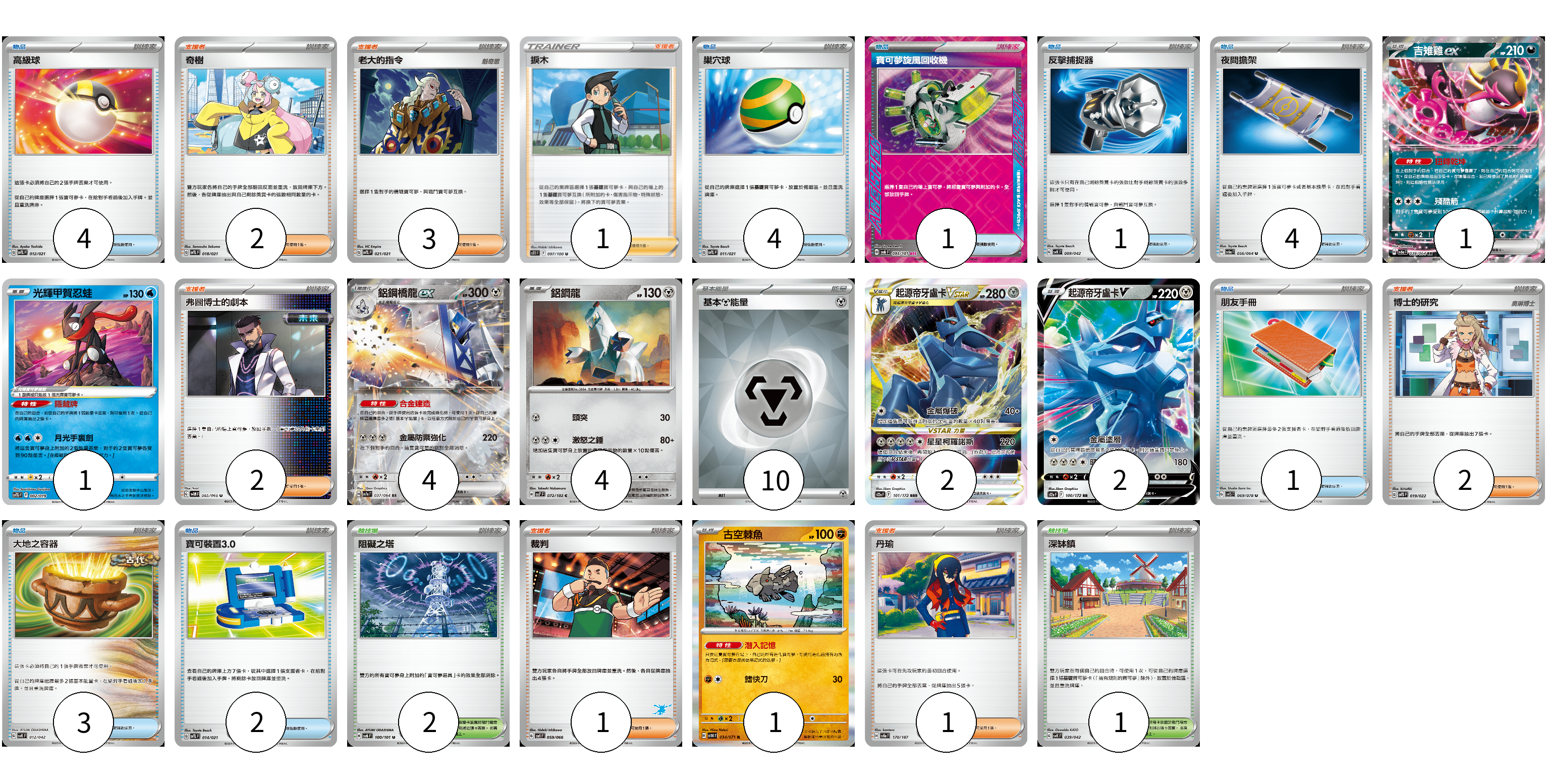 牌組構築方案 以此牌組為基礎新構築牌組 顯示卡面 顯示列表 寶可夢卡(15) 1 1 4 4 2 2 1 寶可夢道具(2) 2 物品卡(20) 4 4 1 1 4 1 3 2 支援者卡(10) 3 1 2 2 1 1 競技場卡(3) 2 1 能量卡(10) 10 寶可夢卡(15) 卡牌名稱 張數 卡牌名稱 張數 吉雉雞ex SV6a 038/064 01 光輝甲賀忍蛙 SVTG 002/019 01 鋁鋼橋龍ex SV7a 037/064 04 鋁鋼龍 SV7 072/102 04 起源帝牙盧卡VSTAR S12a 101/172 02 起源帝牙盧卡V S12a 100/172 02 古空棘魚 SV5K 034/071 01 寶可夢道具(2) 卡牌名稱 張數 卡牌名稱 張數 奇樹 SVTL 018/021 02 物品卡(20) 卡牌名稱 張數 卡牌名稱 張數 高級球 SVTL 012/021 04 巢穴球 SVTL 011/021 04 寶可夢旋風回收機 SV6 093/101 01 反擊捕捉器 SVK 009/042 01 夜間擔架 SV6a 056/064 04 朋友手冊 SV1S 069/078 01 大地之容器 SVK 012/042 03 寶可裝置3.0 SVTL 014/021 02 支援者卡(10) 卡牌名稱 張數 卡牌名稱 張數 老大的指令 SVTL 021/021 03 捩木 S11 097/100 01 弗圖博士的劇本 SV4M 065/066 02 博士的研究 SVTS 019/022 02 裁判 SVI 059/066 01 丹瑜 SV8a 170/187 01 競技場卡(3) 卡牌名稱 張數 卡牌名稱 張數 阻礙之塔 SV6 100/101 02 深缽鎮 SVK 039/042 01 能量卡(10) 卡牌名稱 張數 卡牌名稱 張數 基本【鋼】能量 SVK MET 10 以此牌組為基礎新構築牌組 牌組編碼 aHFbuf-YRMJCs-ULdymt copy 列印牌組單 牌組編碼已複製 分享至SNS