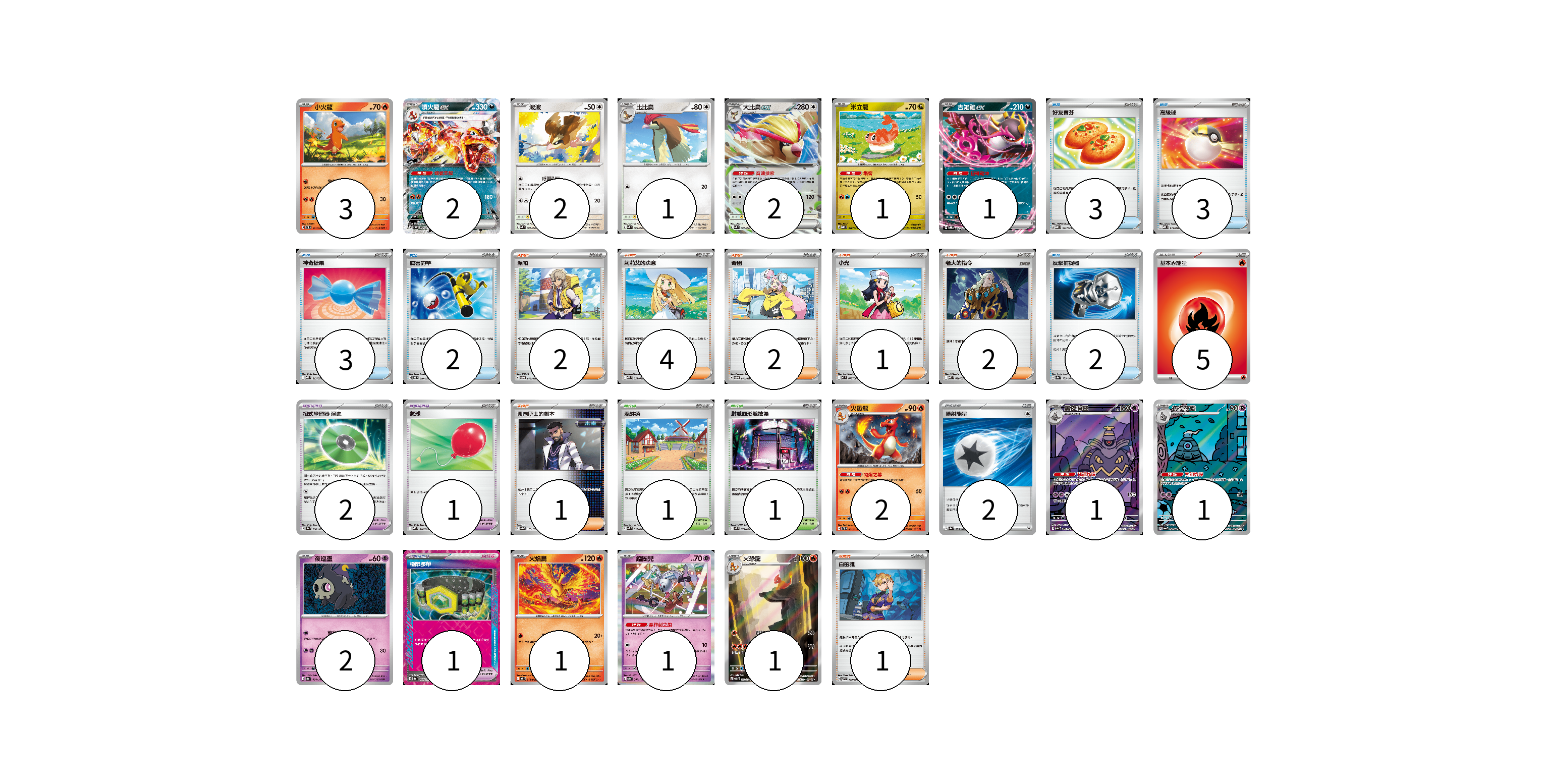 牌組構築方案 以此牌組為基礎新構築牌組 顯示卡面 顯示列表 寶可夢卡(21) 3 2 2 1 2 1 1 2 1 1 2 1 1 1 寶可夢道具(4) 2 1 1 物品卡(13) 3 3 3 2 2 支援者卡(13) 2 4 2 1 2 1 1 競技場卡(2) 1 1 能量卡(7) 5 2 寶可夢卡(21) 卡牌名稱 張數 卡牌名稱 張數 小火龍 SVTL 001/021 03 噴火龍ex SV3 066/108 02 波波 SVK 003/042 02 比比鳥 SVK 004/042 01 大比鳥ex SVK 005/042 02 米立龍 MBD 010/022 01 吉雉雞ex SVOD 004/020 01 火恐龍 SVTL 002/021 02 黑夜魔靈 SV6a 070/064 01 彷徨夜靈 SV6a 069/064 01 夜巡靈 SV8a 064/187 02 火焰鳥 M2 014/080 01 鑰圈兒 SV4a 087/190 01 火恐龍 SV2a 169/165 01 寶可夢道具(4) 卡牌名稱 張數 卡牌名稱 張數 招式學習器 演進 SV8a 160/187 02 氣球 MBD 018/022 01 極限腰帶 SV8a 159/187 01 物品卡(13) 卡牌名稱 張數 卡牌名稱 張數 好友寶芬 MBD 013/022 03 高級球 MBD 014/022 03 神奇糖果 MBG 013/022 03 厲害釣竿 SVOD 010/020 02 反擊捕捉器 SV8a 139/187 02 支援者卡(13) 卡牌名稱 張數 卡牌名稱 張數 派帕 SVOD 018/020 02 莉莉艾的決意 MBD 021/022 04 奇樹 SVOD 016/020 02 小光 M2 077/080 01 老大的指令 MBD 020/022 02 弗圖博士的劇本 SV8a 175/187 01 白蕾雅 SV7 100/102 01 競技場卡(2) 卡牌名稱 張數 卡牌名稱 張數 深缽鎮 SVK 039/042 01 對戰圓形競技場 M2 079/080 01 能量卡(7) 卡牌名稱 張數 卡牌名稱 張數 基本火能量 sv-p FIR 05 噴射能量 SV8a 185/187 02 以此牌組為基礎新構築牌組 牌組編碼 aJSNKV-exMMHh-KNomPZ copy 列印牌組單 牌組編碼已複製 分享至SNS
