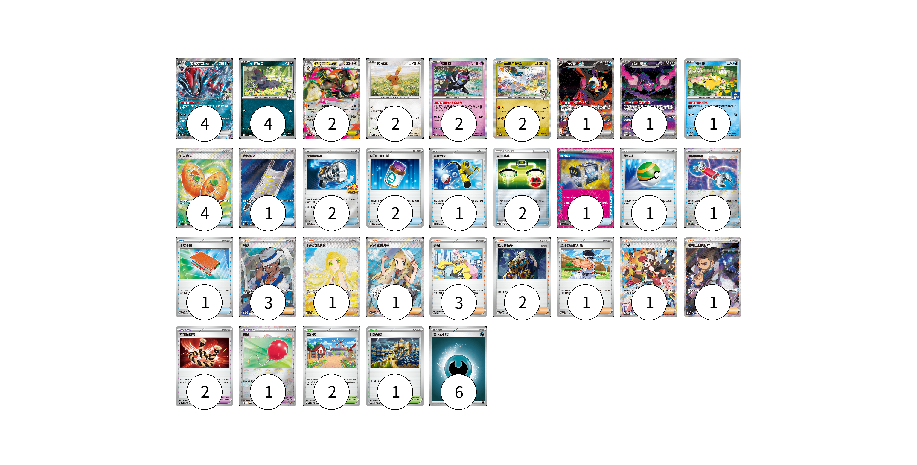 牌組構築方案 以此牌組為基礎新構築牌組 顯示卡面 顯示列表 寶可夢卡(19) 4 4 2 2 2 2 1 1 1 寶可夢道具(3) 2 1 物品卡(16) 4 1 2 2 1 2 1 1 1 1 支援者卡(13) 3 1 1 3 2 1 1 1 競技場卡(3) 2 1 能量卡(6) 6 寶可夢卡(19) 卡牌名稱 張數 卡牌名稱 張數 N的索羅亞克ex SV9 061/100 04 N的索羅亞 SV9 060/100 04 超級長耳兔ex M2 072/080 02 捲捲耳 M2 071/080 02 願增猿 SV6 055/101 02 N的萊希拉姆 SV9 074/100 02 吉雉雞ex SV6a 089/064 01 桃歹郎ex SV6a 090/064 01 可達鴨 SV-P 220/SV-P 01 寶可夢道具(3) 卡牌名稱 張數 卡牌名稱 張數 不服輸頭帶 SV1S 073/078 02 氣球 SV11B 082/086 01 物品卡(16) 卡牌名稱 張數 卡牌名稱 張數 好友寶芬 M1S 081/063 04 夜間擔架 M1L 083/063 01 反擊捕捉器 SV-P 083/SV-P 02 N的PP提升劑 SV9 089/100 02 厲害釣竿 SVOD 010/020 01 能量轉移 SO 017/030 02 秘密箱 SV6 092/101 01 巢穴球 SVM 133/175 01 道具拆除器 SV11W 080/086 01 朋友手冊 SVK 014/042 01 支援者卡(13) 卡牌名稱 張數 卡牌名稱 張數 席藍 SV8 127/106 03 莉莉艾的決意 M1L 091/063 01 莉莉艾的決意 M1L 086/063 01 奇樹 SVTS 018/022 03 老大的指令 MBD 020/022 02 空手道王的演練 SVM 144/175 01 鬥子 SV11W 173/086 01 弗圖博士的劇本 SV4M 086/066 01 競技場卡(3) 卡牌名稱 張數 卡牌名稱 張數 深缽鎮 SV1a 070/073 02 N的城堡 SV9 097/100 01 能量卡(6) 卡牌名稱 張數 卡牌名稱 張數 基本【惡】能量 MBG DAR 06 以此牌組為基礎新構築牌組 牌組編碼 aJTolc-PoWNLU-fGofFp copy 列印牌組單 牌組編碼已複製 分享至SNS
