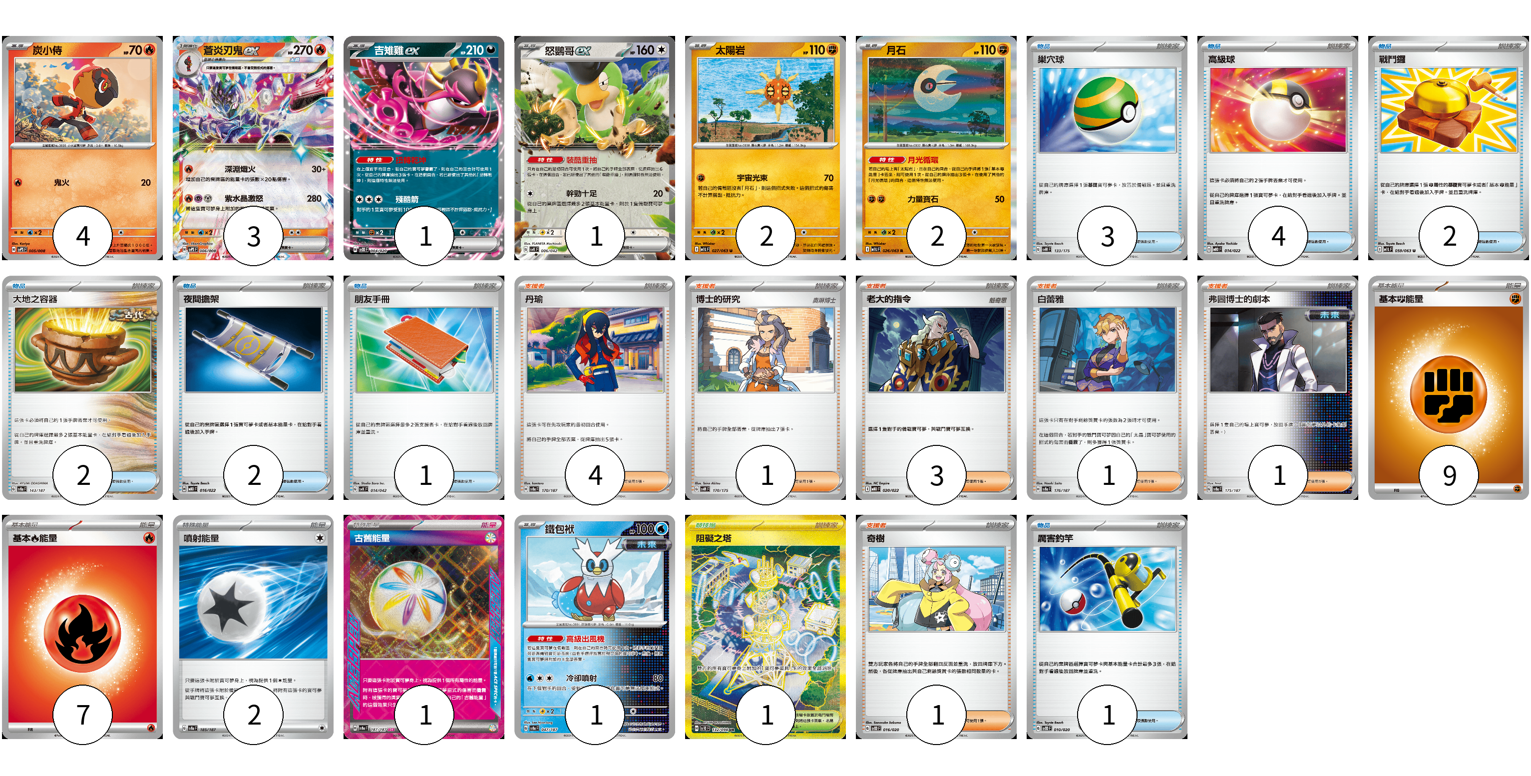 牌組構築方案 以此牌組為基礎新構築牌組 顯示卡面 顯示列表 寶可夢卡(14) 4 3 1 1 2 2 1 物品卡(15) 3 4 2 2 2 1 1 支援者卡(11) 4 1 3 1 1 1 競技場卡(1) 1 能量卡(19) 9 7 2 1 寶可夢卡(14) 卡牌名稱 張數 卡牌名稱 張數 炭小侍 SVPS 005/008 04 蒼炎刃鬼ex SVPS 006/008 03 吉雉雞ex SVOD 004/020 01 怒鸚哥ex SVK 006/042 01 太陽岩 M1L 027/063 02 月石 M1L 026/063 02 鐵包袱 SV8a 047/187 01 物品卡(15) 卡牌名稱 張數 卡牌名稱 張數 巢穴球 SVM 133/175 03 高級球 MBD 014/022 04 戰鬥鑼 M1L 059/063 02 大地之容器 SV8a 143/187 02 夜間擔架 MBD 016/022 02 朋友手冊 SVK 014/042 01 厲害釣竿 SVOD 010/020 01 支援者卡(11) 卡牌名稱 張數 卡牌名稱 張數 丹瑜 SV8a 170/187 04 博士的研究 SVM 170/175 01 老大的指令 MBD 020/022 03 白蕾雅 SV8a 176/187 01 弗圖博士的劇本 SV8a 175/187 01 奇樹 SVOD 016/020 01 競技場卡(1) 卡牌名稱 張數 卡牌名稱 張數 阻礙之塔 SV10 132/098 01 能量卡(19) 卡牌名稱 張數 卡牌名稱 張數 基本【鬥】能量 M-P FIG 09 基本【火】能量 M-P FIR 07 噴射能量 SV8a 185/187 02 古舊能量 SV8a 187/187 01 以此牌組為基礎新構築牌組 牌組編碼 aMqAJt-nMqnkj-LLttIT copy 列印牌組單 牌組編碼已複製 分享至SNS