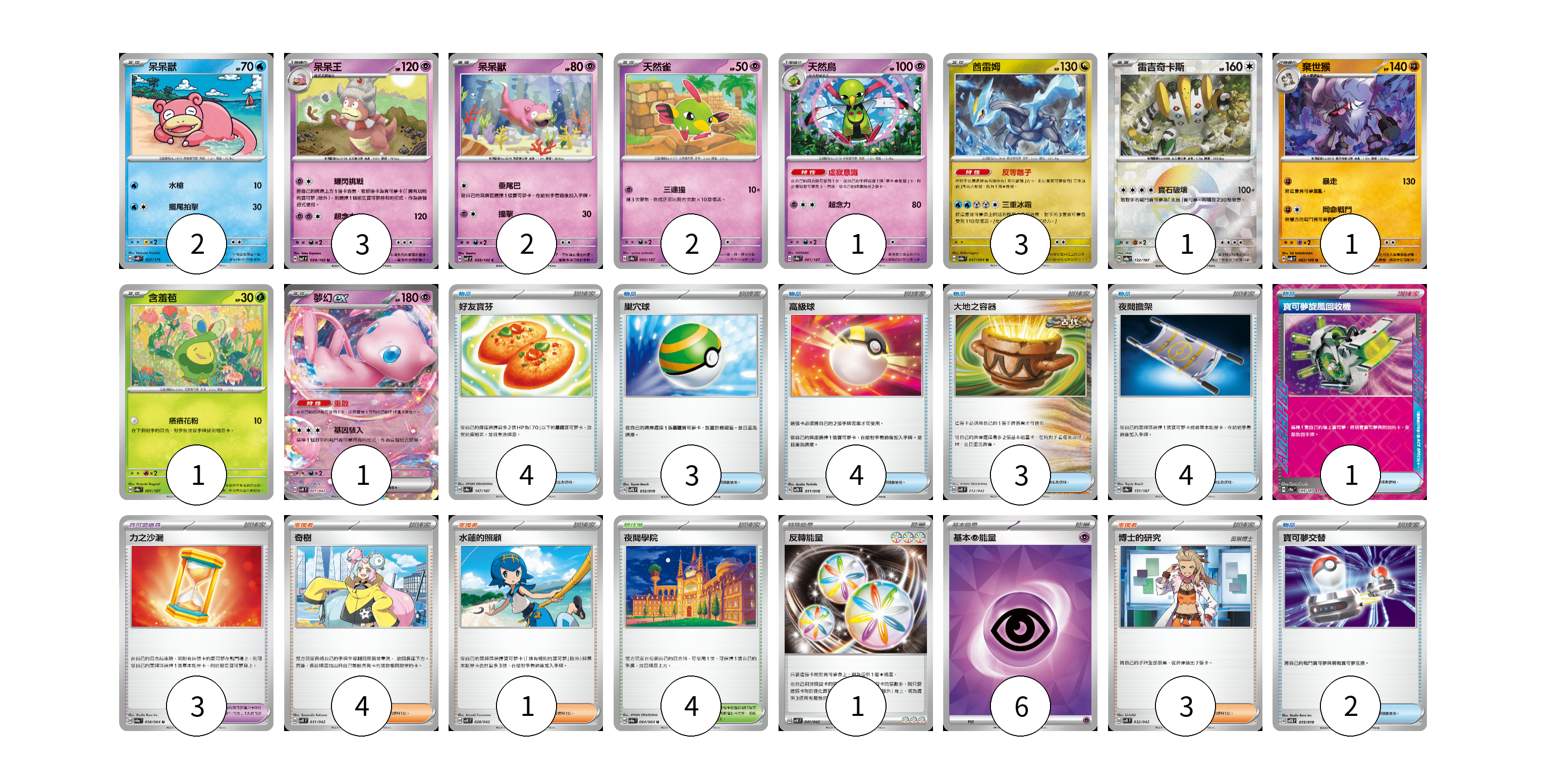 牌組構築方案 以此牌組為基礎新構築牌組 顯示卡面 顯示列表 寶可夢卡(17) 2 3 2 2 1 3 1 1 1 1 寶可夢道具(3) 3 物品卡(21) 4 3 4 3 4 1 2 支援者卡(8) 4 1 3 競技場卡(4) 4 能量卡(7) 1 6 寶可夢卡(17) 卡牌名稱 張數 卡牌名稱 張數 呆呆獸 SVM 027/175 02 呆呆王 SV7 039/102 03 呆呆獸 SV7 038/102 02 天然雀 SV8a 060/187 02 天然鳥 SV8a 061/187 01 酋雷姆 SV6a 047/064 03 雷吉奇卡斯 SV8a 132/187 01 棄世猴 SV8 062/106 01 含羞苞 SV8a 001/187 01 夢幻ex SVK 001/042 01 寶可夢道具(3) 卡牌名稱 張數 卡牌名稱 張數 力之沙漏 SV6a 058/064 03 物品卡(21) 卡牌名稱 張數 卡牌名稱 張數 好友寶芬 SV8a 147/187 04 巢穴球 SVTG 012/019 03 高級球 SVTH 011/018 04 大地之容器 SVK 012/042 03 夜間擔架 SV8a 151/187 04 寶可夢旋風回收機 SV8a 149/187 01 寶可夢交替 SVTG 015/019 02 支援者卡(8) 卡牌名稱 張數 卡牌名稱 張數 奇樹 SVK 031/042 04 水蓮的照顧 SVK 028/042 01 博士的研究 SVK 032/042 03 競技場卡(4) 卡牌名稱 張數 卡牌名稱 張數 夜間學院 SV6a 064/064 04 能量卡(7) 卡牌名稱 張數 卡牌名稱 張數 反轉能量 SVK 041/042 01 基本【超】能量 SVK PSY 06 以此牌組為基礎新構築牌組 牌組編碼 aMqLcx-GztWVz-bxEKgM copy 列印牌組單 牌組編碼已複製 分享至SNS