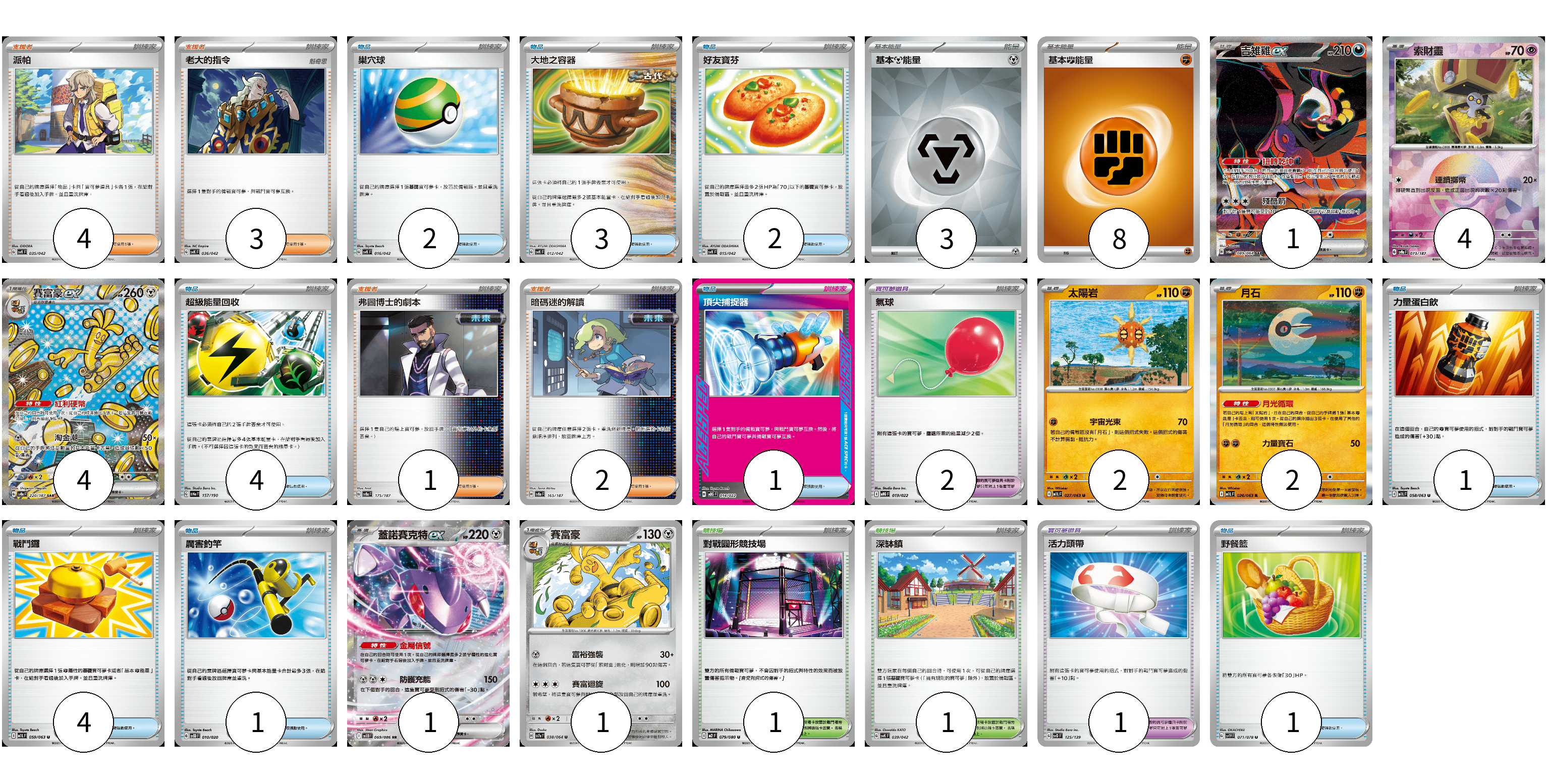 牌組構築方案 以此牌組為基礎新構築牌組 顯示卡面 顯示列表 寶可夢卡(15) 1 4 4 2 2 1 1 寶可夢道具(3) 2 1 物品卡(19) 2 3 2 4 1 1 4 1 1 支援者卡(10) 4 3 1 2 競技場卡(2) 1 1 能量卡(11) 3 8 寶可夢卡(15) 卡牌名稱 張數 卡牌名稱 張數 吉雉雞ex SV6a 089/064 01 索財靈 SV8a 073/187 04 賽富豪ex SV8a 220/187 04 太陽岩 M1L 027/063 02 月石 M1L 026/063 02 蓋諾賽克特ex SV11B 069/086 01 賽富豪 SV7a 038/064 01 寶可夢道具(3) 卡牌名稱 張數 卡牌名稱 張數 氣球 MBG 019/022 02 活力頭帶 SVD 125/139 01 物品卡(19) 卡牌名稱 張數 卡牌名稱 張數 巢穴球 SVK 016/042 02 大地之容器 SVK 012/042 03 好友寶芬 SVK 015/042 02 超級能量回收 SV4a 157/190 04 頂尖捕捉器 MBG 014/022 01 力量蛋白飲 M1L 058/063 01 戰鬥鑼 M1L 059/063 04 厲害釣竿 SVOD 010/020 01 野餐籃 SV1V 071/078 01 支援者卡(10) 卡牌名稱 張數 卡牌名稱 張數 派帕 SVK 035/042 04 老大的指令 SVK 036/042 03 弗圖博士的劇本 SV8a 175/187 01 暗碼迷的解讀 SV8a 165/187 02 競技場卡(2) 卡牌名稱 張數 卡牌名稱 張數 對戰圓形競技場 M2 079/080 01 深缽鎮 SVK 039/042 01 能量卡(11) 卡牌名稱 張數 卡牌名稱 張數 基本【鋼】能量 SVOD MET 03 基本【鬥】能量 SVHK FIG 08 以此牌組為基礎新構築牌組 牌組編碼 aNAEWX-kgxmuh-aIFUlH copy 列印牌組單 牌組編碼已複製 分享至SNS