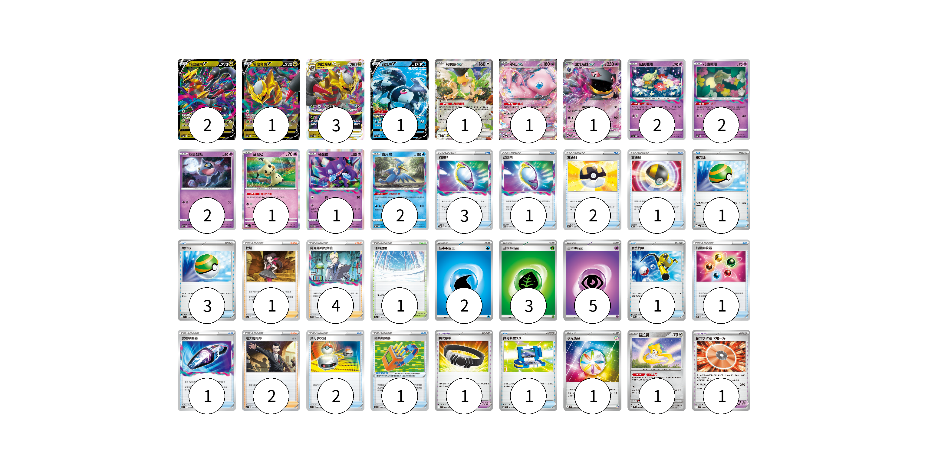 牌組構築方案 以此牌組為基礎新構築牌組 顯示卡面 顯示列表 寶可夢卡(21) 2 1 3 1 1 1 1 2 2 2 1 1 2 1 寶可夢道具(3) 1 1 1 物品卡(17) 3 1 2 1 1 3 1 1 1 2 1 支援者卡(7) 1 4 2 競技場卡(1) 1 能量卡(11) 2 3 5 1 寶可夢卡(21) 卡牌名稱 張數 卡牌名稱 張數 騎拉帝納V S12a 110/172 02 騎拉帝納V S11 080/100 01 騎拉帝納VSTAR S12a 111/172 03 霓虹魚V S12a 026/172 01 怒鸚哥ex SV2P 065/071 01 夢幻ex SV4a 076/190 01 詛咒娃娃ex SV1V 041/078 01 花療環環 S12a 064/172 02 花療環環 S11 049/100 02 怨影娃娃 S11 045/100 02 謎擬Q SV2P 034/071 01 勾魂眼 S11 044/100 01 古月鳥 S11 033/100 02 基拉祈 SV3a 042/062 01 寶可夢道具(3) 卡牌名稱 張數 卡牌名稱 張數 道具妨礙器 S5R 064/070 01 講究腰帶 SVB 006/028 01 招式學習器 火場一爆 SV4a 170/190 01 物品卡(17) 卡牌名稱 張數 卡牌名稱 張數 幻想門 S12a 141/172 03 幻想門 S11 092/100 01 高級球 S12a 138/172 02 高級球 SN 016/024 01 巢穴球 SV4a 159/190 01 巢穴球 SV1S 070/078 03 厲害釣竿 SV4a 158/190 01 能量回收器 S5R 062/070 01 放逐吸塵器 S11 093/100 01 寶可夢交替 S11a 061/068 02 寶可裝置3.0 SVEM 014/020 01 支援者卡(7) 卡牌名稱 張數 卡牌名稱 張數 杜娟 S9a 065/067 01 阿克羅瑪的實驗 S11 095/100 04 老大的指令(坂木) SJ 026/028 02 競技場卡(1) 卡牌名稱 張數 卡牌名稱 張數 通頂雪道 S12a 165/172 01 能量卡(11) 卡牌名稱 張數 卡牌名稱 張數 基本水能量 sv-p WAT 02 基本草能量 sv-p GRA 03 基本超能量 sv-p PSY 05 夜光能量 SV4a 190/190 01 以此牌組為基礎新構築牌組 牌組編碼 aNjdXg-YMPGul-igKJcE copy 列印牌組單 牌組編碼已複製 分享至SNS