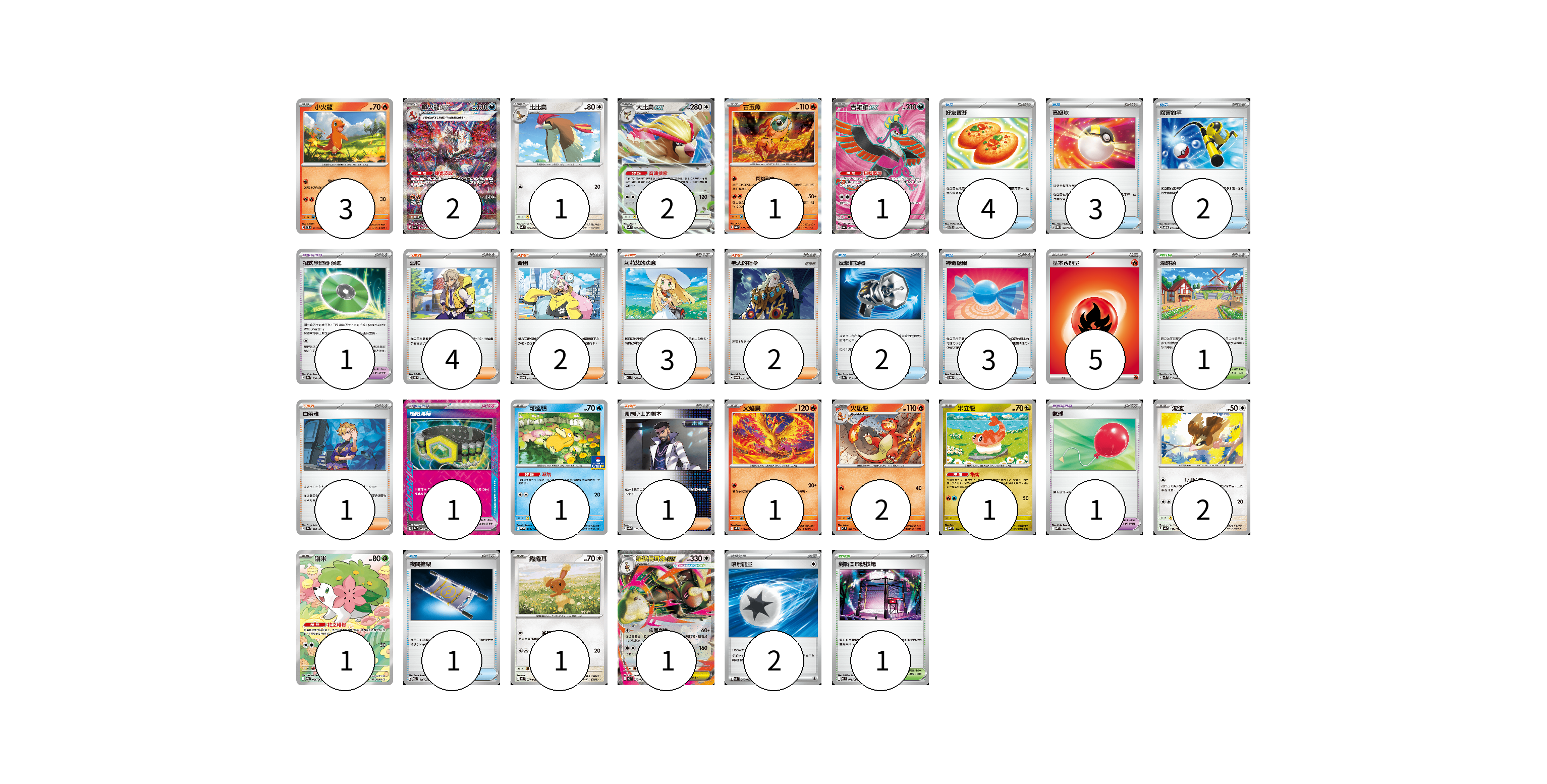 牌組構築方案 以此牌組為基礎新構築牌組 顯示卡面 顯示列表 寶可夢卡(20) 3 2 1 2 1 1 1 1 2 1 2 1 1 1 寶可夢道具(3) 1 1 1 物品卡(15) 4 3 2 2 3 1 支援者卡(13) 4 2 3 2 1 1 競技場卡(2) 1 1 能量卡(7) 5 2 寶可夢卡(20) 卡牌名稱 張數 卡牌名稱 張數 小火龍 SVTL 001/021 03 噴火龍ex SV4a 349/190 02 比比鳥 SVK 004/042 01 大比鳥ex SVK 005/042 02 古玉魚 SV8a 025/187 01 吉雉雞ex SV6a 081/064 01 可達鴨 SV-P 220/SV-P 01 火焰鳥 M2 014/080 01 火恐龍 M2 012/080 02 米立龍 MBD 010/022 01 波波 SV4a 137/190 02 謝米 SV9a 066/063 01 捲捲耳 M2 071/080 01 超級長耳兔ex M2 072/080 01 寶可夢道具(3) 卡牌名稱 張數 卡牌名稱 張數 招式學習器 演進 SV8a 160/187 01 極限腰帶 SV8a 159/187 01 氣球 MBD 018/022 01 物品卡(15) 卡牌名稱 張數 卡牌名稱 張數 好友寶芬 SVTS 012/022 04 高級球 SVQL 015/022 03 厲害釣竿 SVOD 010/020 02 反擊捕捉器 SV8a 139/187 02 神奇糖果 SVOD 013/020 03 夜間擔架 MBD 016/022 01 支援者卡(13) 卡牌名稱 張數 卡牌名稱 張數 派帕 SVOD 018/020 04 奇樹 SVOD 016/020 02 莉莉艾的決意 M1L 062/063 03 老大的指令 SVOM 020/021 02 白蕾雅 SV8a 176/187 01 弗圖博士的劇本 SV8a 175/187 01 競技場卡(2) 卡牌名稱 張數 卡牌名稱 張數 深缽鎮 SVK 039/042 01 對戰圓形競技場 M2 079/080 01 能量卡(7) 卡牌名稱 張數 卡牌名稱 張數 基本火能量 sv-p FIR 05 噴射能量 SVK 040/042 02 以此牌組為基礎新構築牌組 牌組編碼 aODdPe-VuKZmB-PgNDYQ copy 列印牌組單 牌組編碼已複製 分享至SNS
