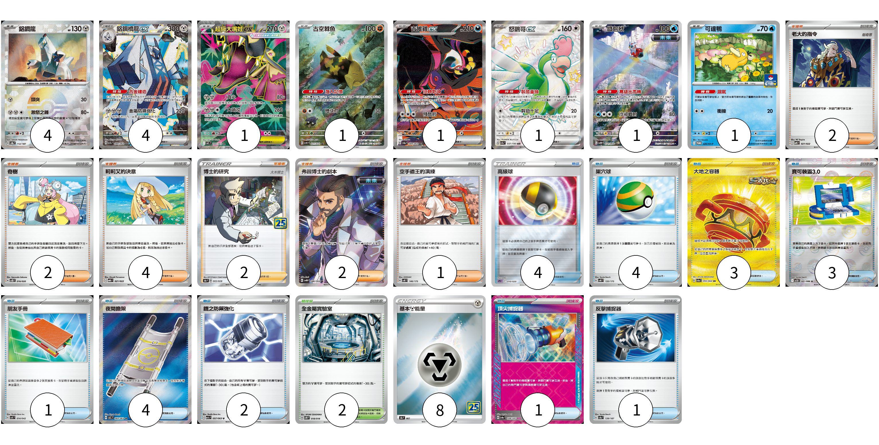 牌組構築方案 以此牌組為基礎新構築牌組 顯示卡面 顯示列表 寶可夢卡(14) 4 4 1 1 1 1 1 1 物品卡(23) 4 4 3 3 1 4 2 1 1 支援者卡(13) 2 2 4 2 2 1 競技場卡(2) 2 能量卡(8) 8 寶可夢卡(14) 卡牌名稱 張數 卡牌名稱 張數 鋁鋼龍 SV8a 112/187 04 鋁鋼橋龍ex SV7a 088/064 04 超級大嘴娃ex M1L 080/063 01 古空棘魚 SV5K 077/071 01 吉雉雞ex SV6a 089/064 01 怒鸚哥ex SV4a 337/190 01 鐵包袱 SV4M 071/066 01 可達鴨 SV-P 220/SV-P 01 物品卡(23) 卡牌名稱 張數 卡牌名稱 張數 高級球 SPD 010/020 04 巢穴球 SVM 133/175 04 大地之容器 SV6a 093/064 03 寶可裝置3.0 SV11B 081/086 03 朋友手冊 SVK 014/042 01 夜間擔架 M1L 083/063 04 鐵之防禦強化 M1L 057/063 02 頂尖捕捉器 SV8a 148/187 01 反擊捕捉器 SV8a 139/187 01 支援者卡(13) 卡牌名稱 張數 卡牌名稱 張數 老大的指令 MBG 021/022 02 奇樹 SVOD 016/020 02 莉莉艾的決意 MBD 021/022 04 博士的研究(大木博士) S8a 003/028 02 弗圖博士的劇本 SV4M 086/066 02 空手道王的演練 SVM 146/175 01 競技場卡(2) 卡牌名稱 張數 卡牌名稱 張數 全金屬實驗室 SVTH 018/018 02 能量卡(8) 卡牌名稱 張數 卡牌名稱 張數 基本鋼能量 S8a MET 08 以此牌組為基礎新構築牌組 牌組編碼 aQgUnJ-LddfmV-KPqPNE copy 列印牌組單 牌組編碼已複製 分享至SNS