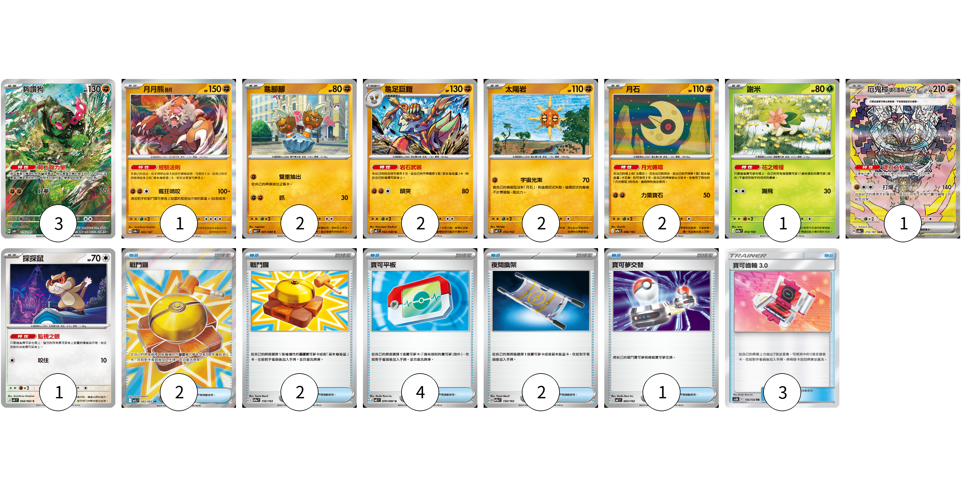 牌組構築方案 以此牌組為基礎新構築牌組 顯示卡面 顯示列表 寶可夢卡(15) 3 1 2 2 2 2 1 1 1 物品卡(14) 2 2 4 2 1 3 寶可夢卡(15) 卡牌名稱 張數 卡牌名稱 張數 夠讚狗 SV6 110/101 03 月月熊 赫月 SV8a 085/187 01 龜腳腳 M3 041/080 02 龜足巨鎧 M3 042/080 02 太陽岩 MC 372/742 02 月石 M2a 086/193 02 謝米 M2a 012/193 01 厄鬼椪 礎石面具ex SV8a 216/187 01 探探鼠 M4 068/083 01 物品卡(14) 卡牌名稱 張數 卡牌名稱 張數 戰鬥鑼 M1L 082/063 02 戰鬥鑼 M2a 155/193 02 寶可平板 M3 070/080 04 夜間擔架 M2a 159/193 02 寶可夢交替 MC 663/742 01 寶可齒輪3.0 AS6b 190/194 03 以此牌組為基礎新構築牌組 牌組編碼 aRZjKl-xhBbcc-tlGYaL copy 列印牌組單 牌組編碼已複製 分享至SNS
