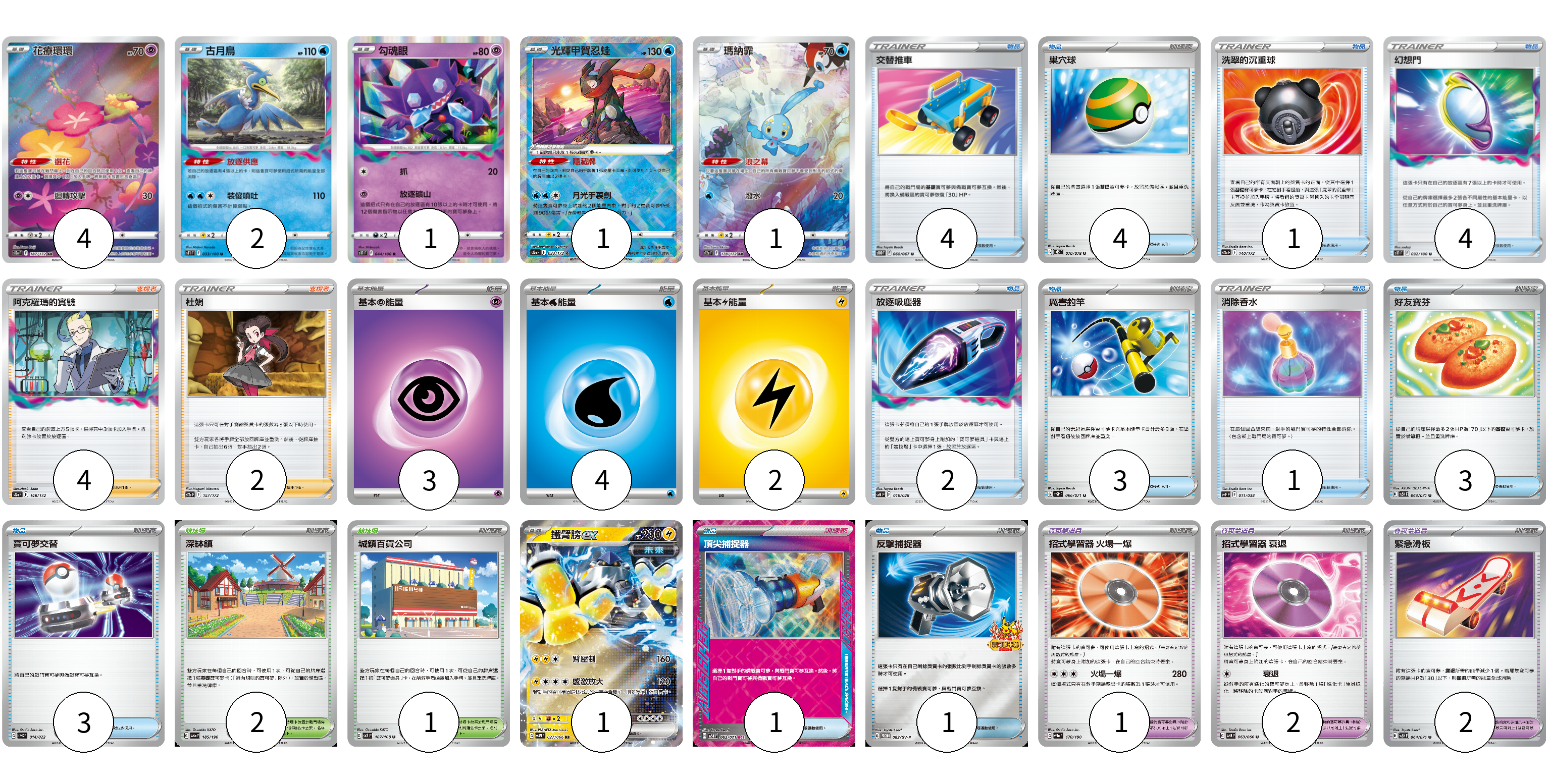 牌組構築方案 以此牌組為基礎新構築牌組 顯示卡面 顯示列表 寶可夢卡(10) 4 2 1 1 1 1 寶可夢道具(5) 1 2 2 物品卡(27) 4 4 1 4 2 3 1 3 3 1 1 支援者卡(6) 4 2 競技場卡(3) 2 1 能量卡(9) 3 4 2 寶可夢卡(10) 卡牌名稱 張數 卡牌名稱 張數 花療環環 S12a 187/172 04 古月鳥 S11 033/100 02 勾魂眼 S11 044/100 01 光輝甲賀忍蛙 S12a 033/172 01 瑪納霏 S12a 178/172 01 鐵臂膀ex SV4M 027/066 01 寶可夢道具(5) 卡牌名稱 張數 卡牌名稱 張數 招式學習器 火場一爆 SV4a 170/190 01 招式學習器 衰退 SV4K 063/066 02 緊急滑板 SV5K 064/071 02 物品卡(27) 卡牌名稱 張數 卡牌名稱 張數 交替推車 S10D 060/067 04 巢穴球 SV1S 070/078 04 洗翠的沉重球 S12a 140/172 01 幻想門 S11 092/100 04 放逐吸塵器 SVB 016/028 02 厲害釣竿 SV2P 066/071 03 消除香水 SVF 011/038 01 好友寶芬 SV5K 063/071 03 寶可夢交替 SVHK 014/022 03 頂尖捕捉器 SV5M 062/071 01 反擊捕捉器 SV-P 083/SV-P 01 支援者卡(6) 卡牌名稱 張數 卡牌名稱 張數 阿克羅瑪的實驗 S12a 148/172 04 杜娟 S12a 157/172 02 競技場卡(3) 卡牌名稱 張數 卡牌名稱 張數 深缽鎮 SV4a 185/190 02 城鎮百貨公司 SV3 107/108 01 能量卡(9) 卡牌名稱 張數 卡牌名稱 張數 基本超能量 sv-p PSY 03 基本水能量 sv-p WAT 04 基本【雷】能量 SVB LIG 02 以此牌組為基礎新構築牌組 牌組編碼 aRrACH-OtjoKq-wPPsbI copy 列印牌組單 牌組編碼已複製 分享至SNS