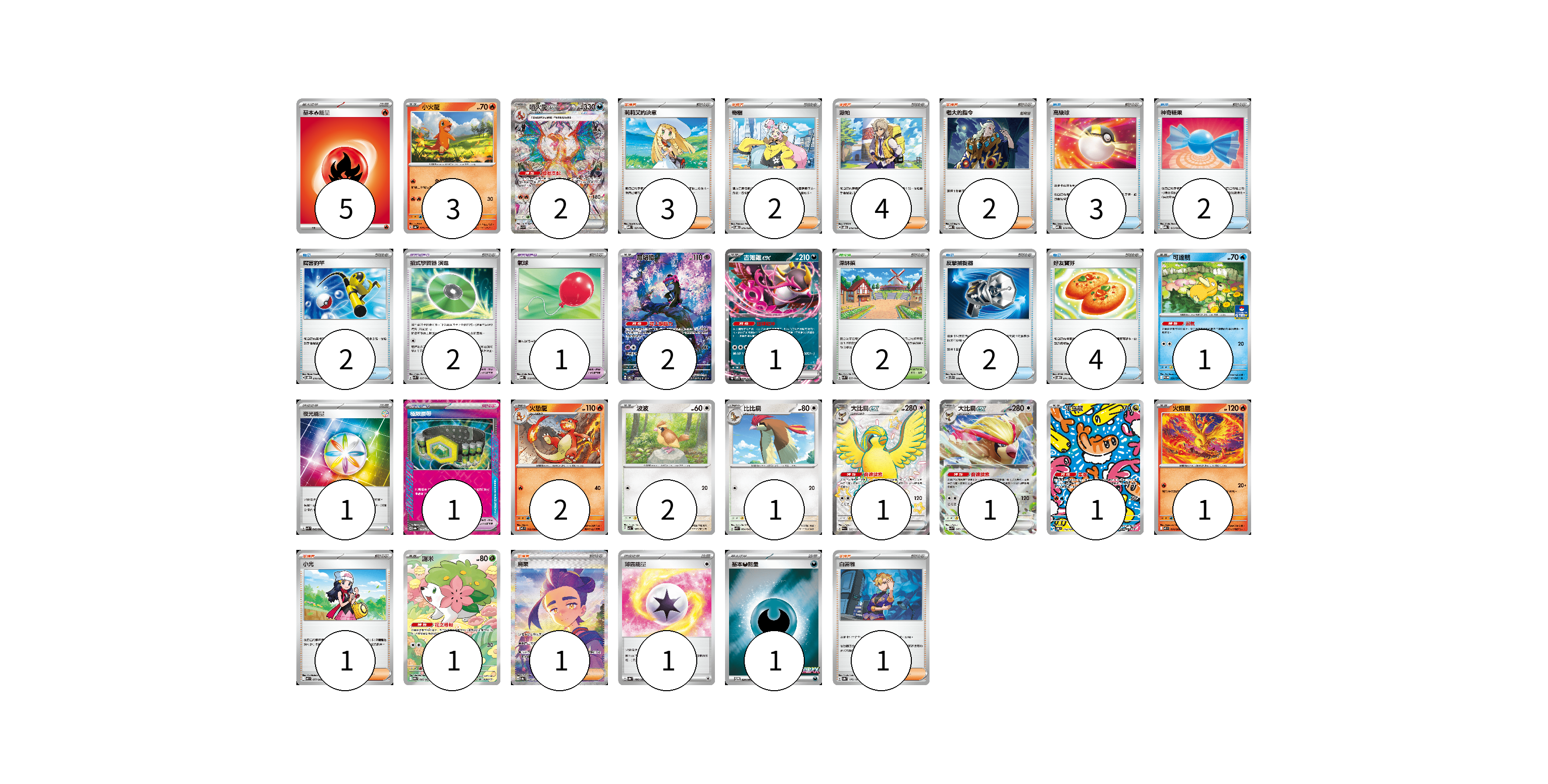 牌組構築方案 以此牌組為基礎新構築牌組 顯示卡面 顯示列表 寶可夢卡(19) 3 2 2 1 1 2 2 1 1 1 1 1 1 寶可夢道具(4) 2 1 1 物品卡(13) 3 2 2 2 4 支援者卡(14) 3 2 4 2 1 1 1 競技場卡(2) 2 能量卡(8) 5 1 1 1 寶可夢卡(19) 卡牌名稱 張數 卡牌名稱 張數 小火龍 SV4a 025/190 03 噴火龍ex SV3 134/108 02 願增猿 SV6 107/101 02 吉雉雞ex SVOM 009/021 01 可達鴨 SV-P 220/SV-P 01 火恐龍 M2 012/080 02 波波 SV3 087/108 02 比比鳥 SVK 004/042 01 大比鳥ex SV4a 335/190 01 大比鳥ex SV3 089/108 01 米立龍 SV6 112/101 01 火焰鳥 M2 014/080 01 謝米 SV9a 066/063 01 寶可夢道具(4) 卡牌名稱 張數 卡牌名稱 張數 招式學習器 演進 SVK 025/042 02 氣球 MBD 018/022 01 極限腰帶 SV8a 159/187 01 物品卡(13) 卡牌名稱 張數 卡牌名稱 張數 高級球 MBD 014/022 03 神奇糖果 MBG 013/022 02 厲害釣竿 SVOD 010/020 02 反擊捕捉器 SVTS 009/022 02 好友寶芬 SVOD 011/020 04 支援者卡(14) 卡牌名稱 張數 卡牌名稱 張數 莉莉艾的決意 MBD 021/022 03 奇樹 SVOD 016/020 02 派帕 SVOD 018/020 04 老大的指令 MBD 020/022 02 小光 M2 077/080 01 烏栗 SV8a 230/187 01 白蕾雅 SV8a 176/187 01 競技場卡(2) 卡牌名稱 張數 卡牌名稱 張數 深缽鎮 SVK 039/042 02 能量卡(8) 卡牌名稱 張數 卡牌名稱 張數 基本火能量 sv-p FIR 05 夜光能量 SVK 042/042 01 薄霧能量 SV8a 186/187 01 基本【惡】能量 M-P 034/M-P 01 以此牌組為基礎新構築牌組 牌組編碼 aSiBtt-vFztZf-NtxRrg copy 列印牌組單 牌組編碼已複製 分享至SNS