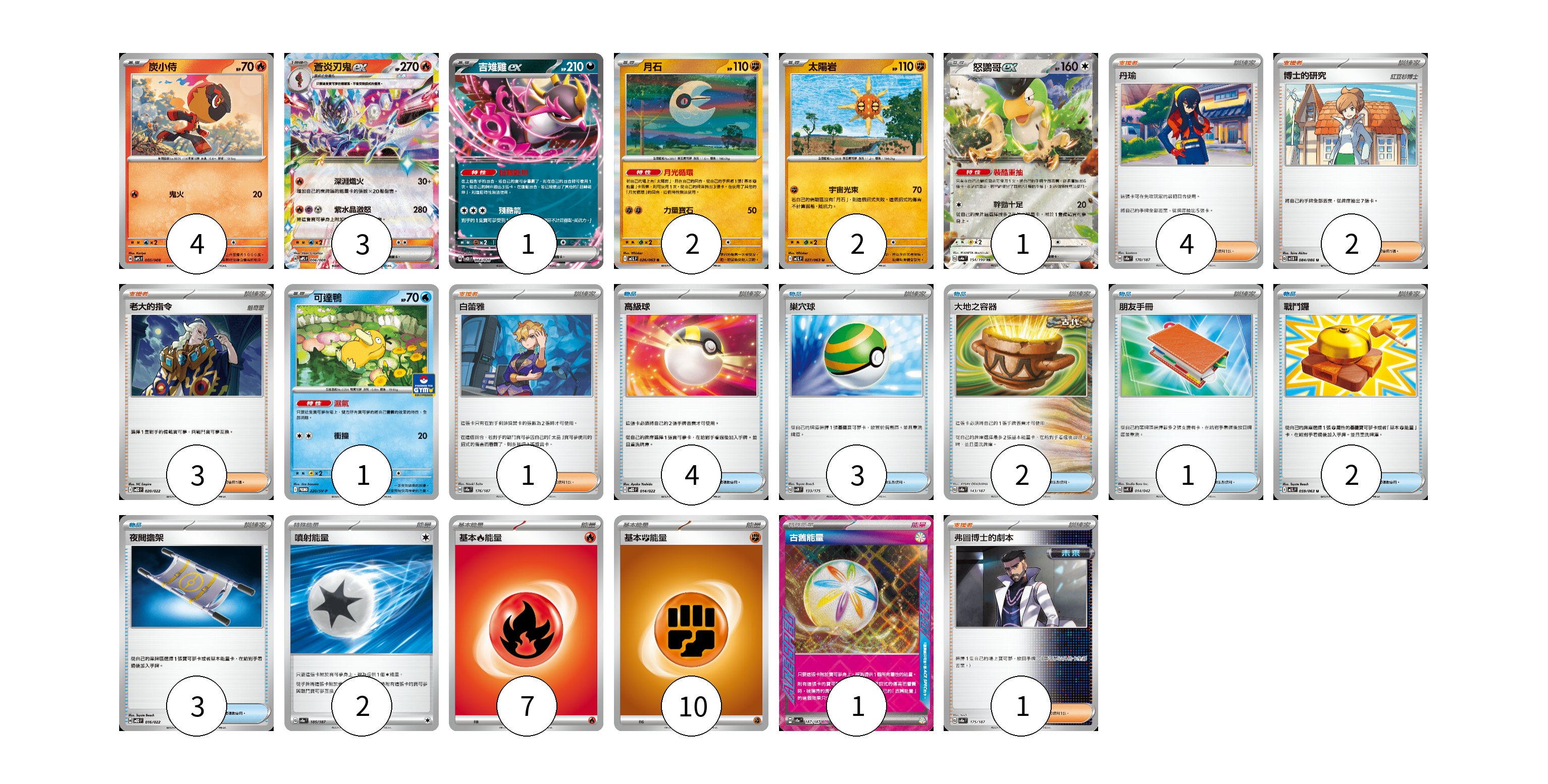 牌組構築方案 以此牌組為基礎新構築牌組 顯示卡面 顯示列表 寶可夢卡(14) 4 3 1 2 2 1 1 物品卡(15) 4 3 2 1 2 3 支援者卡(11) 4 2 3 1 1 能量卡(20) 2 7 10 1 寶可夢卡(14) 卡牌名稱 張數 卡牌名稱 張數 炭小侍 SVPS 005/008 04 蒼炎刃鬼ex SVPS 006/008 03 吉雉雞ex SVOD 004/020 01 月石 M1L 026/063 02 太陽岩 M1L 027/063 02 怒鸚哥ex SV4a 154/190 01 可達鴨 SV-P 220/SV-P 01 物品卡(15) 卡牌名稱 張數 卡牌名稱 張數 高級球 MBD 014/022 04 巢穴球 SVM 133/175 03 大地之容器 SV8a 143/187 02 朋友手冊 SVK 014/042 01 戰鬥鑼 M1L 059/063 02 夜間擔架 MBD 016/022 03 支援者卡(11) 卡牌名稱 張數 卡牌名稱 張數 丹瑜 SV8a 170/187 04 博士的研究 SV11B 084/086 02 老大的指令 MBD 020/022 03 白蕾雅 SV8a 176/187 01 弗圖博士的劇本 SV8a 175/187 01 能量卡(20) 卡牌名稱 張數 卡牌名稱 張數 噴射能量 SV8a 185/187 02 基本火能量 sv-p FIR 07 基本鬥能量 sv-p FIG 10 古舊能量 SV8a 187/187 01 以此牌組為基礎新構築牌組 牌組編碼 aTEyYd-kKkxeJ-RiJmst copy 列印牌組單 牌組編碼已複製 分享至SNS