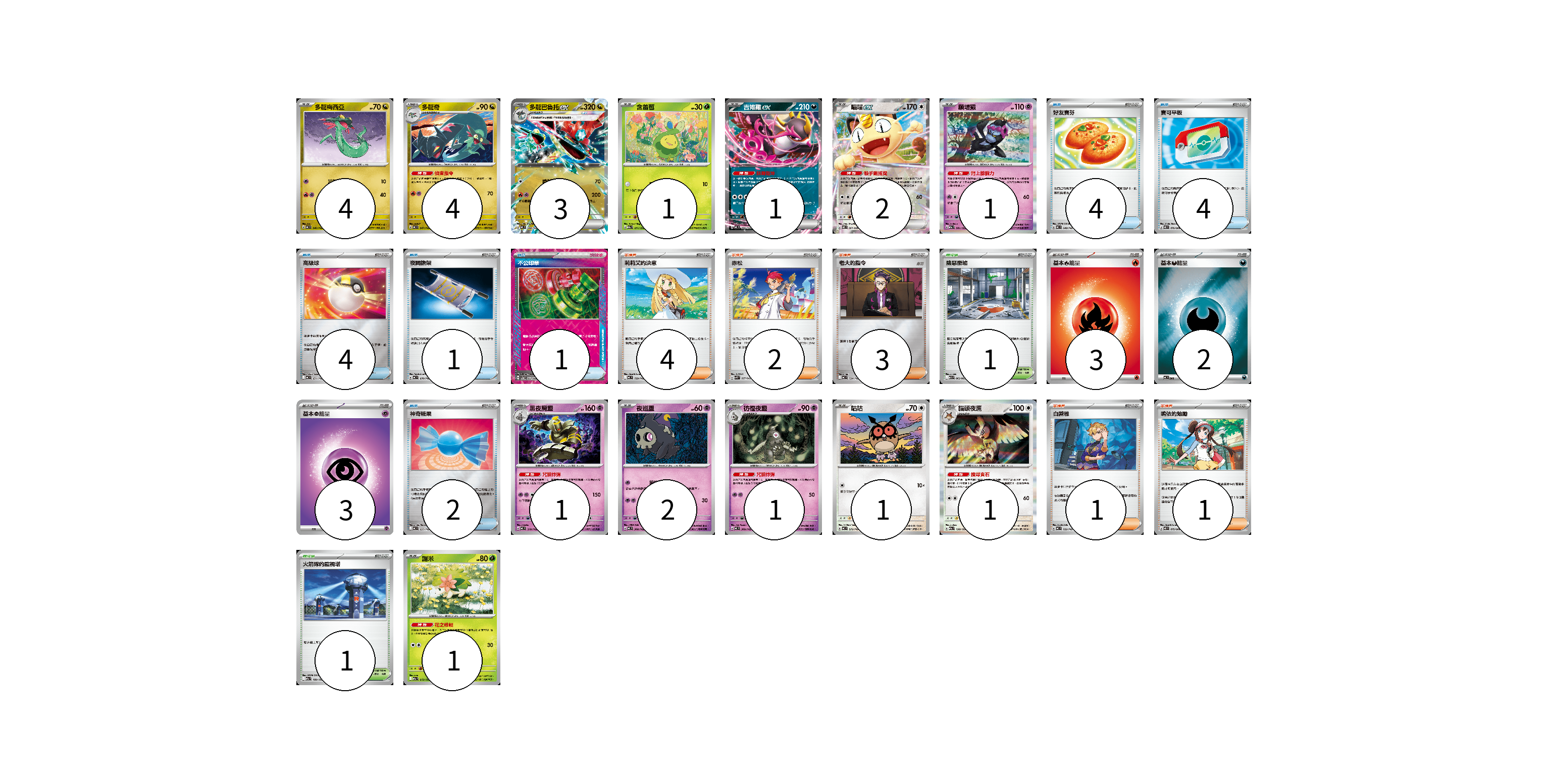 牌組構築方案 以此牌組為基礎新構築牌組 顯示卡面 顯示列表 寶可夢卡(23) 4 4 3 1 1 2 1 1 2 1 1 1 1 物品卡(16) 4 4 4 1 1 2 支援者卡(11) 4 2 3 1 1 競技場卡(2) 1 1 能量卡(8) 3 2 3 寶可夢卡(23) 卡牌名稱 張數 卡牌名稱 張數 多龍梅西亞 MC 546/742 04 多龍奇 MC 547/742 04 多龍巴魯托ex MC 548/742 03 含羞苞 M2a 011/193 01 吉雉雞ex MC 489/742 01 喵喵ex M3 061/080 02 願增猿 M2a 081/193 01 黑夜魔靈 MC 310/742 01 夜巡靈 MC 308/742 02 彷徨夜靈 MC 309/742 01 咕咕 MC 572/742 01 貓頭夜鷹 M2a 138/193 01 謝米 M2a 012/193 01 物品卡(16) 卡牌名稱 張數 卡牌名稱 張數 好友寶芬 MC 648/742 04 寶可平板 M3 070/080 04 高級球 MC 651/742 04 夜間擔架 MC 670/742 01 不公印章 SV5a 053/066 01 神奇糖果 MC 655/742 02 支援者卡(11) 卡牌名稱 張數 卡牌名稱 張數 莉莉艾的決意 MC 729/742 04 赤松 SVK 027/042 02 老大的指令 MC 724/742 03 白蕾雅 MC 722/742 01 鳴依的勉勵 M3 075/080 01 競技場卡(2) 卡牌名稱 張數 卡牌名稱 張數 險惡廢墟 M1L 063/063 01 火箭隊的監視塔 M2a 189/193 01 能量卡(8) 卡牌名稱 張數 卡牌名稱 張數 基本【火】能量 MC FIR 03 基本【惡】能量 MC DAR 02 基本【超】能量 M-P PSY 03 以此牌組為基礎新構築牌組 牌組編碼 aWjtuz-Elzkma-tAJOLk copy 列印牌組單 牌組編碼已複製 分享至SNS