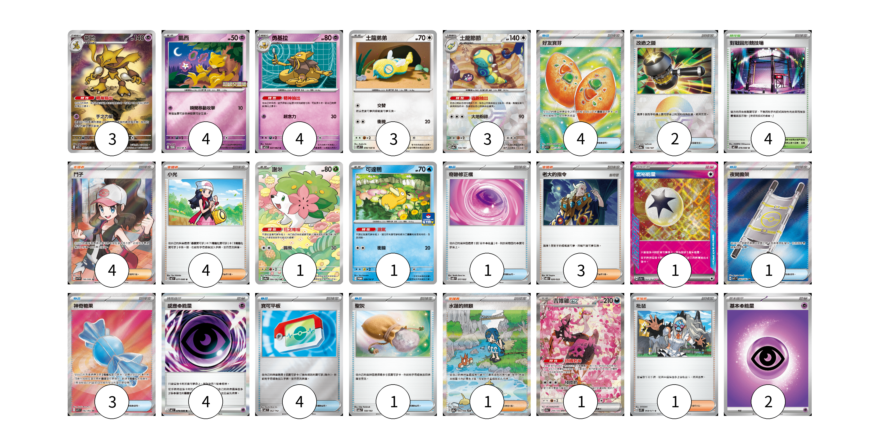 牌組構築方案 以此牌組為基礎新構築牌組 顯示卡面 顯示列表 寶可夢卡(20) 3 4 4 3 3 1 1 1 物品卡(16) 4 2 1 1 3 4 1 支援者卡(13) 4 4 3 1 1 競技場卡(4) 4 能量卡(7) 1 4 2 寶可夢卡(20) 卡牌名稱 張數 卡牌名稱 張數 胡地 M1S 071/063 03 凱西 M-P 004/M-P 04 勇基拉 M1S 037/063 04 土龍弟弟 SV9 078/100 03 土龍節節 SV8a 130/187 03 謝米 SV9a 066/063 01 可達鴨 SV-P 220/SV-P 01 吉雉雞ex M2a 244/193 01 物品卡(16) 卡牌名稱 張數 卡牌名稱 張數 好友寶芬 M1S 081/063 04 改造之錘 SV8a 138/187 02 奇跡修正檔 MBD 017/022 01 夜間擔架 M1L 083/063 01 神奇糖果 M1S 082/063 03 寶可平板 MC 662/742 04 聖灰 M2a 150/193 01 支援者卡(13) 卡牌名稱 張數 卡牌名稱 張數 鬥子 SV11W 166/086 04 小光 M2 077/080 04 老大的指令 MBD 020/022 03 水蓮的照顧 SV5a 093/066 01 枇琶 SV5K 068/071 01 競技場卡(4) 卡牌名稱 張數 卡牌名稱 張數 對戰圓形競技場 M2 079/080 04 能量卡(7) 卡牌名稱 張數 卡牌名稱 張數 富裕能量 SV7a 064/064 01 感應【超】能量 M3 079/080 04 基本【超】能量 MC PSY 02 以此牌組為基礎新構築牌組 牌組編碼 aYpjfv-MFUgOi-ywjbhl copy 列印牌組單 牌組編碼已複製 分享至SNS