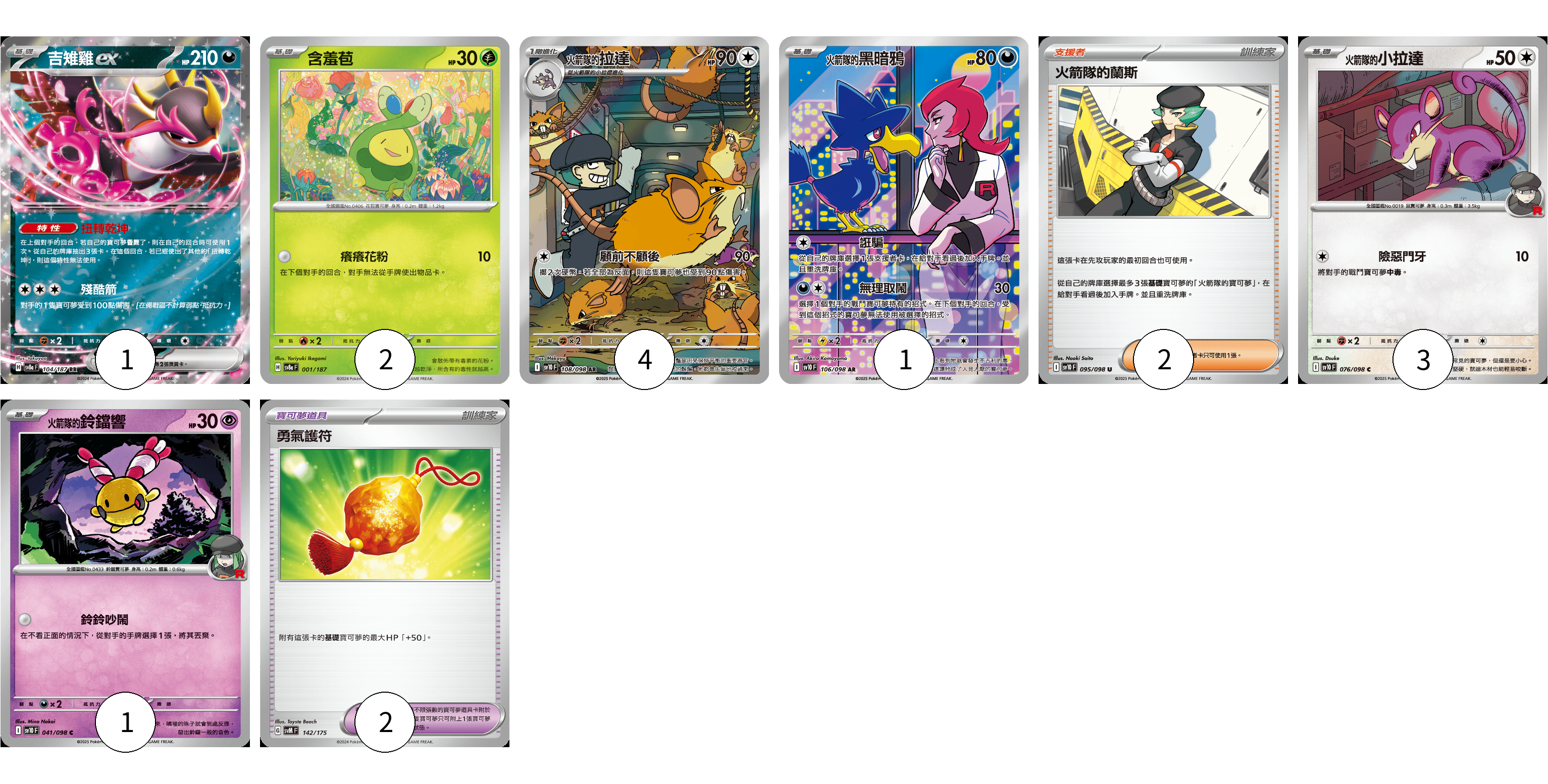 牌組構築方案 以此牌組為基礎新構築牌組 顯示卡面 顯示列表 寶可夢卡(12) 1 2 4 1 3 1 寶可夢道具(2) 2 支援者卡(2) 2 寶可夢卡(12) 卡牌名稱 張數 卡牌名稱 張數 吉雉雞ex SV8a 104/187 01 含羞苞 SV8a 001/187 02 <火箭隊的>拉達 SV10 108/098 04 <火箭隊的>黑暗鴉 SV10 106/098 01 <火箭隊的>小拉達 SV10 076/098 03 <火箭隊的>鈴鐺響 SV10 041/098 01 寶可夢道具(2) 卡牌名稱 張數 卡牌名稱 張數 勇氣護符 SVM 142/175 02 支援者卡(2) 卡牌名稱 張數 卡牌名稱 張數 火箭隊的蘭斯 SV10 095/098 02 以此牌組為基礎新構築牌組 牌組編碼 aaiWfX-hNoFNE-KANWYp copy 列印牌組單 牌組編碼已複製 分享至SNS
