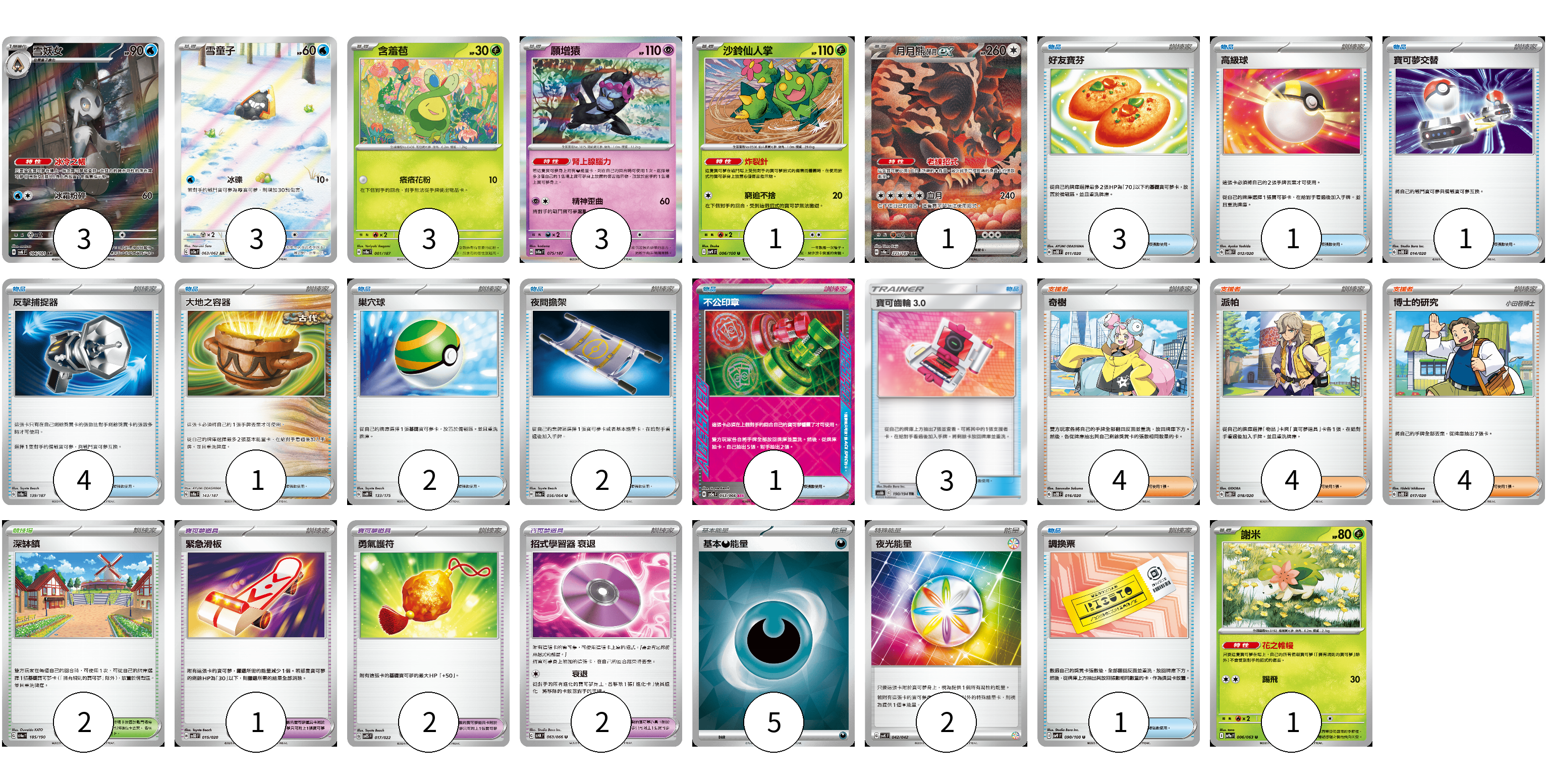 牌組構築方案 以此牌組為基礎新構築牌組 顯示卡面 顯示列表 寶可夢卡(15) 3 3 3 3 1 1 1 寶可夢道具(5) 1 2 2 物品卡(19) 3 1 1 4 1 2 2 1 3 1 支援者卡(12) 4 4 4 競技場卡(2) 2 能量卡(7) 5 2 寶可夢卡(15) 卡牌名稱 張數 卡牌名稱 張數 雪妖女 SV6 104/101 03 雪童子 SV3a 063/062 03 含羞苞 SV8a 001/187 03 願增猿 SV8a 075/187 03 沙鈴仙人掌 SV9 006/100 01 月月熊 赫月ex SV8a 225/187 01 謝米 SV9a 006/063 01 寶可夢道具(5) 卡牌名稱 張數 卡牌名稱 張數 緊急滑板 SVOD 015/020 01 勇氣護符 SVTS 017/022 02 招式學習器 衰退 SV4K 063/066 02 物品卡(19) 卡牌名稱 張數 卡牌名稱 張數 好友寶芬 SVOD 011/020 03 高級球 SVOD 012/020 01 寶可夢交替 SVOD 014/020 01 反擊捕捉器 SV8a 139/187 04 大地之容器 SV8a 143/187 01 巢穴球 SVM 133/175 02 夜間擔架 SV6a 056/064 02 不公印章 SV5a 053/066 01 寶可齒輪3.0 AS6b 190/194 03 調換票 SV9 090/100 01 支援者卡(12) 卡牌名稱 張數 卡牌名稱 張數 奇樹 SVOD 016/020 04 派帕 SVOD 018/020 04 博士的研究 SVOD 017/020 04 競技場卡(2) 卡牌名稱 張數 卡牌名稱 張數 深缽鎮 SV4a 185/190 02 能量卡(7) 卡牌名稱 張數 卡牌名稱 張數 基本【惡】能量 SVOM DAR 05 夜光能量 SVK 042/042 02 以此牌組為基礎新構築牌組 牌組編碼 abZqUz-NlnHTd-dRjZlL copy 列印牌組單 牌組編碼已複製 分享至SNS