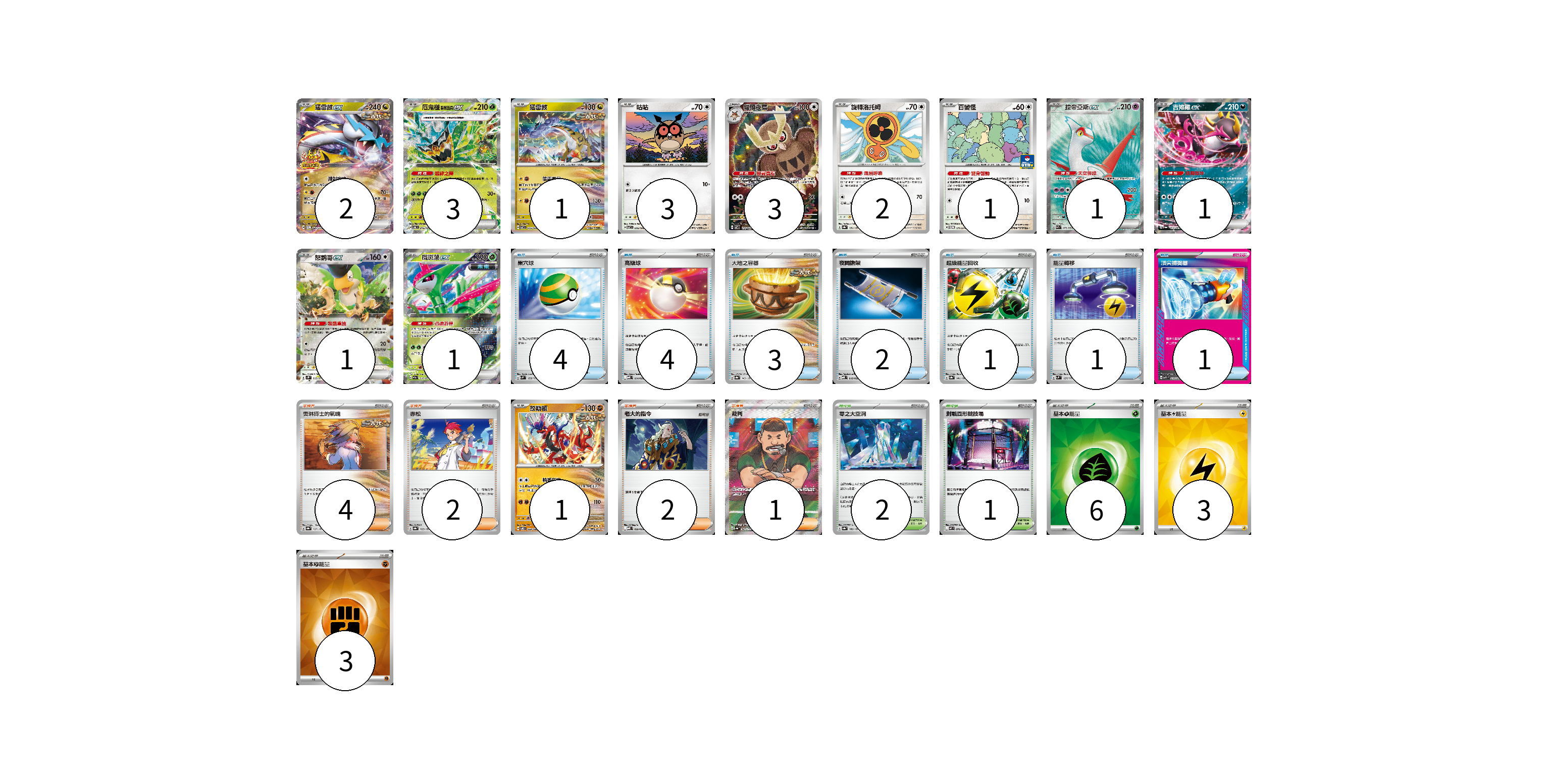 牌組構築方案 以此牌組為基礎新構築牌組 顯示卡面 顯示列表 寶可夢卡(20) 2 3 1 3 3 2 1 1 1 1 1 1 物品卡(16) 4 4 3 2 1 1 1 支援者卡(9) 4 2 2 1 競技場卡(3) 2 1 能量卡(12) 6 3 3 寶可夢卡(20) 卡牌名稱 張數 卡牌名稱 張數 猛雷鼓ex SV-P 081/SV-P 02 厄鬼椪 碧草面具ex SV6 016/101 03 猛雷鼓 SV7 075/102 01 咕咕 SV7 076/102 03 貓頭夜鷹 SV7 114/102 03 旋轉洛托姆 SV8a 131/187 02 百變怪 SV-P 111/SV-P 01 拉帝亞斯ex SV7a 078/064 01 吉雉雞ex SV6a 038/064 01 怒鸚哥ex SV2P 065/071 01 鐵斑葉ex SV5M 016/071 01 故勒頓 SV8 069/106 01 物品卡(16) 卡牌名稱 張數 卡牌名稱 張數 巢穴球 SVM 133/175 04 高級球 MBD 014/022 04 大地之容器 SV8a 143/187 03 夜間擔架 MBD 016/022 02 超級能量回收 SV8a 141/187 01 能量轉移 SVM 127/175 01 頂尖捕捉器 MBG 014/022 01 支援者卡(9) 卡牌名稱 張數 卡牌名稱 張數 奧琳博士的氣魄 SV8a 167/187 04 赤松 SV8a 163/187 02 老大的指令 MBD 020/022 02 裁判 SV4a 342/190 01 競技場卡(3) 卡牌名稱 張數 卡牌名稱 張數 零之大空洞 SV8a 182/187 02 對戰圓形競技場 M2 079/080 01 能量卡(12) 卡牌名稱 張數 卡牌名稱 張數 基本【草】能量 SVM GRA 06 基本【雷】能量 SVQP LIG 03 基本【鬥】能量 SVM FIG 03 以此牌組為基礎新構築牌組 牌組編碼 aeLdpq-VLeqav-BdjBlj copy 列印牌組單 牌組編碼已複製 分享至SNS