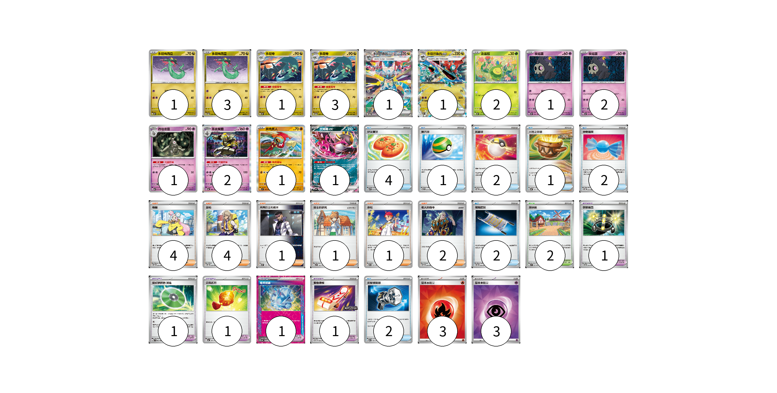 牌組構築方案 以此牌組為基礎新構築牌組 顯示卡面 顯示列表 寶可夢卡(20) 1 3 1 3 1 1 2 1 2 1 2 1 1 寶可夢道具(5) 1 1 1 1 1 物品卡(14) 4 1 2 1 2 2 2 支援者卡(13) 4 4 1 1 1 2 競技場卡(2) 2 能量卡(6) 3 3 寶可夢卡(20) 卡牌名稱 張數 卡牌名稱 張數 多龍梅西亞 SV8a 118/187 01 多龍梅西亞 SV6 079/101 03 多龍奇 SV8a 119/187 01 多龍奇 SV6 080/101 03 多龍巴魯托ex SV8a 221/187 01 多龍巴魯托ex SV8a 120/187 01 含羞苞 SV8a 001/187 02 夜巡靈 SV8a 064/187 01 夜巡靈 SV6a 018/064 02 彷徨夜靈 SV6a 019/064 01 黑夜魔靈 SV8a 066/187 02 摔角鷹人 SV1S 045/078 01 吉雉雞ex SV8a 104/187 01 寶可夢道具(5) 卡牌名稱 張數 卡牌名稱 張數 學習裝置 SVTM 016/022 01 招式學習器 演進 SV4M 063/066 01 勇氣護符 SV4a 169/190 01 璀璨結晶 SV8a 152/187 01 緊急滑板 SV-P 140/SV-P 01 物品卡(14) 卡牌名稱 張數 卡牌名稱 張數 好友寶芬 SV5K 063/071 04 巢穴球 SVTS 013/022 01 高級球 SVOD 012/020 02 大地之容器 SV8a 143/187 01 神奇糖果 SVOD 013/020 02 夜間擔架 SVOM 016/021 02 反擊捕捉器 SV8a 139/187 02 支援者卡(13) 卡牌名稱 張數 卡牌名稱 張數 奇樹 SVOD 016/020 04 派帕 SVOD 018/020 04 弗圖博士的劇本 SV8a 175/187 01 博士的研究 SVM 166/175 01 赤松 SV8a 163/187 01 老大的指令 SVOD 019/020 02 競技場卡(2) 卡牌名稱 張數 卡牌名稱 張數 深缽鎮 SVK 039/042 02 能量卡(6) 卡牌名稱 張數 卡牌名稱 張數 基本【火】能量 SVK FIR 03 基本【超】能量 SVOD PSY 03 以此牌組為基礎新構築牌組 牌組編碼 aiMISy-cueJZt-PXjqQl copy 列印牌組單 牌組編碼已複製 分享至SNS
