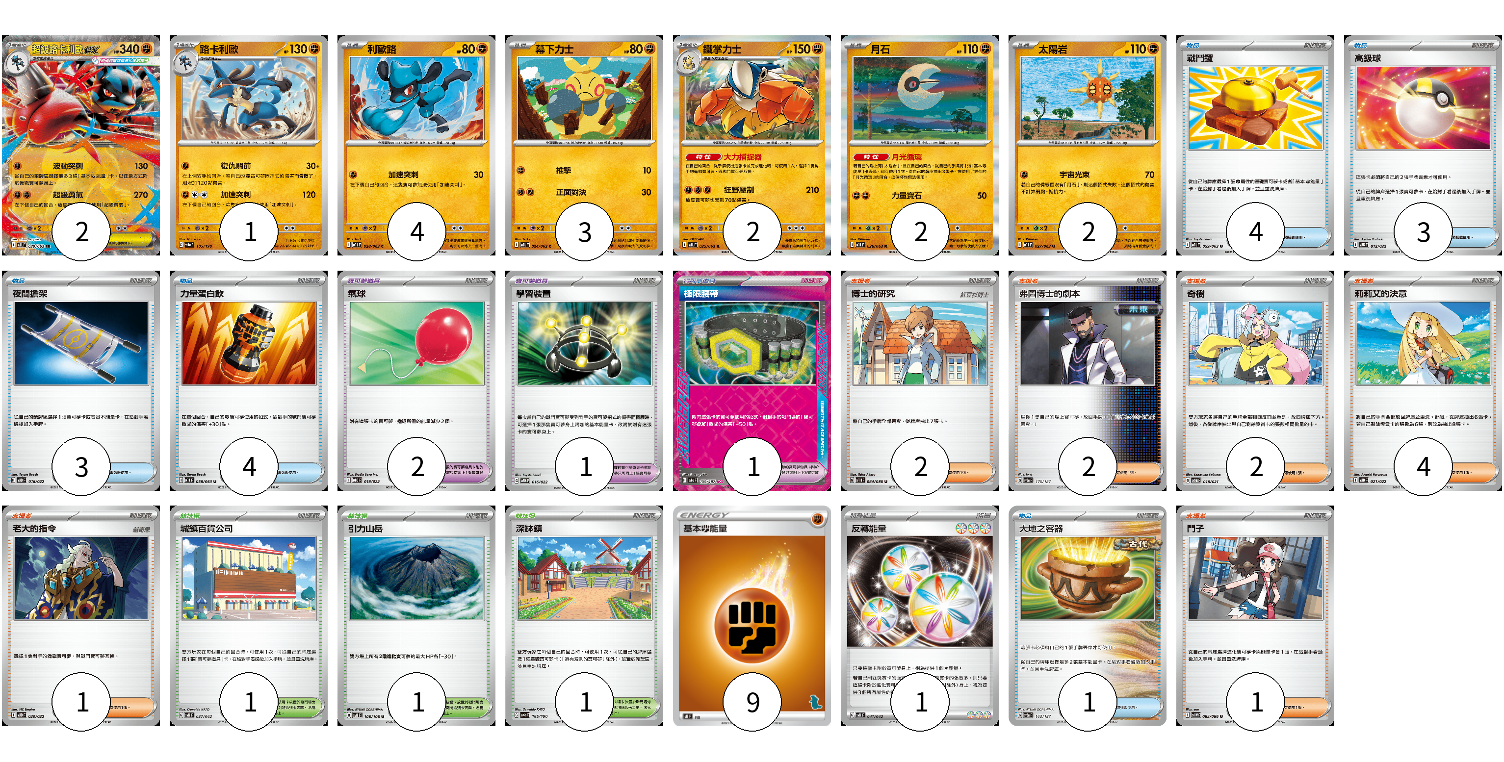 牌組構築方案 以此牌組為基礎新構築牌組 顯示卡面 顯示列表 寶可夢卡(16) 2 1 4 3 2 2 2 寶可夢道具(4) 2 1 1 物品卡(15) 4 3 3 4 1 支援者卡(12) 2 2 2 4 1 1 競技場卡(3) 1 1 1 能量卡(10) 9 1 寶可夢卡(16) 卡牌名稱 張數 卡牌名稱 張數 超級路卡利歐ex M1L 029/063 02 路卡利歐 SV4a 105/190 01 利歐路 M1L 028/063 04 幕下力士 M1L 024/063 03 鐵掌力士 M1L 025/063 02 月石 M1L 026/063 02 太陽岩 M1L 027/063 02 寶可夢道具(4) 卡牌名稱 張數 卡牌名稱 張數 氣球 MBD 018/022 02 學習裝置 SVTM 016/022 01 極限腰帶 SV8a 159/187 01 物品卡(15) 卡牌名稱 張數 卡牌名稱 張數 戰鬥鑼 M1L 059/063 04 高級球 MBG 012/022 03 夜間擔架 MBD 016/022 03 力量蛋白飲 M1L 058/063 04 大地之容器 SV8a 143/187 01 支援者卡(12) 卡牌名稱 張數 卡牌名稱 張數 博士的研究 SV11B 084/086 02 弗圖博士的劇本 SV8a 175/187 02 奇樹 SVOM 018/021 02 莉莉艾的決意 MBD 021/022 04 老大的指令 MBD 020/022 01 鬥子 SV11W 085/086 01 競技場卡(3) 卡牌名稱 張數 卡牌名稱 張數 城鎮百貨公司 SVK 037/042 01 引力山岳 SV8 106/106 01 深缽鎮 SV4a 185/190 01 能量卡(10) 卡牌名稱 張數 卡牌名稱 張數 基本鬥能量 SH FIG 09 反轉能量 SVK 041/042 01 以此牌組為基礎新構築牌組 牌組編碼 ajTreY-JjrNsT-jiUieH copy 列印牌組單 牌組編碼已複製 分享至SNS