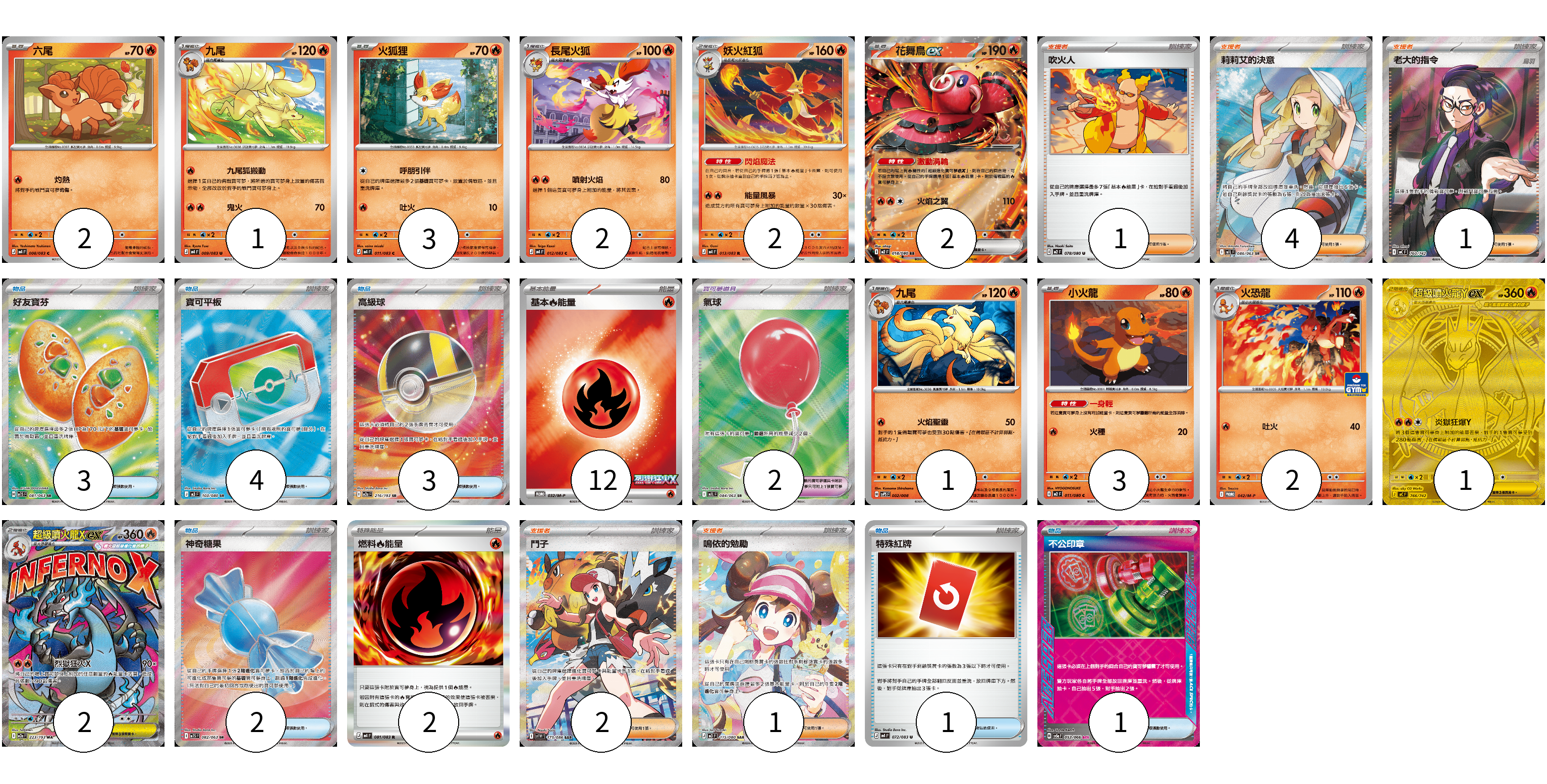 牌組構築方案 以此牌組為基礎新構築牌組 顯示卡面 顯示列表 寶可夢卡(21) 2 1 3 2 2 2 1 3 2 1 2 寶可夢道具(2) 2 物品卡(14) 3 4 3 2 1 1 支援者卡(9) 1 4 1 2 1 能量卡(14) 12 2 寶可夢卡(21) 卡牌名稱 張數 卡牌名稱 張數 六尾 M4 008/083 02 九尾 M4 009/083 01 火狐狸 M4 011/083 03 長尾火狐 M4 012/083 02 妖火紅狐 M4 013/083 02 花舞鳥ex M2 018/080 02 九尾 SVPS 002/008 01 小火龍 M2 011/080 03 火恐龍 M-P 042/M-P 02 超級噴火龍Yex MC 766/742 01 超級噴火龍Xex M2a 223/193 02 寶可夢道具(2) 卡牌名稱 張數 卡牌名稱 張數 氣球 M1L 084/063 02 物品卡(14) 卡牌名稱 張數 卡牌名稱 張數 好友寶芬 M1S 081/063 03 寶可平板 M3 103/080 04 高級球 M2a 216/193 03 神奇糖果 M1S 082/063 02 特殊紅牌 M4 072/083 01 不公印章 SV5a 053/066 01 支援者卡(9) 卡牌名稱 張數 卡牌名稱 張數 吹火人 M2 078/080 01 莉莉艾的決意 M1L 086/063 04 老大的指令(烏羽) MC 760/742 01 鬥子 SV11W 173/086 02 鳴依的勉勵 M3 115/080 01 能量卡(14) 卡牌名稱 張數 卡牌名稱 張數 基本【火】能量 M-P 032/M-P 12 燃料【火】能量 M4 081/083 02 以此牌組為基礎新構築牌組 牌組編碼 ajWiQm-jbtHyE-YGcZmE copy 列印牌組單 牌組編碼已複製 分享至SNS